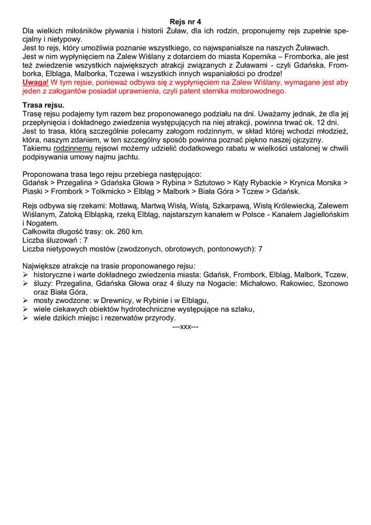 Rejs nr 4 Dla wielkich miłośników pływania i historii Żuław, dla ich rodzin, proponujemy rejs zupełnie specjalny i nietypowy. Jest to rejs, który umożliwia poznanie wszystkiego, co najwspanialsze na naszych Żuławach. Jest w nim wypłynięciem na Zalew Wiślany z dotarciem do miasta Kopernika – Fromborka, ale jest też zwiedzenie wszystkich największych atrakcji związanych z Żuławami - czyli Gdańska, Fromborka, Elbląga, Malborka, Tczewa i wszystkich innych wspaniałości po drodze! Uwaga! W tym rejsie, ponieważ odbywa się z wypłynięciem na Zalew Wiślany, wymagane jest aby jeden z załogantów posiadał uprawnienia, czyli patent sternika motorowodnego. Trasa rejsu. Trasę rejsu podajemy tym razem bez proponowanego podziału na dni. Uważamy jednak, że dla jej przepłynięcia i dokładnego zwiedzenia występujących na niej atrakcji, powinna trwać ok. 12 dni. Jest to trasa, którą szczególnie polecamy załogom rodzinnym, w skład której wchodzi młodzież, która, naszym zdaniem, w ten szczególny sposób powinna poznać piękno naszej ojczyzny. Takiemu rodzinnemu rejsowi możemy udzielić dodatkowego rabatu w wielkości ustalonej w chwili podpisywania umowy najmu jachtu. Proponowana trasa tego rejsu przebiega następująco: Gdańsk > Przegalina > Gdańska Głowa > Rybina > Sztutowo > Kąty Rybackie > Krynica Morska > Piaski > Frombork > Tolkmicko > Elbląg > Malbork > Biała Góra > Tczew > Gdańsk. Rejs odbywa się rzekami: Motławą, Martwą Wisłą, Wisłą, Szkarpawą, Wisłą Królewiecką, Zalewem Wiślanym, Zatoką Elbląską, rzeką Elbląg, najstarszym kanałem w Polsce - Kanałem Jagiellońskim i Nogatem. Całkowita długość trasy: ok. 260 km. Liczba śluzowań : 7 Liczba nietypowych mostów (zwodzonych, obrotowych, pontonowych): 7 Największe atrakcje na trasie proponowanego rejsu: historyczne i warte dokładnego zwiedzenia miasta: Gdańsk, Frombork, Elbląg, Malbork, Tczew, śluzy: Przegalina, Gdańska Głowa oraz 4 śluzy na Nogacie: Michałowo, Rakowiec, Szonowo oraz Biała Góra, mosty zwodzone: w Drewnicy, w Rybinie i w Elblągu, wiele ciekawych obiektów hydrotechniczne występujące na szlaku, wiele dzikich miejsc i rezerwatów przyrody. ---xxx---