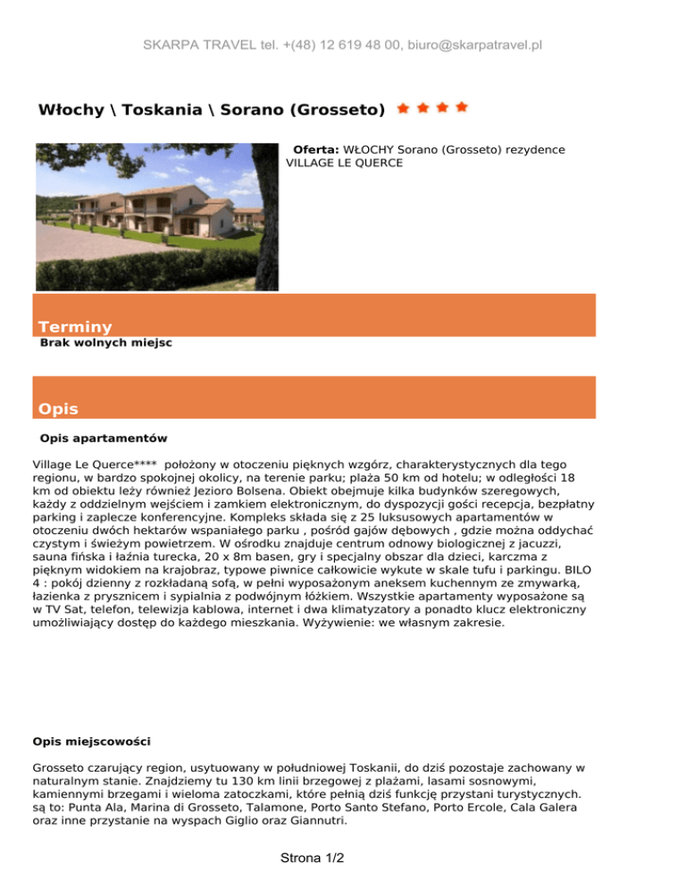 SKARPA TRAVEL tel. +(48) 12 619 48 00, [email protected] Włochy \ Toskania \ Sorano (Grosseto) Oferta: WŁOCHY Sorano (Grosseto) rezydence VILLAGE LE QUERCE Terminy Brak wolnych miejsc Opis Opis apartamentów Village Le Querce**** położony w otoczeniu pięknych wzgórz, charakterystycznych dla tego regionu, w bardzo spokojnej okolicy, na terenie parku; plaża 50 km od hotelu; w odległości 18 km od obiektu leży również Jezioro Bolsena. Obiekt obejmuje kilka budynków szeregowych, każdy z oddzielnym wejściem i zamkiem elektronicznym, do dyspozycji gości recepcja, bezpłatny parking i zaplecze konferencyjne. Kompleks składa się z 25 luksusowych apartamentów w otoczeniu dwóch hektarów wspaniałego parku , pośród gajów dębowych , gdzie można oddychać czystym i świeżym powietrzem. W ośrodku znajduje centrum odnowy biologicznej z jacuzzi, sauna fińska i łaźnia turecka, 20 x 8m basen, gry i specjalny obszar dla dzieci, karczma z pięknym widokiem na krajobraz, typowe piwnice całkowicie wykute w skale tufu i parkingu. BILO 4 : pokój dzienny z rozkładaną sofą, w pełni wyposażonym aneksem kuchennym ze zmywarką, łazienka z prysznicem i sypialnia z podwójnym łóżkiem. Wszystkie apartamenty wyposażone są w TV Sat, telefon, telewizja kablowa, internet i dwa klimatyzatory a ponadto klucz elektroniczny umożliwiający dostęp do każdego mieszkania. Wyżywienie: we własnym zakresie. Opis miejscowości Grosseto czarujący region, usytuowany w południowej Toskanii, do dziś pozostaje zachowany w naturalnym stanie. Znajdziemy tu 130 km linii brzegowej z plażami, lasami sosnowymi, kamiennymi brzegami i wieloma zatoczkami, które pełnią dziś funkcję przystani turystycznych. są to: Punta Ala, Marina di Grosseto, Talamone, Porto Santo Stefano, Porto Ercole, Cala Galera oraz inne przystanie na wyspach Giglio oraz Giannutri. Strona 1/2 SKARPA TRAVEL tel. +(48) 12 619 48 00, [email protected] Cena w PLN obejmuje 7 lub 14 noclegów, korzystanie z gazu, prądu, wody, TV, 1 miejsce parkingowe, basen (01.05 – 01.10), ubezpieczenie podstawowe KL+NNW+choroby przewlekłe i nowotworowe+bagaż Dopłaty Kaucji zwrotnej za apartament 150 EUR. Końcowe sprzątanie płatne obowiązkowo 30 EUR, (kuchnie należy posprzątać samodzielnie). Klimatyzacja/ogrzewanie 2 EUR / dzień płatne obowiązkowo na miejscu. Pościel i ręczniki należy zabrać własne lub można wypożyczyć na miejscu w cenie 12 EUR/komplet /os (należy zarezerwować wcześniej). Taksy klimatycznej. Wydatków własnych, dodatkowych ubezpieczeń i świadczeń niewymienionych w ofercie. Małe zwierzęta domowe są przyjmowane za dopłatą 20 EUR / 7 dni. Centrum Wellness 20 EUR os / godz (w zestawie sauna, jacuzzi, łaźnia turecka) Praktyczne informacje Wydział Konsularny Ambasady Rzeczypospolitej Polskiej w Rzymie Adres: 00197 Rzym, via di San Valentino 12 Tel: +39 06 36 204 300 Fax: +39 06 36 204 322 e-mail: [email protected] Strona 2/2 Powered by TCPDF (www.tcpdf.org)