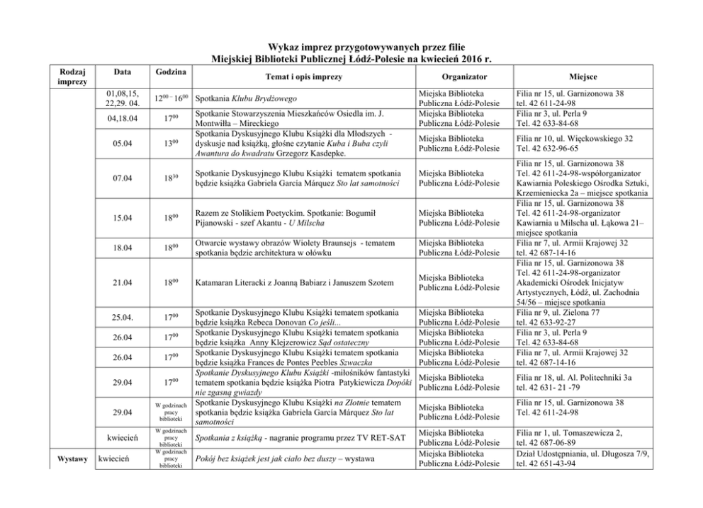 Wykaz imprez przygotowywanych przez filie Miejskiej Biblioteki Publicznej Łódź-Polesie na kwiecień 2016 r. Rodzaj imprezy Data 01,08,15, 22,29. 04. Temat i opis imprezy 1200 – 1600 Spotkania Klubu Brydżowego 04,18.04 1700 05.04 1300 Spotkanie Stowarzyszenia Mieszkańców Osiedla im. J. Montwiłła – Mireckiego Spotkania Dyskusyjnego Klubu Książki dla Młodszych dyskusje nad książką, głośne czytanie Kuba i Buba czyli Awantura do kwadratu Grzegorz Kasdepke. Organizator Miejsce Miejska Biblioteka Publiczna Łódź-Polesie Miejska Biblioteka Publiczna Łódź-Polesie Filia nr 15, ul. Garnizonowa 38 tel. 42 611-24-98 Filia nr 3, ul. Perla 9 Tel. 42 633-84-68 Miejska Biblioteka Publiczna Łódź-Polesie Filia nr 10, ul. Więckowskiego 32 Tel. 42 632-96-65 07.04 1830 Spotkanie Dyskusyjnego Klubu Książki tematem spotkania będzie książka Gabriela García Márquez Sto lat samotności 15.04 1800 Razem ze Stolikiem Poetyckim. Spotkanie: Bogumił Pijanowski - szef Akantu - U Milscha Miejska Biblioteka Publiczna Łódź-Polesie 18.04 1800 Otwarcie wystawy obrazów Wiolety Braunsejs - tematem spotkania będzie architektura w ołówku Miejska Biblioteka Publiczna Łódź-Polesie 21.04 1800 Katamaran Literacki z Joanną Babiarz i Januszem Szotem Miejska Biblioteka Publiczna Łódź-Polesie 25.04. 1700 26.04 1700 26.04 1700 Miejska Biblioteka Publiczna Łódź-Polesie Miejska Biblioteka Publiczna Łódź-Polesie Miejska Biblioteka Publiczna Łódź-Polesie 29.04 1700 Miejska Biblioteka Publiczna Łódź-Polesie Filia nr 18, ul. Al. Politechniki 3a tel. 42 631- 21 -79 29.04 W godzinach pracy biblioteki Spotkanie Dyskusyjnego Klubu Książki tematem spotkania będzie książka Rebeca Donovan Co jeśli... Spotkanie Dyskusyjnego Klubu Książki tematem spotkania będzie książka Anny Klejzerowicz Sąd ostateczny Spotkanie Dyskusyjnego Klubu Książki tematem spotkania będzie książka Frances de Pontes Peebles Szwaczka Spotkanie Dyskusyjnego Klubu Książki -miłośników fantastyki tematem spotkania będzie książka Piotra Patykiewicza Dopóki nie zgasną gwiazdy Spotkanie Dyskusyjnego Klubu Książki na Złotnie tematem spotkania będzie książka Gabriela García Márquez Sto lat samotności Filia nr 15, ul. Garnizonowa 38 Tel. 42 611-24-98-współorganizator Kawiarnia Poleskiego Ośrodka Sztuki, Krzemieniecka 2a – miejsce spotkania Filia nr 15, ul. Garnizonowa 38 Tel. 42 611-24-98-organizator Kawiarnia u Milscha ul. Łąkowa 21– miejsce spotkania Filia nr 7, ul. Armii Krajowej 32 tel. 42 687-14-16 Filia nr 15, ul. Garnizonowa 38 Tel. 42 611-24-98-organizator Akademicki Ośrodek Inicjatyw Artystycznych, Łódź, ul. Zachodnia 54/56 – miejsce spotkania Filia nr 9, ul. Zielona 77 tel. 42 633-92-27 Filia nr 3, ul. Perla 9 Tel. 42 633-84-68 Filia nr 7, ul. Armii Krajowej 32 tel. 42 687-14-16 Spotkania z książką - nagranie programu przez TV RET-SAT Miejska Biblioteka Publiczna Łódź-Polesie Miejska Biblioteka Publiczna Łódź-Polesie kwiecień Wystawy Godzina kwiecień W godzinach pracy biblioteki W godzinach pracy biblioteki Pokój bez książek jest jak ciało bez duszy – wystawa Miejska Biblioteka Publiczna Łódź-Polesie Miejska Biblioteka Publiczna Łódź-Polesie Filia nr 15, ul. Garnizonowa 38 Tel. 42 611-24-98 Filia nr 1, ul. Tomaszewicza 2, tel. 42 687-06-89 Dział Udostępniania, ul. Długosza 7/9, tel. 42 651-43-94 W godzinach pracy biblioteki W godzinach pracy biblioteki W godzinach pracy biblioteki W godzinach pracy biblioteki W godzinach pracy biblioteki W godzinach pracy biblioteki W godzinach pracy biblioteki W godzinach pracy biblioteki W godzinach pracy biblioteki W godzinach pracy biblioteki W godzinach pracy biblioteki W godzinach pracy biblioteki W godzinach pracy biblioteki W godzinach pracy biblioteki W godzinach pracy biblioteki W godzinach pracy biblioteki W godzinach pracy biblioteki W godzinach pracy biblioteki W godzinach pracy biblioteki W godzinach pracy Bajka nie jedno ma imię – wystawa z okazji Międzynarodowego Dnia Książki dla Dzieci Ważne sprawy dziewcząt i chłopców w literackiej twórczości Ewy Nowackiej – wystawa w 5. rocznicę śmierci powieściopisarki, eseistki Na nowe zaś drogi życia miał także na piersiach swoją książkę... („Latarnik”) - wystawa w 170. rocznicę urodzin i 100. rocznicę śmierci Henryka Sienkiewicza Wystawa książek: Podarek dziatkom polskim 220. rocznica urodzin Stanisława Jachowicza Wystawka pt. Serce miej otwarte dla wszystkich, zaufaj niewielu – 400. rocznica śmierci Williama Szekspira Wystawka książek pt. Tu zaczęła się Polska – 1050. rocznica chrztu Polski Chrzest Polski początkiem nowego życia narodu - wystawa z okazji 1050. rocznicy chrztu Polski Tak się Polska zaczęła.. - gazetka z okazji 1050. rocznicy chrztu Polski Wystawa malarstwa Wiolety Braunsejs Pola Gojawiczyńska – w 120. rocznicę urodzin - wystawa Wystawa obrazów Wiolety Braunsejs tematem będzie architektura w ołówku Wystawka pt.: Najpopularniejszy pisarz przełomu XIX i XX wieku Wystawka pt 100 rocz. śmierci Henryka Sienkiewicza Historia Polski według polskich autorów -1050. rocznica Chrztu Polski Wystawa malarstwa Janusza Wilczyńskiego Wystawa książek pt. Czerpane ... z papieru, prezentacja wyjątkowych książek z księgozbioru Wystawa jednej książki pt. Albumy w naszych zbiorach. Zapraszamy. Wystawa jednej książki pt. Z naszych poetyckich tomów Wystawka pt. Noblista z Kaszub - Günter Grass – 1. rocznica śmierci Wystawka pt. Dramaturg ponad czasem - William Szekspir – 400. rocznica śmierci Miejska Biblioteka Publiczna Łódź-Polesie Filia nr 1, ul. Tomaszewicza 2, tel. 42 687-06-89 Miejska Biblioteka Publiczna Łódź-Polesie Filia nr 1, ul. Tomaszewicza 2, tel. 42 687-06-89 Miejska Biblioteka Publiczna Łódź-Polesie Zespół Bibliotek im. Jana Augustyniaka Filia nr 2 i Filia nr 12 ul. Wróblewskiego 67 tel. 42 688-31-30 Miejska Biblioteka Publiczna Łódź-Polesie Miejska Bi