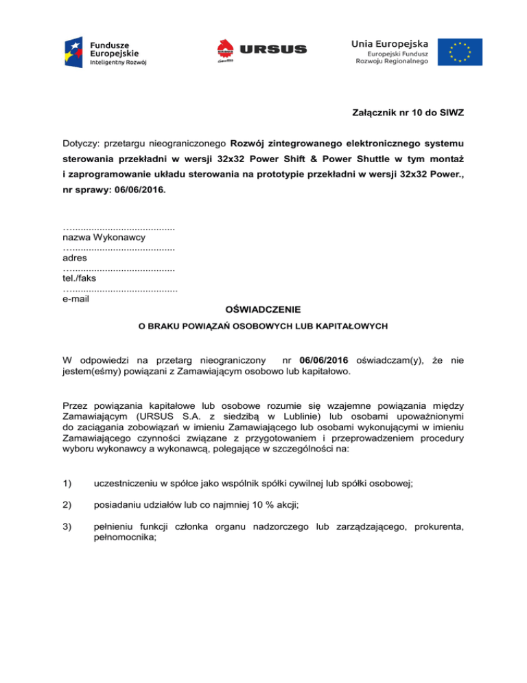 Załącznik nr 10 do SIWZ Dotyczy: przetargu nieograniczonego Rozwój zintegrowanego elektronicznego systemu sterowania przekładni w wersji 32x32 Power Shift & Power Shuttle w tym montaż i zaprogramowanie układu sterowania na prototypie przekładni w wersji 32x32 Power., nr sprawy: 06/06/2016. …...................................... nazwa Wykonawcy …...................................... adres …...................................... tel./faks …....................................... e-mail OŚWIADCZENIE O BRAKU POWIĄZAŃ OSOBOWYCH LUB KAPITAŁOWYCH W odpowiedzi na przetarg nieograniczony nr 06/06/2016 oświadczam(y), że nie jestem(eśmy) powiązani z Zamawiającym osobowo lub kapitałowo. Przez powiązania kapitałowe lub osobowe rozumie się wzajemne powiązania między Zamawiającym (URSUS S.A. z siedzibą w Lublinie) lub osobami upoważnionymi do zaciągania zobowiązań w imieniu Zamawiającego lub osobami wykonującymi w imieniu Zamawiającego czynności związane z przygotowaniem i przeprowadzeniem procedury wyboru wykonawcy a wykonawcą, polegające w szczególności na: 1) uczestniczeniu w spółce jako wspólnik spółki cywilnej lub spółki osobowej; 2) posiadaniu udziałów lub co najmniej 10 % akcji; 3) pełnieniu funkcji członka organu nadzorczego lub zarządzającego, prokurenta, pełnomocnika; 4) pozostawaniu w takim stosunku prawnym lub faktycznym, który może budzić uzasadnione wątpliwości, co do bezstronności w wyborze wykonawcy, w szczególności pozostawanie w związku małżeńskim, w stosunku pokrewieństwa lub powinowactwa w linii prostej, pokrewieństwa lub powinowactwa w linii bocznej do drugiego stopnia lub w stosunku przysposobienia, opieki lub kurateli. ................................, dn. ........................................... ...................................................................... (podpis i pieczątka wykonawcy)