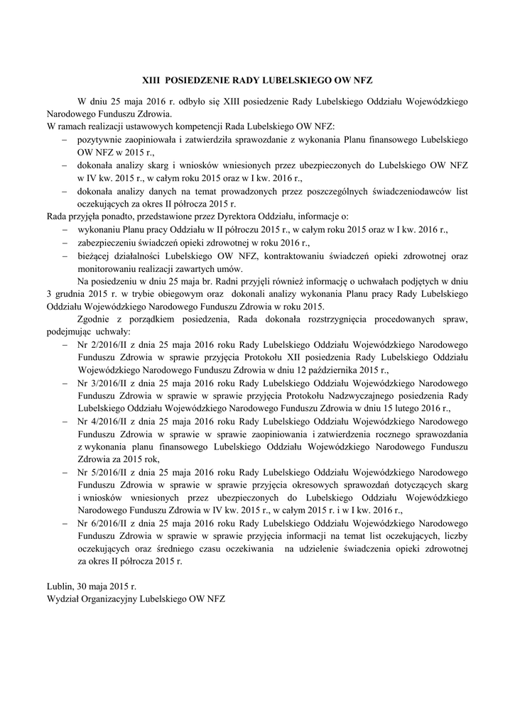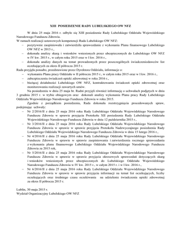 XIII POSIEDZENIE RADY LUBELSKIEGO OW NFZ W dniu 25 maja