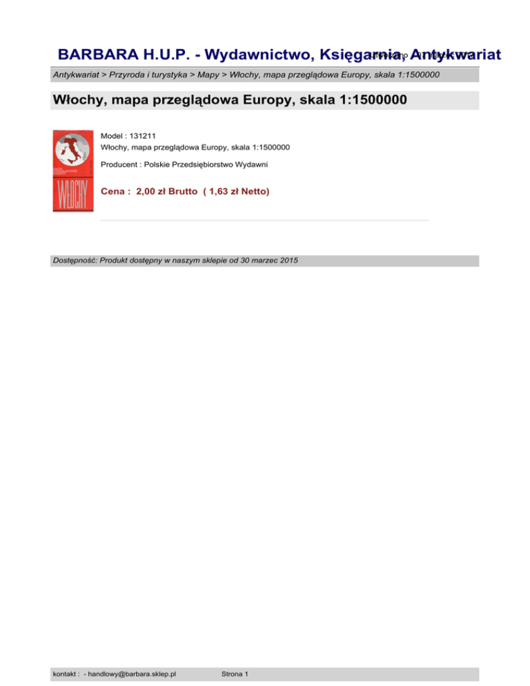Utworzono Antykwariat : 07 marzec 2017 BARBARA H.U.P. - Wydawnictwo, Księgarnia, Antykwariat > Przyroda i turystyka > Mapy > Włochy, mapa przeglądowa Europy, skala 1:1500000 Włochy, mapa przeglądowa Europy, skala 1:1500000 Model : 131211 Włochy, mapa przeglądowa Europy, skala 1:1500000 Producent : Polskie Przedsiębiorstwo Wydawni Cena : 2,00 zł Brutto ( 1,63 zł Netto) Dostępność: Produkt dostępny w naszym sklepie od 30 marzec 2015 kontakt : - [email protected] Strona 1