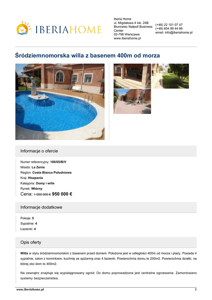 Iberia Home ul. Migdałowa 4 lok. 24B (+48) 22 101 07 47 Biurowiec Natpoll Business (+48) 604 99 44 66 Center email: [email protected] 02-796 Warszawa www.iberiahome.pl Śródziemnomorska willa z basenem 400m od morza Informacje o ofercie Numer referencyjny: 100/05/B/V Miasto: La Zenia Region: Costa Blanca Południowa Kraj: Hiszpania Kategoria: Domy i wille Rynek: Wtórny Cena: 1 000 000 € 950 000 € Informacje dodatkowe Pokoje: 5 Sypialnie: 4 Łazienki: 4 Opis oferty Willa w stylu śródziemnomorskim z basenem przed domem. Położona jest w odległości 400m od morza i plaży. Posiada 4 sypialnie, salon z kominkiem, kuchnię ze spiżarnią oraz 4 łazienki. Powierzchnia domu to 200m2. Powierzchnia działki, na której stoi dom to 400m2. Na zewnątrz znajduje się wypielęgnowany ogród. Do domu poprowadzone jest centralne ogrzewanie. Zamontowano systemy bezpieczeństwa. www.iberiahome.pl 1 Informacje dodatkowe: ● 400m od morza ● Prywatny basen ● Ogród ● Centralne ogrzewanie La Zenia to prestiżowa urbanizacja z przepięknymi, szerokimi piaszczystymi plażami. Oddalona jest od portu lotniczego w Alicante o około 50km. Położona jest pomiędzy Playa Flamenca a Villamartin. Charakterystycznym punktem La Zenia jest jedno z większych centrów handlowych w prowincji Alicante. Znajdziecie tam Państwo zarówno sklepy odzieżowe, punkty usługowe, jak i rozmaite restauracje. Ponadto urbanizacja żyje do późnych godzin nocnych ze względu na liczne kafejki i miejsca spotkań lokalnych mieszkańców. Doskonała pogoda (około 320 dni słonecznych w roku) przyciąga wiele narodowości. Stąd często na ulicach możemy spotkać mieszkańców Skandynawii, Anglii, Rosji, czy również Polski. Udogodnienia ● Widok na morze ● Ogródek ● Basen wspólnoty ● Taras ● Oddzielna kuchnia ● Miejsce parkingowe ● Garaż ● Umeblowany ● Klimatyzacja www.iberiahome.pl 2