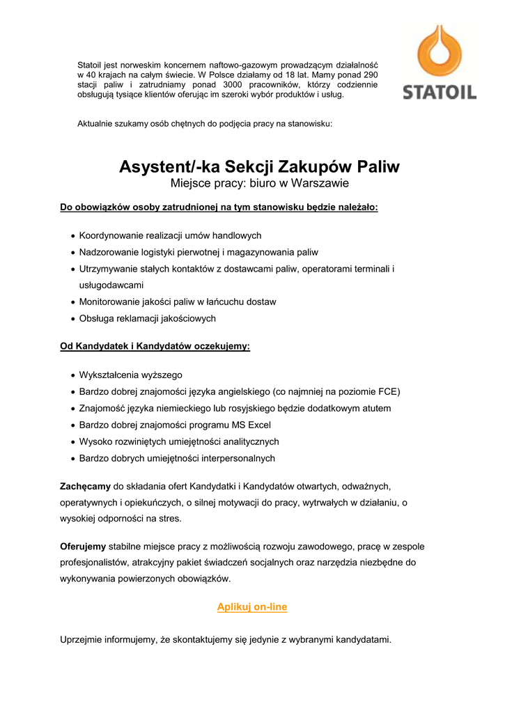 Statoil jest norweskim koncernem naftowo-gazowym prowadzącym działalność w 40 krajach na całym świecie. W Polsce działamy od 18 lat. Mamy ponad 290 stacji paliw i zatrudniamy ponad 3000 pracowników, którzy codziennie obsługują tysiące klientów oferując im szeroki wybór produktów i usług. Aktualnie szukamy osób chętnych do podjęcia pracy na stanowisku: Asystent/-ka Sekcji Zakupów Paliw Miejsce pracy: biuro w Warszawie Do obowiązków osoby zatrudnionej na tym stanowisku będzie należało: Koordynowanie realizacji umów handlowych Nadzorowanie logistyki pierwotnej i magazynowania paliw Utrzymywanie stałych kontaktów z dostawcami paliw, operatorami terminali i usługodawcami Monitorowanie jakości paliw w łańcuchu dostaw Obsługa reklamacji jakościowych Od Kandydatek i Kandydatów oczekujemy: Wykształcenia wyższego Bardzo dobrej znajomości języka angielskiego (co najmniej na poziomie FCE) Znajomość języka niemieckiego lub rosyjskiego będzie dodatkowym atutem Bardzo dobrej znajomości programu MS Excel Wysoko rozwiniętych umiejętności analitycznych Bardzo dobrych umiejętności interpersonalnych Zachęcamy do składania ofert Kandydatki i Kandydatów otwartych, odważnych, operatywnych i opiekuńczych, o silnej motywacji do pracy, wytrwałych w działaniu, o wysokiej odporności na stres. Oferujemy stabilne miejsce pracy z możliwością rozwoju zawodowego, pracę w zespole profesjonalistów, atrakcyjny pakiet świadczeń socjalnych oraz narzędzia niezbędne do wykonywania powierzonych obowiązków. Aplikuj on-line Uprzejmie informujemy, że skontaktujemy się jedynie z wybranymi kandydatami.