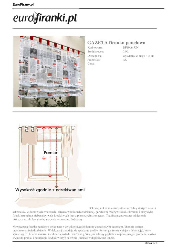 EuroFirany.pl GAZETA firanka panelowa Kod towaru: Średnia ocen: Dostępność: Jednostka: Cena: DF1006_UN 0.00 wysyłamy w ciągu 4-5 dni szt. Dekoracja okna dla osób, które nie lubią utartych norm i schematów w domowych wnętrzach - firanka w kolorach codziennej, gazetowej rzeczywistości. Skromną kolorystykę firanki uzupełnia niebanalny wzór krzykliwych liter z pierwszych stron gazet. Tkanina gazetowa ma odniesienia historyczne, ale bynajmniej nie jest staromodna. Polecamy. Nowoczesna firanka panelowa wykonana z wysokiej jakości tkaniny z gazetowym deseniem. Tkanina dobrze przepuszcza światło dzienne. W dekoracji znajdują się specjalne profile formujące (usztywniające dekorację), które sprawiają, że firanka zawsze idealnie się układa. Zarówno górny, jak i dolny profil bez najmniejszego problemu można wyjąć do prania i po upraniu szybko włożyć na swoje miejsce w dopasowane tunele. strona 1 / 2 EuroFirany.pl Wymiary firany: - w polu szerokość należy wpisać w centymetrach interesującą Państwa szerokość firany (min. 70 cm, max. 135 cm). - w polu wysokość należy wpisać w centymetrach całkowitą wysokość firany (min. 120 cm, max. 280 cm) zmierzoną na prosto czyli przed upięciem w dole zakładek. WAŻNA INFORMACJA DOTYCZĄCA WYSOKOŚCI FIRANY. Wpisując w tabeli całkowitą wysokość firany należy uwzględnić, że po spięciu 3 zakładek jak na pokazanym na zdjęciu, wysokość tej firanki na gotowo będzie około 40 cm krótsza. Przykład. W polu wysokość wpisujemy całkowitą wysokość firany 180 cm - 40 cm (czyli zapas tkaniny na fałki i dół) = ok. 140 cm - taką wysokość będzie miała firanka na gotowo (czyli po spięciu 3 dolnych zakładek widocznym na na zdjęciach firany). WAŻNE. Przed zakupem istnieje możliwość bezpłatnej wysyłki próbek tkanin - zadaj pytanie (formularz znajduje się powyżej obok zdjęcia dekoracji, tuż przy kodzie dekoracji) wpisując w treści wiadomości informację dotyczącą wybranych kolorów oraz adres doręczenia przesyłki. UWAGA. Firanka jest wysyłana kompletnie przygotowana do zawieszenia na karnisz czyli ma włożone profile i upięte za pomocą specjalnych haczyków zakładki, tak jak to widać na zdjęciach. Zdjęcia aranżacyjne dekoracji zamieszczone w sklepie mają wyłącznie charakter poglądowy. Zwracamy uwagę, że fotografia może nieco zmienić odcień koloru. Jeśli mają Państwo jakiekolwiek wątpliwości przed zakupem bardzo prosimy o kontakt mailowy lub telefoniczny. Zamów przez telefon: 85 651 35 35 (poniedziałek-piątek w godz.10-18) Zamów mailem: [email protected] 24h Istnieje możliwość uszycia dekoracji wg. życzeń klienta. Zainteresowanych prosimy o kontakt w celu ustalenia indywidualnych szczegółów zamówienia i oferty. Informacja dotycząca sposobu konserwacji dekoracji: UWAGA. Dozując proszek do prania należy zwracać uwagę na zalecane ilości, zgodnie ze stopniami zabrudzenia tekstyliów. Informację dotyczącą zalecanych ilości można znaleźć na każdym opakowaniu proszku do prania. strona 2 / 2 Powered by TCPDF (www.tcpdf.org)