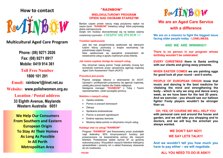 "RAINBOW" How to contact WIELOKULTUROWY PROGRAM OPIEKI NAD OSOBAMI STARSZYMI Bardzo często proste rzeczy mają pozytywny wpływ na nasze życie. “RAINBOW” świadczy usługi które poprawiają dobre samopoczucie. Dzięki nim możesz skoncentrować się na bardzo ważnej codziennej czynności - CIESZYĆ SIĘ ŻYCIEM !!! Multicultural Aged Care Program Phone: (08) 9271 2026 Fax: (08) 9271 0917 Mobile: 0419 914 361 Toll Free Number 1800 101 291 Email: [email protected] Website: www.polishwomen.org.au Location / Postal address 33 Eighth Avenue, Maylands Western Australia 6051 We Help Our Consumers From Southern and Eastern European Origin To Stay At Their Homes As Long As Possible In All Perth Metropolitan Area Troskliwi opiekunowie Jest dla nas przyjemnością opiekować się starszymi ludźmi którzy pochodzą z krajów wschodniej lub południowej części Europy. Nasi opiekunowie są specjalnie przeszkoleni do świadczenia usług w języku wybranym przez klienta. Jak można uzyskać dostęp do naszych usług Aby otrzymać naszą pomoc Twoje potrzeby muszą być wcześniej ocenione przez uprawnioną agencję rządową Aged Care Assessment Team (ACAT). Procedura jest prosta Poproś swojego lekarza o skierowanie do ACAT. Uprzejmi i profesjonalni pracownicy tej agencjii rządowej, ustalą jaka pomoc będzie dla Ciebie najlepsza. Następnie manager “RAINBOW” z Tobą i Twoim reprezentantem, ustali szczegóły pomocy. Niektóre z naszych usług: Opieka osobista Pomoc w pracach domowych Zakupy Spotkania środowiskowe Pomoc w pracach ogrodowych Drobne naprawy domowe Możemy także pomóc w otrzymaniu innych usług. We are an Aged Care Service with a difference We are on a mission to fight the biggest issue facing older people today - LONELINESS. AND WE ARE WINNING!!! There is no person in our program whose birthday wouldn’t be celebrated. EVERY CHRISTMAS there is Santa smiling with our clients and giving away presents. WHEN EASTER COMES we are painting eggs for good luck all year round - and it works. PEOPLE OF EUROPEAN ORIGIN know that music and dancing is the best medicine for vitalizing the mind and strengthening the body - which is why we sing and dance every week, as we have been for the last 20 years. And we exercise - you should see our balloon fights! Footy players wouldn’t be stronger than us. OH, YES, OF COURSE WE WILL HELP YOU with personal care and around the house and garden, and we will take you shopping and to doctors, and we will buy the armchair you always wanted. Każdego stać na usługi "RAINBOW" Program “RAINBOW” jest finansowany przez australijski rząd federalny. 65% otrzymywanych fundszy jest przeznaczone na bezpośrednią pomoc dla naszych klientów. Podstawowa opłata wynosi $7 za godzinę wykonanej pracy. Wszystkich naszych klientów traktujemy sprawiedliwie i prosimy ich o wkład finansowy stosownie do ich możliwości. POLISH WE DON’T SAY NO!!! WE SAY LETS TALK!!! And we wouldn’t tell you how much you have to pay either – we will negotiate. ALL YOU NEED TO DO IS ASK!!!