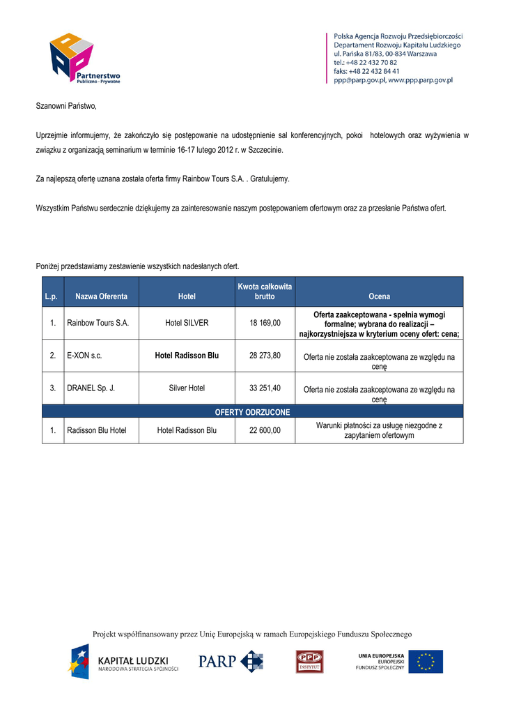 Szanowni Państwo, Uprzejmie informujemy, że zakończyło się postępowanie na udostępnienie sal konferencyjnych, pokoi hotelowych oraz wyżywienia w związku z organizacją seminarium w terminie 16-17 lutego 2012 r. w Szczecinie. Za najlepszą ofertę uznana została oferta firmy Rainbow Tours S.A. . Gratulujemy. Wszystkim Państwu serdecznie dziękujemy za zainteresowanie naszym postępowaniem ofertowym oraz za przesłanie Państwa ofert. Poniżej przedstawiamy zestawienie wszystkich nadesłanych ofert. L.p. Nazwa Oferenta 1. Rainbow Tours S.A. 2. E-XON s.c. 3. DRANEL Sp. J. Hotel Kwota całkowita brutto Hotel SILVER 18 169,00 Hotel Radisson Blu 28 273,80 Oferta nie została zaakceptowana ze względu na cenę Silver Hotel 33 251,40 Oferta nie została zaakceptowana ze względu na cenę Ocena Oferta zaakceptowana - spełnia wymogi formalne; wybrana do realizacji – najkorzystniejsza w kryterium oceny ofert: cena; OFERTY ODRZUCONE 1. Radisson Blu Hotel Hotel Radisson Blu 22 600,00 Warunki płatności za usługę niezgodne z zapytaniem ofertowym Projekt współfinansowany przez Unię Europejską w ramach Europejskiego Funduszu Społecznego