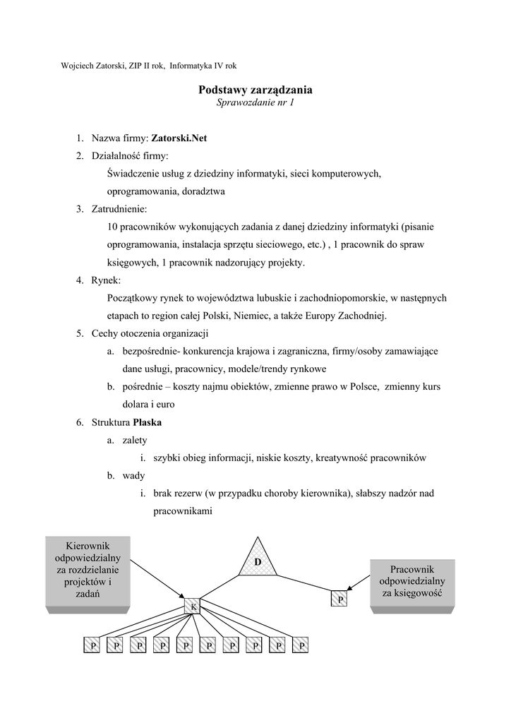 Wojciech Zatorski, ZIP II rok, Informatyka IV rok Podstawy zarządzania Sprawozdanie nr 1 1. Nazwa firmy: Zatorski.Net 2. Działalność firmy: Świadczenie usług z dziedziny informatyki, sieci komputerowych, oprogramowania, doradztwa 3. Zatrudnienie: 10 pracowników wykonujących zadania z danej dziedziny informatyki (pisanie oprogramowania, instalacja sprzętu sieciowego, etc.) , 1 pracownik do spraw księgowych, 1 pracownik nadzorujący projekty. 4. Rynek: Początkowy rynek to województwa lubuskie i zachodniopomorskie, w następnych etapach to region całej Polski, Niemiec, a także Europy Zachodniej. 5. Cechy otoczenia organizacji a. bezpośrednie- konkurencja krajowa i zagraniczna, firmy/osoby zamawiające dane usługi, pracownicy, modele/trendy rynkowe b. pośrednie – koszty najmu obiektów, zmienne prawo w Polsce, zmienny kurs dolara i euro 6. Struktura Płaska a. zalety i. szybki obieg informacji, niskie koszty, kreatywność pracowników b. wady i. brak rezerw (w przypadku choroby kierownika), słabszy nadzór nad pracownikami Kierownik odpowiedzialny za rozdzielanie projektów i zadań D P K P P P P P P P P P P Pracownik odpowiedzialny za księgowość Wojciech Zatorski, ZIP II rok, Informatyka IV rok Podstawy zarządzania Sprawozdanie nr 2 1. Jakiego typu w projekcie jest struktura i dlaczego? W projekcie została wykorzystana struktura płaska, ponieważ jednemu kierownikowi jest przyporządkowana stosunkowo duża liczba podwładnych. Dzięki temu również następuje szybki przepływ informacji pomiędzy dyrektorem, kierownikiem, a pracownikiem. 2. Reorganizacja a. powód Wprowadzenie nowego prawa dotyczącego patentowania oprogramowania w Unii Europejskiej. b. problemy z tym związane Zastosowane rozwiązania w stworzonym oprogramowaniu mogą naruszać patenty. Należy również opatentować własne rozwiązania przed konkurencją. c. rozwiązanie problemu Sprawdzenie istniejących lub już zgłoszonych do opatentowania rozwiązań, ewentualne zakupy licencji na dane rozwiązania. Zgłoszenie własnych wniosków o patenty na dane rozwiązania. Zmiany w oprogramowaniu, które nie naruszają praw patentowych oraz darmowa aktualizacja dla wszystkich klientów. Dodatkowe kredyty na koszty licencji i prawników. d. wynik Ogromne środki poniesione na wykup licencji, modyfikowanie oprogramowania naruszyły płynność finansową firmy, ale uchroniły firmę przed pozwami konkurencji. W związku z tym wzrosły ceny gotowych aplikacji. Wojciech Zatorski, ZIP II rok, Informatyka IV rok Podstawy zarządzania Sprawozdanie nr 3 1. Opisać swoje cechy, umiejętności na stanowisku kierownika. Posiadam wykształcenie wyższe w wymaganych dziedzinach, takich jak informatyka i zarządzania potencjałem ludzkim, posiadam niezbędną wiedzę praktyczną z dziedziny programowania aplikacji oraz zarządzania sieciami komputerowymi oraz ogólną wiedzę praktyczną z informatyki. Cechuje się dobrą komunikatywnością z pracownikami, posiadam bogate doświadczenia w pracy grupowej, przy projektach wymagających współdziałania. Jestem człowiekiem odpornym na stresowe sytuacje, nie panikuje w sytuacjach ekstremalnych. Potrafię kierować drogą awansu pracowników i wzrostem ich kwalifikacji. Jestem otwarty na nowe pomysły, a także na problemy innych pracowników. Od swoich pracowników wymagam prawidłowego i na czas realizowania projektów, a także kreatywności i reprezentowania dostatecznej wiedzy na temat aktualnie realizowanego zadania.