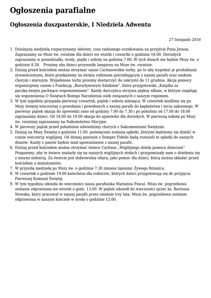 Ogłoszenia parafialne Ogłoszenia duszpasterskie, I Niedziela Adwentu 27 listopada 2016 1. Dzisiejszą niedzielą rozpoczynamy Adwent, czas radosnego oczekiwania na przyjście Pana Jezusa. Zapraszamy na Msze św. roratnie dla dzieci we wtorki i czwartki o godzinie 18.00. Dorosłych zapraszamy w poniedziałki, środy, piątki i soboty na godzinę 7.00. W tych dniach nie będzie Mszy św. o godzinie 8.30. Prosimy aby dzieci przynosiły lampiony na Msze św. roratnie. 2. Dzisiaj przed kościołem można otrzymać nasze Caritasowskie torby, po to aby wypełnić je produktami żywnościowymi, które przekażemy na święta rodzinom potrzebującym z naszej parafii oraz osobom chorym i starszym. Wypełnione torby prosimy dostarczyć do zakrystii do 11 grudnia. Akcję pomocy organizujemy razem z Fundacją „Bursztynowym Szlakiem”, która przygotowała „Książka za paczkę-święta pachnące wspomnieniami”. Każdy darczyńca otrzyma piękny album, w którym znajdują się wspomnienia O Świętach Bożego Narodzenia osób związanych z naszym regionem. 3. W tym tygodniu przypada pierwszy czwartek, piątek i sobota miesiąca. W czwartek modlimy się po Mszy świętej wieczornej o powołania i powołanych z naszej parafii do kapłaństwa i życia zakonnego. W pierwszy piątek okazja do spowiedzi rano od godziny 7.00 do 7.30 i po południu od 17.00 do 18.00 zapraszamy dzieci. Od 18.00 do 19.00 okazja do spowiedzi dla dorosłych. W pierwszą sobotę po Mszy św. roratniej zapraszamy na Nabożeństwo Maryjne. 4. W pierwszy piątek przed południem odwiedzimy chorych z Sakramentami Świętymi. 5. Dzisiaj na Mszy Świętej o godzinie 11.00. poświęcone zostaną opłatki, którymi będziemy się dzielić w czasie wieczerzy wigilijnej. Od dzisiaj panowie z Semper Fidelis będą roznosili te opłatki do naszych domów. Każdy z panów będzie miał upoważnienie z naszej parafii. 6. Dzisiaj przed kościołem można otrzymać świece Caritasu „Wigilijnego dzieła pomocy dzieciom” Pragniemy, aby te świece znalazły się na naszych wigilijnych stołach i przypominały nam o dzieleniu się z innymi miłością. Za świecie jest dobrowolna ofiara, jako pomoc dla dzieci, którą można składać przed kościołem u ministrantów. 7. W przyszłą niedzielę po Mszy św. o godzinie 7.30 zmiana tajemnic Żywego Różańca. 8. W czwartek o godzinie 19.00 katecheza dla rodziców, których dzieci przygotowują się do przyjęcia Pierwszej Komunii Świętej. 9. W tym tygodniu odeszła do wieczności nasza parafianka Marianna Pawul. Msza św. pogrzebowa zostanie odprawiona we wtorek o godz. 13.00. W piątek odszedł do wieczności ojciec ks. Bartosza Nowaka, który pracował w naszej parafii przez ostatnie trzy lata. Msza św. pogrzebowa zostanie odprawiona w naszym kościele w środę o godzinie 12.00.