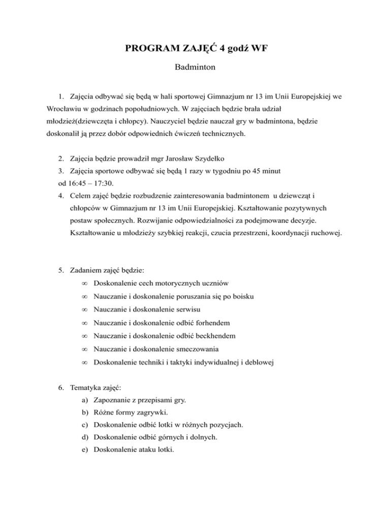 PROGRAM ZAJĘĆ 4 godź WF Badminton 1. Zajęcia odbywać się będą w hali sportowej Gimnazjum nr 13 im Unii Europejskiej we Wrocławiu w godzinach popołudniowych. W zajęciach będzie brała udział młodzież(dziewczęta i chłopcy). Nauczyciel będzie nauczał gry w badmintona, będzie doskonalił ją przez dobór odpowiednich ćwiczeń technicznych. 2. Zajęcia będzie prowadził mgr Jarosław Szydełko 3. Zajęcia sportowe odbywać się będą 1 razy w tygodniu po 45 minut od 16:45 – 17:30. 4. Celem zajęć będzie rozbudzenie zainteresowania badmintonem u dziewcząt i chłopców w Gimnazjum nr 13 im Unii Europejskiej. Kształtowanie pozytywnych postaw społecznych. Rozwijanie odpowiedzialności za podejmowane decyzje. Kształtowanie u młodzieży szybkiej reakcji, czucia przestrzeni, koordynacji ruchowej. 5. Zadaniem zajęć będzie: • Doskonalenie cech motorycznych uczniów • Nauczanie i doskonalenie poruszania się po boisku • Nauczanie i doskonalenie serwisu • Nauczanie i doskonalenie odbić forhendem • Nauczanie i doskonalenie odbić beckhendem • Nauczanie i doskonalenie smeczowania • Doskonalenie techniki i taktyki indywidualnej i deblowej 6. Tematyka zajęć: a) Zapoznanie z przepisami gry. b) Różne formy zagrywki. c) Doskonalenie odbić lotki w różnych pozycjach. d) Doskonalenie odbić górnych i dolnych. e) Doskonalenie ataku lotki. f) Nauka i doskonalenie gry w obronie. g) Doskonalenie poznanych elementów techniki indywidualnej we fragmentach gry oraz w formie małych gier. h) Doskonalenie poznanych elementów techniki w formie gry uproszczonej, gry szkolnej, gry właściwej. i) Doskonalenie taktyki gry poprzez mecze sparingowe. Opracował: mgr Jarosław Szydełko 01.09.2012r.