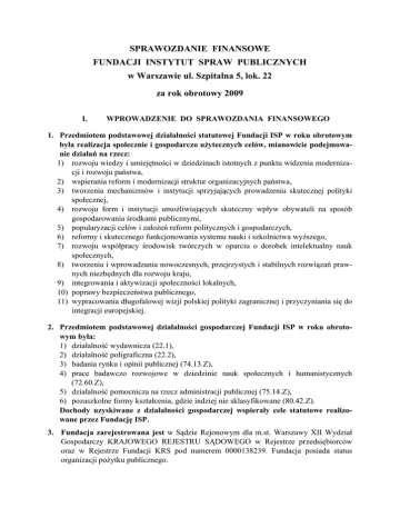 SPRAWOZDANIE FINANSOWE FUNDACJI INSTYTUT SPRAW PUBLICZNYCH w Warszawie ul. Szpitalna 5, lok. 22 za rok obrotowy 2009 I. WPROWADZENIE DO SPRAWOZDANIA FINANSOWEGO 1. Przedmiotem podstawowej działalności statutowej Fundacji ISP w roku obrotowym była realizacja społecznie i gospodarczo użytecznych celów, mianowicie podejmowanie działań na rzecz: 1) rozwoju wiedzy i umiejętności w dziedzinach istotnych z punktu widzenia modernizacji i rozwoju państwa, 2) wspierania reform i modernizacji struktur organizacyjnych państwa, 3) tworzenia mechanizmów i instytucji sprzyjających prowadzeniu skutecznej polityki społecznej, 4) rozwoju form i instytucji umożliwiających skuteczny wpływ obywateli na sposób gospodarowania środkami publicznymi, 5) popularyzacji celów i założeń reform politycznych i gospodarczych, 6) reformy i skutecznego funkcjonowania systemu nauki i szkolnictwa wyższego, 7) rozwoju współpracy środowisk twórczych w oparciu o dorobek intelektualny nauk społecznych, 8) tworzenia i wprowadzania nowoczesnych, przejrzystych i stabilnych rozwiązań prawnych niezbędnych dla rozwoju kraju, 9) integrowania i aktywizacji społeczności lokalnych, 10) poprawy bezpieczeństwa publicznego, 11) wypracowania długofalowej wizji polskiej polityki zagranicznej i przyczyniania się do integracji europejskiej. 2. Przedmiotem podstawowej działalności gospodarczej Fundacji ISP w roku obrotowym była: 1) działalność wydawnicza (22.1), 2) działalność poligraficzna (22.2), 3) badania rynku i opinii publicznej (74.13.Z), 4) prace badawczo rozwojowe w dziedzinie nauk społecznych i humanistycznych (72.60.Z), 5) działalność pomocnicza na rzecz administracji publicznej (75.14.Z), 6) pozaszkolne formy kształcenia, gdzie indziej nie sklasyfikowane (80.42.Z). Dochody uzyskiwane z działalności gospodarczej wspierały cele statutowe realizowane przez Fundację ISP. 3. Fundacja zarejestrowana jest w Sądzie Rejonowym dla m.st. Warszawy XII Wydział Gospodarczy KRAJOWEGO REJESTRU SĄDOWEGO w Rejestrze przedsiębiorców oraz w Rejestrze Fundacji KRS pod numerem 0000138239. Fundacja posiada status organizacji pożytku publicznego. 3. Przedmiotowe sprawozdanie finansowe obejmuje rok obrotowy od 01.01.2009 r. do 31.12.2009 r. 4. Sprawozdanie finansowe sporządzone zostało przy założeniu możliwości dalszej kontynuacji działalności . 5. Sprawozdanie finansowe sporządzone zostało na podstawie ksiąg rachunkowych prowadzonych w roku obrotowym zgodnie z dokumentacją przyjętych zasad (polityką) rachunkowości ustaloną i wprowadzoną do stosowania postanowieniami uchwały Zarządu Fundacji z dnia 18 grudnia 2002 wprowadzającej ją do stosowania z dniem 01.01.2003 roku i obejmującą: 1) zasady ustalania roku obrotowego i okresów sprawozdawczych, 2) zakładowe zasady wyceny aktywów i pasywów oraz ustalania wyniku finansowego, 3) zasady prowadzenia ksiąg rachunkowych, obejmujące: a) zakładowy plan kont, b) wykaz ksiąg rachunkowych, c) dokumentację systemu przetwarzania danych, 4) system ochrony danych i ich zbiorów, 5) własny wzór sprawozdania finansowego z kalkulacyjnym rachunkiem zysków i strat, w sposób zgodny w szczególności z postanowieniami art. 4, 10 i 50 oraz rozdziałów 2, 4 i 8 ustawy o rachunkowości. Zakładowe zasady, metody i wzory wybrano spośród możliwych do stosowania zasad, metod i wzorów dopuszczonych ustawą i wprowadzono je do stosowania na okres wieloletni. 6. Wykazane w bilansie na koniec roku obrotowego aktywa i pasywa (pomijając te, które wykazano w wartości nominalnej) wyceniono następującymi metodami wyceny wynikającymi z przyjętych zasad (polityki) rachunkowości: 1) środki trwałe według wartości początkowej pomniejszonej o odpisy amortyzacyjne, 2) zapasy materiałów i towarów w rzeczywistych cenach ich nabycia, 3) zapasy produktów w koszcie wytworzenia nie wyższym od cen możliwych do uzyskania na rynku, 4) należności w kwotach wymaganej zapłaty, 5) zobowiązania w kwotach wymaganej zapłaty. (Pozycje wyrażone w walutach obcych przeliczono po średnim kursie obowiązującym na dzień bilansowy i ogłoszonym przez Prezesa NBP). ZARZĄD FUNDACJI ISP Warszawa, 31 marca 2010 r. (miejsce i data sporządzenia) (pieczęć firmowa) .................................................. ................................................ (imię, nazwisko i podpis osoby sporządzającej) …………………………………. .................................................. 2 II. BILANS na dzień 31.12.2009 r. AKTYWA (w zł i gr.) Stan aktywów na: Wyszczególnienie aktywów 1 31.12.2009r 2 A. Aktywa trwałe 1.899,64 I. Wartości niematerialne i prawne 31.12.2008r 3 2.829.964,05 — 1. Koszty zakończonych prac rozwojowych 2. Wartość firmy 3. Inne wartości niematerialne i prawne 4. Zaliczki na wartości niematerialne i prawne II. Rzeczowe aktywa trwałe 1. Środki trwałe 1.899,64 8.118,97 1.899,64 8.118,97 1.899,64 8.118,97 a) grunty (w tym prawo wieczystego uży– tkowania gruntu) b) budynki, lokale, obiekty inżynierii lądowej c) urządzenia techniczne i maszyny d) środki transportu e) inne środki trwałe 2. Środki trwałe w budowie 3. Zaliczki na środki trwałe w budowie III. Należności długoterminowe — 1. Należności od jednostek powiązanych 2. Należności od pozostałych jednostek — 2.821.845,08 IV. Inwestycje długoterminowe 1. Nieruchomości 2. Wartości niematerialne i prawne 2.821.845,08 3. Długoterminowe aktywa finansowe a) w jednostkach powiązanych • udziały, obligacje, akcje • inne papiery wartościowe 3 1 • pożyczki udzielone • inne długoterminowe aktywa finansowe 2 3 2.821.845,08 b) w pozostałych jednostkach • udziały i akcje • inne papiery wartościowe • pożyczki udzielone • inne długoterminowe aktywa finansowe 2.524.030,13 297.814,95 4. Inne inwestycje długoterminowe V. Długoterminowe rozliczenia międzyokresowe — 1. Aktywa z tytułu odroczonego podatku docho