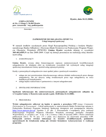 Dynów, dnia 10.12.2008r. GMINA DYNÓW ul. Ks. J. Ożoga 2, 36-065 Dynów pow. rzeszowski woj. podkarpackie ............................................................... Zamawiający ZAPROSZENIE DO SKŁADANIA OFERT NA Usługi integracji społecznej W ramach środków uzyskanych przez Rząd Rzeczpospolitej Polskiej z kredytu Między narodowego Banku Odbudowy i Rozwoju (Bank Światowy) na Poakcesyjny Program Wspar cia Obszarów Wiejskich (PPWOW) Gmina Dynów uzyskała dotację w wysokości 369 462,45PLN na lata 2008-2009. Część tej dotacji przeznacza na realizację niżej określo nych usług. 1. ZAMAWIAJĄCY Gmina Dynów, (zwana dalej Zamawiającym) zaprasza zainteresowanych kwalifikowanych usługodawców do składania ofert na świadczenie wszystkich lub wybranych usług integracji społecznej mieszkańcom Gminy spośród usług opisanych poniżej. Każdy z potencjalnych usługodawców musi spełnić jeden z poniższych warunków: usługa nie jest powtórzeniem dotychczasowego zakresu działań realizowanych przez danego usługodawcę, lub też dotyczy usług świadczonych przez tego usługodawcę na rzecz dodatkowych beneficjentów, usługa będzie realizowana w partnerstwie z innymi usługodawcami 2. SPOTKANIE INFORMACYJNE Spotkanie informacyjne dla zainteresowanych, potencjalnych usługodawców odbędzie się w Urzędzie Gminy w Dynowie (sala narad) o godz. 10.00 dnia 22.12.2008r. 3. PROCEDURA Wybór usługodawców odbywać się będzie w oparciu o procedurę CPP ((ang.) Community Participation in Procurement – Udział społeczności w zamówieniach) Banku Światowego opisaną w Podręczniku Realizacji Programu Integracji Społecznej dostępnym pod następującym adresem: http://www.ppwow.gov.pl. Zgodnie z §3 pkt. 2 Porozumienia o współpracy przy realizacji Poakcesyjnego Programu Wsparcia Obszarów Wiejskich zawartego pomiędzy Zarządem Województwa, w związku z art. 4 ust. 1 lit. a Ustawy z dnia 29 stycznia 2004 r. Prawo zamówień publicznych (Dz.U. Nr 19, poz. 177 z późn. zm.) dopuszcza się stosowanie procedury CPP. Podręcznik zawiera również informacje nt. kosztów kwalifikowanych, podmiotów uprawnionych do świadczenia usług jak również formularze wykorzystywane w realizacji programu. 1 4. OPIS PRZEDMIOTU ZAMÓWIENIA OFERTY CZĘŚCIOWE Zamawiający dopuszcza składanie ofert częściowych. Oferent może złożyć ofertę na jedną lub więcej części. Jeżeli oferent pragnie złożyć ofertę na więcej niż jedną część, jest zobowiązany do złożenia odrębnych ofert techniczno-finansowych na każdą część. Wybór ofert jest dokonywany odrębnie w stosunku do każdej części. WARIANTY Zamawiający nie dopuszcza składania ofert wariantowych. OPIS ZAMAWIANYCH USŁUG 1) Część 1 Usługi dla osób starszych - zapewnienie kontaktów społecznych poprzez zorganizowanie uroczystości typu Dzień Babci, Dzień Dziadka, Dzień Seniora itp. Termin wykonania zamówienia: 15.01.2009 – 28.02.2009r. Na realizację tej usługi przeznacza się kwotę – 18 000,00 zł 2) Część 2 Usługi dla dzieci i młodzieży Zorganizowanie różnorodnych zajęć w okresie ferii zimowych dla dzieci i młodzieży z terenu Gminy Dynów poprzez Np. zajęcia dydaktyczne, twórcze, wychowawcze, sportowe w kołach zainteresowań, świetlicach, umożliwienie szerszego dostępu różnorodnych form aktywnego wypoczynku poprzez sport i rekreację czy też zorganizowanie wycieczki dzieci i młodzieży z Gminy Dynów. Termin wykonania zamówienia: 02.02.2009 – 15.02.2009r. Na realizację tej usługi przeznacza się kwotę – 36 000,00 zł 3) Część 3 Wsparcie szkoleniowe Zorganizowanie szkoleń, warsztatów, wizyt studyjnych dla określonej grupy osób z terenu całej Gminy Dynów, które przyczynią się do właściwego planowania, wdrażania i podniesienia jakości usług świadczonych na rzecz osób starszych, dzieci i młodzieży oraz rodzin. Termin wykonania zamówienia: 15.01.2009 – 28.02.2009r. Na realizację tej usługi przeznacza się kwotę – 36 946,25zł 2 Usługodawca zobowiązany jest do przedstawienia w ofercie informacji nt. sposobu monitorowania realizacji usług, przewidywanych działań informacyjnych, jak również infor macji dotyczących zapewnienia trwałości podejmowanych działań. Podstawą dla płatności na rzecz usługodawcy będzie rzeczywiście zrealizowana liczba jednostek zdefiniowanych jako czas świadczenia usług - liczba godzin, w czasie których świadczone będą usługi i liczba osób uczestniczących w działaniu (dla których oferowana jest usługa). 5. UPRAWNIENI USŁUGODAWCY Podmiotami uprawnionymi do ubiegania się o zamówienie w ramach niniejszej procedury są: 1. Organizacje pozarządowe (NGOs) 2. Organizacje kościelne 3. Prywatni usługodawcy: Firmy, osoby fizyczne, spółdzielnie socjalne, 4. Samorządy zawodowe, organizacje samorządu gospodarczego, izby rolnicze 5. Jednostki organizacyjne samorządu terytorialnego, stowarzyszenia jst i im podległe jednostki organizacyjne, 6. KRYTERIA OCENY TECHNICZNEJ 6.1 Kryteria Oceny Technicznej dla Części 1 zamówienia - Usługi dla osób starszych zgodność z warunkami realizacji i zakresem zamawianych usług. dysponowanie pomieszczeniami potrzebnymi do świadczenia usług, przedstawienie szczegółowego kosztorysu planowanych zajęć 6.2 Kryteria Oceny Technicznej dla Części 2 zamówienia - Usługi dla dzieci i młodzieży zgodność z warunkami realizacji i zakresem zamawianych usług. dysponowanie pomieszczeniami potrzebnymi do świadczenia usług przedstawienie szczegółowego kosztorysu planowanych zajęć przedstawienie spójnego programu realizowanych zajęć dysponowanie min. 1 osobą doświadczoną w pracy z młodzieżą 6.3 Kryteria Oceny Technicznej dla Części 3 zamówienia – Wsparcie szkoleniowe zgodność z warunkami realizacji i zakresem zamawianych usług dysponowanie posiadającą odpowiednie doświadczenie i kwalifikacje kadrą dysponowanie pomieszczeniami