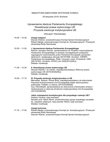 MIĘDZYPARLAMENTARNE SPOTKANIE KOMISJI 29 listopada 2016, Bruksela Uprawnienia śledcze Parlamentu Europejskiego Nowelizacja prawa wyborczego UE Przyszła ewolucja instytucjonalna UE PROJEKT PROGRAMU 10.00 – 10.30 Uwagi wstępne Danuta Hübner, przewodnicząca Komisji Spraw Konstytucyjnych Róbert Madej, przewodniczący Komisji ds. Konstytucyjnych i Prawnych słowackiej Rady Narodowej 10:30 – 11:30 I. Uprawnienia śledcze Parlamentu Europejskiego Ramón Jáuregui Atondo, sprawozdawca do Projektu rozporządzenia Parlamentu Europejskiego w sprawie szczegółowych przepisów regulujących wykonywanie przez Parlament Europejski uprawnień śledczych i zastępujący decyzję 95/167/WE, Euratom, EWWiS Parlamentu Europejskiego, Rady i Komisji z dnia 19 kwietnia 1995 (95/167/EC, Euratom, ECSC) (ex 2009/2212(INL)) Debata i konkluzje 11:30 – 12.30 II. Nowelizacja prawa wyborczego UE Danuta Hübner i Jo Leinen, współsprawozdawcy Reformy prawa wyborczego UE (2015/2035(INL)) Debata i konkluzje 15.00 – 17:15 III. Przyszła ewolucja instytucjonalna w UE Mercedes Bresso i Elmar Brok, współsprawozdawcy do dokumentu Poprawa funkcjonowania Unii Europejskiej dzięki wykorzystaniu potencjału Traktatu z Lizbony (2014/2249(INI)) Guy Verhofstadt, sprawozdawca do dokumentu Ewentualne zmiany i dostosowania w obecnej strukturze instytucjonalnej Unii Europejskiej (2014/2248(INI)) Jakie rozwiązania konstytucyjne dla przyszłego rozwoju UE? António Vitorino, były komisarz Senator prof. Mario Monti, przewodniczący grupy wysokiego szczebla ds. zasobów własnych, były premier Włoch, były komisarz Debata i konkluzje 17.15 – 17:30 Uwagi końcowe Róbert Madej, przewodniczący Komisji ds. Konstytucyjnych i Prawnych słowackiej Rady Narodowej Danuta Hübner, przewodnicząca Komisji Spraw Konstytucyjnych