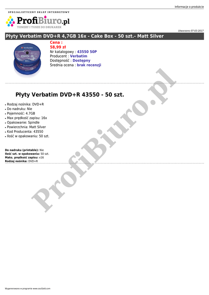 Informacje o produkcie Utworzono 07-03-2017 Płyty Verbatim DVD+R 4,7GB 16x - Cake Box - 50 szt.- Matt Silver Cena : 58,99 zł o. pl Nr katalogowy : 43550 50P Producent : Verbatim Dostępność : Dostępny Średnia ocena : brak recenzji Płyty Verbatim DVD+R 43550 - 50 szt. ● ● ● ● ● ● Rodzaj nośnika: DVD+R Do nadruku: Nie Pojemność: 4.7GB Max prędkość zapisu: 16x Opakowanie: Spindle Powierzchnia: Matt Silver Kod Producenta: 43550 Ilość w opakowaniu: 50 szt. Pr of Do nadruku (printable): Nie Ilość szt. w opakowaniu: 50 szt. Maks. prędkość zapisu: x16 Rodzaj nośnika: DVD+R iu r ● iB ● Wygenerowano w programie www.oscGold.com