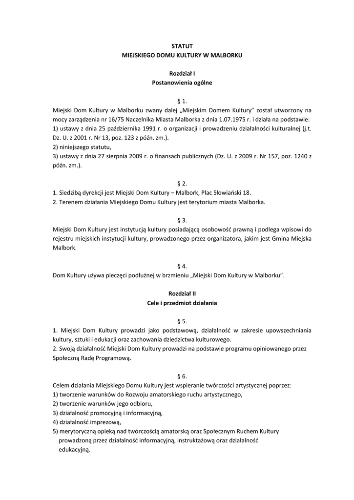 STATUT MIEJSKIEGO DOMU KULTURY W MALBORKU Rozdział I