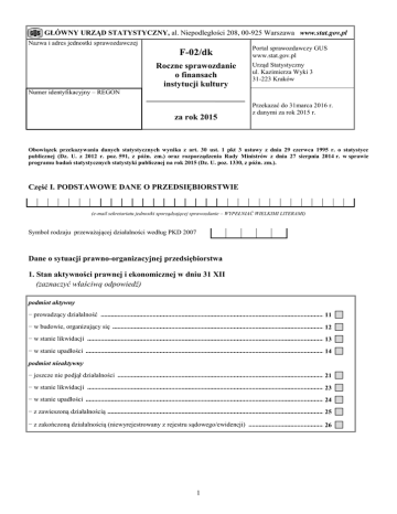 GŁÓWNY URZĄD STATYSTYCZNY, al. Niepodległości 208, 00-925 Warszawa www.stat.gov.pl Nazwa i adres jednostki sprawozdawczej F-02/dk Roczne sprawozdanie o finansach instytucji kultury Portal sprawozdawczy GUS www.stat.gov.pl Urząd Statystyczny ul. Kazimierza Wyki 3 31-223 Kraków Numer identyfikacyjny – REGON za rok 2015 Przekazać do 31marca 2016 r. z danymi za rok 2015 r. Obowiązek przekazywania danych statystycznych wynika z art. 30 ust. 1 pkt 3 ustawy z dnia 29 czerwca 1995 r. o statystyce publicznej (Dz. U. z 2012 r. poz. 591, z późn. zm.) oraz rozporządzenia Rady Ministrów z dnia 27 sierpnia 2014 r. w sprawie programu badań statystycznych statystyki publicznej na rok 2015 (Dz. U. poz. 1330, z późn. zm.). Część I. PODSTAWOWE DANE O PRZEDSIĘBIORSTWIE (e-mail sekretariatu jednostki sporządzającej sprawozdanie – WYPEŁNIAĆ WIELKIMI LITERAMI) Symbol rodzaju przeważającej działalności według PKD 2007 Dane o sytuacji prawno-organizacyjnej przedsiębiorstwa 1. Stan aktywności prawnej i ekonomicznej w dniu 31 XII (zaznaczyć właściwą odpowiedź) podmiot aktywny − prowadzący działalność .............................................................................................................................................. 11 − w budowie, organizujący się ....................................................................................................................................... 12 − w stanie likwidacji ...................................................................................................................................................... 13 − w stanie upadłości ....................................................................................................................................................... 14 podmiot nieaktywny − jeszcze nie podjął działalności .................................................................................................................................... 21 − w stanie likwidacji ...................................................................................................................................................... 23 − w stanie upadłości ....................................................................................................................................................... 24 − z zawieszoną działalnością .......................................................................................................................................... 25 − z zakończoną działalnością (niewyrejestrowany z rejestru sądowego/ewidencji) ...................................................... 26 1 Część II. BILANS I RACHUNEK ZYSKÓW I STRAT 1.1 data rozpoczęcia 1. Rok obrotowy rok mies. dzień rok mies. dzień 1.2 data zakończenia sporządza bilans i rachunek zysków i strat za rok 1 kalendarzowy ............................................................................ 2. Czy przedsiębiorstwo: (zaznaczyć właściwą odpowiedź) podaje dane bilansowe tylko na koniec roku (rubryka 2) 2 i rachunek zysków i strat za rok kalendarzowy (pełny) ............. 3. Czy przedsiębiorstwo dokonało przeszacowania poszczególnych wartości bilansowych w okresie sprawozdawczym w związku ze zmianą cen i różnic kursowych? Jeśli TAK, podać procentową zmianę wartości sumy bilansowej bez znaku po przecinku. 2 1 tak 2 nie % udziału Dział 1. Bilans sporządzony na dzień 31 XII w tys. zł (bez znaku po przecinku) Stan na AKTYWA (wyszczególnienie) 0 I. Wartości niematerialne i prawne 02 II. Rzeczowe aktywa trwałe 03 środki trwałe 04 grunty 05 budynki, lokale i obiekty inżynierii lądowej i wodnej 06 urządzenia techniczne, maszyny i środki transportu 07 w tym 01 w tym A. Aktywa trwałe (wiersze 02+03+09+10+15) zaliczki na środki trwałe w budowie 08 09 IV. Inwestycje długoterminowe 10 nieruchomości 11 długoterminowe aktywa finansowe 12 w tym w tym III. Należności długoterminowe udziały lub akcje 13 inne długoterminowe aktywa finansowe 14 V. Długoterminowe rozliczenia międzyokresowe 15 B. Aktywa obrotowe (wiersze 17+19+23+27) 16 I. Zapasy 17 w tym zaliczki na dostawy 18 3 początek roku koniec roku 1 2 Dział 1. Bilans sporządzony na dzień 31 XII w tys. zł (bez znaku po przecinku) (cd.) Stan na A K T Y W A (cd.) (wyszczególnienie) 0 w tym II. Należności krótkoterminowe 19 z tytułu dostaw i usług 20 z tytułu podatków, dotacji, ceł, ubezpieczeń społecznych i zdrowotnych oraz innych świadczeń 21 dochodzone na drodze sądowej 22 III. Inwestycje krótkoterminowe 23 w tym krótkoterminowe aktywa finansowe 24 w tym środki pieniężne i inne aktywa pieniężne 25 w tym środki pieniężne w kasie i na rachunkach 26 IV. Krótkoterminowe rozliczenia międzyokresowe 27 Aktywa razem (A+B) (wiersze 01+16) 28 4 początek roku koniec roku 1 2 Dział 1. Bilans sporządzony na dzień 31 XII w tys. zł (bez znaku po przecinku) (dokończenie) Stan na PASYWA (wyszczególnienie) początek roku 1 0 A. Kapitał (fundusz) własny w tym kapitał (fundusz) podstawowy 29 30 B. Zobowiązania i rezerwy na zobowiązania (wiersze 32+33+35+42) 31 I. Rezerwy na zobowiązania 32 II. Zobowiązania długoterminowe 33 w tym kredyty i pożyczki 34 35 z tytułu dostaw i usług 36 kredyty i pożyczki 37 zaliczki otrzymane na dostawy 38 z tytułu podatków, ceł, ubezpieczeń i innych świadczeń 39 z tytułu wynagrodzeń 40 fundusze specjalne 41 IV. Rozliczenia międzyokresowe 42 Pasywa razem (A+B) (wiersze 29+31) 43 w tym III. Zobowiązania krótkoterminowe Dane uzupełniające do bilansu w tys. zł (bez znaku po przecinku) Z wiersza 27 czynne rozliczenia międzyokresowe kosztów Z wiersza 32 bierne rozliczenia międzyokresowe kosztów 44 45 Z wiersza 34 długoterminowe kredyty bankowe 46 Z wiersza 37 krótkoterminowe kredyty bankowe 47 Z wiersza 41 zakładowy fundusz świadczeń socjalnych Z wiersza 42 rozliczenia międzyokresowe przychodów dotac