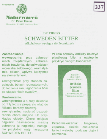 Pmducent • ~t. Na' ••r\\'aren Dr. PeterTheiss Marktplatz 12,6650 Hamburg Saar SCHWEDEN BITTER Zastosowani,e: wewnętrznie: przy zaburzeniach żołądkowych, zaburzeniach trawienia, dolegliwościach woreczka żółciowego, reumatyźmie, bólach" wpływa korzystnie na elementy krwi. zewnętrznie: przy stanach zapalnych, bólach reumatycznych, do leczenia ran, łagodzenia bólu po ukąszeniach owadów, Dawkowanie: wewnętrznie: 3-4 razy dziennie po 1 łyżeczce preparatu wlać do filiżanki herbaty ziołowej. zewnętrznie: nacierać bezpośrednio chore miejsce lub przykładac okłady. Chore miejsce najpierw nasmarowac maścią ochronną (z nagietka), następnie przyłożyć watę nasączoną _SCHWEDEN BITTER. W celu ochrony odzieży nałożyć plastikową folię, a następnie przykryć ciepłym bandażem. Dr.Theiss Schweden Bitter KrauterellXler nach alten Rezepturen lUr InneJlichen und i'luBerllchen Anwendung Przeciwskazania: biegunka, zaparcia, cieżkie zaburzenia funkcji wątroby, podczas ciąży i karmienia. Uwaga: Preparat zawiera alkohol 40% val. 1 dawka odpowiada zażyciu 1,6 g alkoholu. Zażywanie preparatu jest niewskazane przy schorzeniach wątroby, nadużywaniu alkoholu, epilepsji, uszkodzeniach mózgowych, w czasie ciąży i przez dzieci. Preparat może osłabić lub wzmocnić objawy chorób. Skład: 2000 mi zawiera: 40. Vol.% wyciag alkoholowy z: Aloe 20 g, Rhizoma Rhei 18 g, Theriac sine opio 18 g, Myrrhe 13 g, Rhizoma Zedoariae 9 g, Radix Dietami 7 g Radix Gentianae 7 g, Radix Angelicae 7 g, Radix Carlinae 4 g, Camphora 2 g, Rhizoma Tormentillae 2 g, Castor 2 g, Polyporus lar,icis 5 g, Arillus Myristicae 2 g, Folium Sennae 2 g, Semen MYrlsticae 35g, Croci Stigma 2 g, Rhizoma Ca i 18 g, Bolus alba 5 g SCHWEDEN BITTER dotępne w opakowaniach a 100 mi, 250 mi i 500 mi Oryginalne szwedzkie zioła dr Theiss'a są od dawna wypróbowanym domowym środkiem leczniczym. Pomagają w niewiarygodny sposób przy wielorakich dolegliwościach. W szczególności dostarczają organizmowi naturalnej goryczki, której brakuje naszemu codziennemu pokarmowi, zapewniają dobre trawienie przyczynajac się przez to do ogólnie dobrego samopoczucia. Również zastosowane zewnętrznie przez nacierania albo jako okłady działają bardzo skutecznie. Preparat może ulec zmętnieniu, które nie wpływa ujemnie na jego działanie. Przechowywać w miejscach niedostepnych dla dzieci. 01-909 Warszawa ul. Sokratesa 7 Tel./Fax (022) 359208