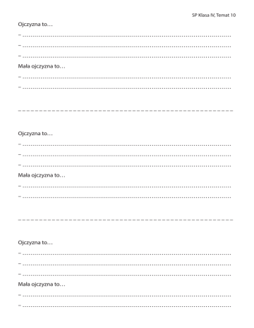 SP Klasa IV, Temat 10 Ojczyzna to… – …………………………………………………………………………………………… – …………………………………………………………………………………………… – …………………………………………………………………………………………… Mała ojczyzna to… – …………………………………………………………………………………………… – …………………………………………………………………………………………… ___________________________________________________ Ojczyzna to… – …………………………………………………………………………………………… – …………………………………………………………………………………………… – …………………………………………………………………………………………… Mała ojczyzna to… – …………………………………………………………………………………………… – …………………………………………………………………………………………… ___________________________________________________ Ojczyzna to… – …………………………………………………………………………………………… – …………………………………………………………………………………………… – …………………………………………………………………………………………… Mała ojczyzna to… – …………………………………………………………………………………………… – …………………………………………………………………………………………… Abraham SP Klasa IV, Temat 10 Izaak SP Klasa IV, Temat 10 Ezaw SP Klasa IV, Temat 10 Jakub SP Klasa IV, Temat 10 Ziemia Święta SP Klasa IV, Temat 10 Kanaan SP Klasa IV, Temat 10 Ziemia Obiecana SP Klasa IV, Temat 10 Izrael SP Klasa IV, Temat 10 Palestyna SP Klasa IV, Temat 10 SP Klasa IV, Temat 10 Grupa 1 Napisz definicję wyrazu „Ojczyzna”. ___________________________________________________ Grupa 2 Zrób reklamę wycieczki do twojej „małej ojczyzny”. ___________________________________________________ Grupa 3 Napisz równanie matematyczne do hasła „ziemia na której mieszkam”. ___________________________________________________ Grupa 4 Narysuj najpiękniejsze miejsce w twojej okolicy.