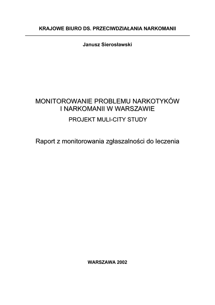 KRAJOWE BIURO DS. PRZECIWDZIAŁANIA NARKOMANII Janusz Sierosławski MONITOROWANIE PROBLEMU NARKOTYKÓW I NARKOMANII W WARSZAWIE PROJEKT MULI-CITY STUDY Raport z monitorowania zgłaszalności do leczenia WARSZAWA 2002 SPIS TREŚCI: Strona WPROWADZENIE ..................................................................................... 3 METODA I MATERIAŁ BADAWCZY .................................................... 4 ZGŁASZALNOŚĆ DO LECZENIA ........................................................... 7 Rozmiary zgłaszalności do leczenia .................................................... 8 Charakterystyka społeczno-demograficzna ......................................... 9 Wzory używania narkotyków .............................................................. 10 Zachowania ryzykowne ....................................................................... 11 Zakażenia HIV ..................................................................................... 12 PRZYJĘCI DO LECZNICTWA STACJONARNEGO .............................. 14 Dynamika przyjęć ................................................................................ 14 Wzory używania narkotyków .............................................................. 15 Charakterystyka demograficzna .......................................................... 16 PODSUMOWANIE WYNIKÓW ............................................................... 17 WNIOSKI .................................................................................................... 18 PRZYPISY ................................................................................................... 20 TABELE ...................................................................................................... 22 WYKRESY................................................................................................... 31 2 WPROWADZENIE Projekt badawczy „Multi-City Study” realizowany jest we współpracy z Grupą Pompidou. Grupa Pompidou działa przy Radzie Europy i zajmuje się koordynacją współpracy krajów członkowskich w zapobieganiu narkomanii. W jej ramach powołano Zespół Ekspertów ds. Epidemiologii Narkomanii, który odpowiedzialny jest za monitorowanie sytuacji epidemiologicznej. Jednym z przedsięwzięć tego zespołu jest właśnie projekt „Multi-City Study”. Zasadniczym celem tego projektu jest stałe monitorowanie sceny lekowej w poszczególnych miastach, wystandaryzowanymi metodami, co zapewnia porównania międzynarodowe. Możliwość porównywania trendów w różnych krajach stwarza podstawy do lepszej koordynacji działań w skali międzynarodowej i przyczynia się do lepszego rozumienia prawidłowości rządzących rozwojem zjawiska. Pogłębione badania epidemiologiczne na poziomie miasta są znacznie tańsze i mniej kosztowne od badań na poziomie kraju. Obraz dynamiki sceny lekowej monitorowanego miasta może być, z pewnymi ograniczeniami, traktowany jako przybliżenie obrazu rozwoju sytuacji na poziomie kraju. Stanowi też uzupełnienie i pogłębienie obrazu wyłaniającego się z analiz statystyk ogólnokrajowych. Stałe monitorowanie sytuacji epidemiologicznej dostarcza przede wszystkim przesłanek do planowania działań profilaktycznych na poziomie lokalnym. Stanowić też może dogodny instrument pozyskiwania danych stanowiących podstawę oceny ich skuteczności. Korzyści z podjęcia programu ogólnokrajowej ale dotyczą zatem nie przede wszystkim tylko poziomu skali międzynarodowej, miasta. Dobre czy rozeznanie epidemiologiczne wydaje się niezbędne do wyboru priorytetów i optymalnej alokacji szczupłych środków na profilaktykę i lecznictwo. Dzięki niemu uniknąć można błędnych decyzji pociągających niejednokrotnie za sobą marnowanie funduszy publicznych. 3 METODA I MATERIAŁ BADAWCZY W monitorowaniu problemu narkomanii w Warszawie podstawą analiz jest wielowskaźnikowe podejście - ocena rozpowszechnienia zjawiska i trendów w jego rozwoju dokonywana jest na podstawie analizy wielu wskaźników dotyczących różnych aspektów „sceny lekowej” (Hartnoll 1994, Stauffacher 1999). Podstawowym, najlepiej wystandaryzowanym wskaźnikiem jest zgłaszalność do leczenia (first treatment demand). Zbieranie danych dotyczących tego wskaźnika rozpoczęto w Warszawie w 1995 r. Prace finansowane są przez Krajowe Biuro ds. Przeciwdziałania Narkomanii. Do 1999 r. monitorowanie prowadzone było przez Instytut Psychiatrii i Neurologii, od 2000 r. program realizowany jest bezpośrednio przez Krajowe Biuro ds. Przeciwdziałania Narkomanii. Zebrane i zanalizowane dotychczas dane dotyczące zgłaszalności do leczenia w Warszawie pochodzą z wszystkich placówek specjalistycznego lecznictwa uzależnień lekowych w mieście i obejmują lata 19952000. Leczenie i rehabilitację osób uzależnionych w Warszawie zapewniają następujące placówki specjalistyczne: 1. Poradnia Leczenia i Rehabilitacji Osób Uzależnionych os Środków Odurzających 2. Punkt Konsultacyjny „Monar” 3. Oddział Detoksykacyjny Szpitala Psychiatrycznego „Nowowiejska” 4. Oddział Detoksykacyjny Instytutu Psychiatrii i Neurologii Wszystkie te placówki objęte są od 1995 r. monitorowanie. Poza monitorowanie pozostają osoby uzależnione, które w niewielkiej liczbie trafiają do poradni zdrowia psychicznego i poradni odwykowych przeciwalkoholowych, a także sporadycznie na oddziały ogólnopsychiatryczne dwóch warszawskich szpitali psychiatrycznych i dwóch ulokowanych w pobliskich Pruszkowie i Ząbkach, których rejon obejmuje część Warszawy. W oddziałach i placówkach ogólnopsychiatrycznych rzadko spotyka się osoby uzależnione wywodzące się z kręgów subkultury lekowej. Częściej są to przypadki osób uzależnionych od leków uspokajających i nasennych niekiedy łączonych z alkoholem, osoby ze środowiska służby zdrowia lub ludzie uzależnieni od leków w wyniku przebytej kuracji. 4 Lecznictwo ogólne praktycznie ni