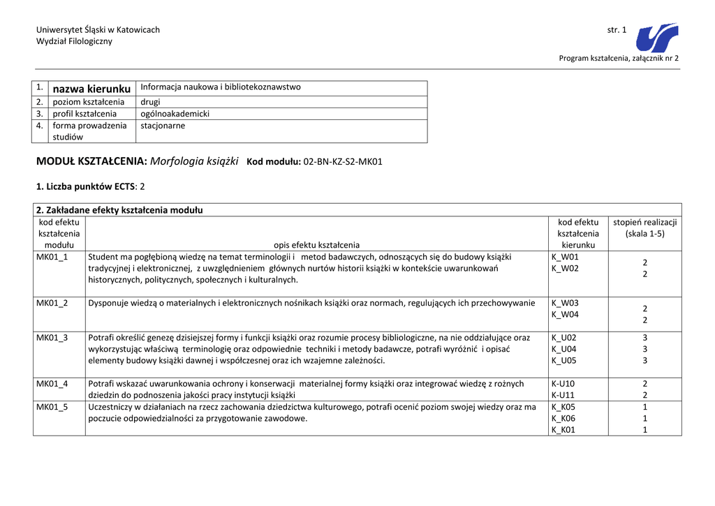 Uniwersytet Śląski w Katowicach Wydział Filologiczny str. 1 Program kształcenia, załącznik nr 2 1. nazwa kierunku Informacja naukowa i bibliotekoznawstwo 2. 3. 4. poziom kształcenia profil kształcenia forma prowadzenia studiów drugi ogólnoakademicki stacjonarne MODUŁ KSZTAŁCENIA: Morfologia książki Kod modułu: 02-BN-KZ-S2-MK01 1. Liczba punktów ECTS: 2 2. Zakładane efekty kształcenia modułu kod efektu kształcenia modułu opis efektu kształcenia MK01_1 Student ma pogłębioną wiedzę na temat terminologii i metod badawczych, odnoszących się do budowy książki tradycyjnej i elektronicznej, z uwzględnieniem głównych nurtów historii książki w kontekście uwarunkowań historycznych, politycznych, społecznych i kulturalnych. kod efektu kształcenia kierunku K_W01 K_W02 MK01_2 Dysponuje wiedzą o materialnych i elektronicznych nośnikach książki oraz normach, regulujących ich przechowywanie K_W03 K_W04 MK01_3 Potrafi określić genezę dzisiejszej formy i funkcji książki oraz rozumie procesy bibliologiczne, na nie oddziałujące oraz wykorzystując właściwą terminologię oraz odpowiednie techniki i metody badawcze, potrafi wyróżnić i opisać elementy budowy książki dawnej i współczesnej oraz ich wzajemne zależności. K_U02 K_U04 K_U05 3 3 3 MK01_4 Potrafi wskazać uwarunkowania ochrony i konserwacji materialnej formy książki oraz integrować wiedzę z rożnych dziedzin do podnoszenia jakości pracy instytucji książki Uczestniczy w działaniach na rzecz zachowania dziedzictwa kulturowego, potrafi ocenić poziom swojej wiedzy oraz ma poczucie odpowiedzialności za przygotowanie zawodowe. K-U10 K-U11 K_K05 K_K06 K_K01 2 2 1 1 1 MK01_5 stopień realizacji (skala 1-5) 2 2 2 2 Uniwersytet Śląski w Katowicach Wydział Filologiczny str. 2 Program kształcenia, załącznik nr 2 3. Opis modułu Opis Moduł ma za zadanie zapoznanie studenta z wiedzą z zakresu budowy książki tradycyjnej i elektronicznej, z uwzględnieniem materiałów i genezy jej kształtowania się, w kontekście wieloaspektowych uwarunkowań dziejów książki. Student posługując się odpowiednią terminologią oraz normami, powinien móc scharakteryzować formę oraz omówić elementy kompozycji typograficznej i wydawniczej książki dawnej i współczesnej, a także określić zasady ochrony i konserwacji poszczególnych jej nośników. Tę wiedzę ma zastosować w praktyce, rozumiejąc znaczenie podejmowanych działań na rzecz ochrony i zachowania dziedzictwa kulturowego oraz kształcenia permanentnego w tym zakresie. Wymagania wstępne modułu Elementarna wiedza z zakresu historii książki 4. Sposoby weryfikacji efektów kształcenia modułu kod MK01 _w_1 nazwa (typ) sposobu weryfikacji Prezentacja MK01 _w_2 Projekt opis szczegółowy Przygotowanie prezentacji ukazującej rozwój form i funkcji książki tradycyjnej i elektronicznej Przygotowanie projektu (praktyczne warsztaty w grupach), charakteryzującego elementy budowy książki, a także określenie uwarunkowań przechowywania, ochrony i konserwacji poszczególnych jej nośników. efekt(-y) kształcenia modułu MK01_1, MK01_3 MK01_3, MK01_4, MK01_5 5.a Formy prowadzenia zajęć (studia prowadzone w formie stacjonarnej) nazwa MK01 _fs_1 Ćwiczenia forma prowadzenia zajęć opis (z uwzględnieniem metod dydaktycznych) Studenci przygotowują projekt i prezentację, będące wynikiem przeprowadzanych w trakcie ćwiczeń konwersatoriów i warsztatów praktycznych liczba godzin 30 suma godzin: 30 praca własna studenta opis Lektura uzupełniająca, służąca aktywnemu udziałowi w zajęciach i warsztatach z materiałoznawstwa. Ich efektem jest przygotowanie prezentacji i projektu, zgodnie z wytycznymi prowadzącego. liczba godzin 30 suma godzin: 30 sposób weryfikacji efektów kształcenia MK01 _w_1, MK01 punkty ECTS 2 _w_2 suma punktów: 2