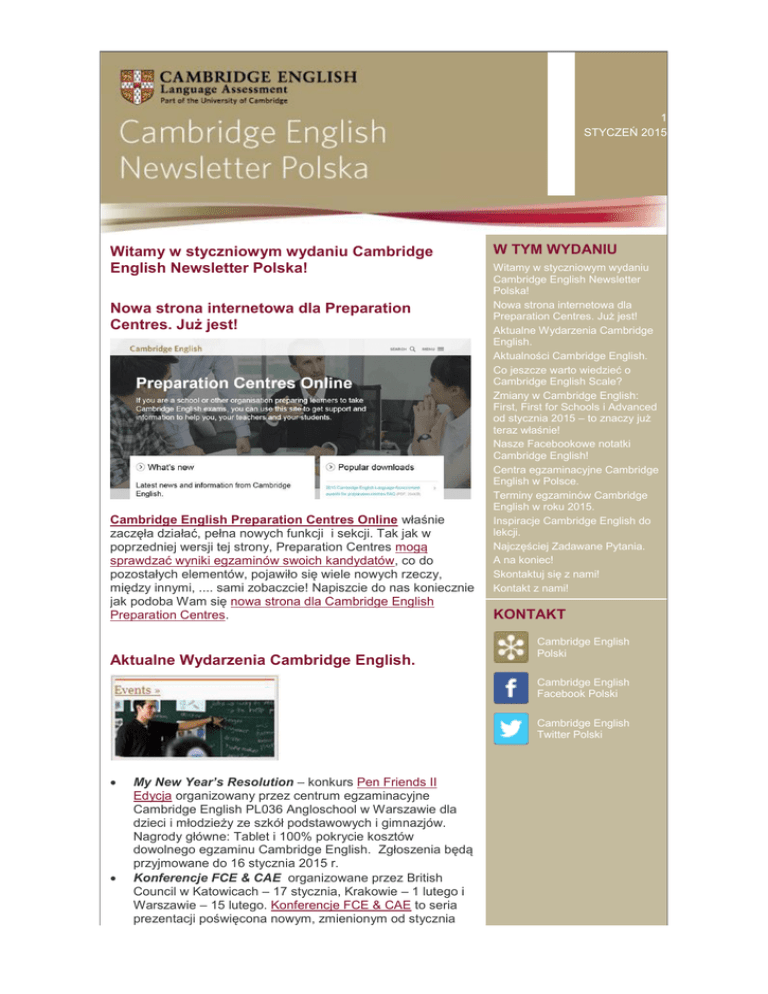 1 STYCZEŃ 2015 Witamy w styczniowym wydaniu Cambridge English Newsletter Polska! Nowa strona internetowa dla Preparation Centres. Już jest! W TYM WYDANIU Cambridge English Preparation Centres Online właśnie zaczęła działać, pełna nowych funkcji i sekcji. Tak jak w poprzedniej wersji tej strony, Preparation Centres mogą sprawdzać wyniki egzaminów swoich kandydatów, co do pozostałych elementów, pojawiło się wiele nowych rzeczy, między innymi, .... sami zobaczcie! Napiszcie do nas koniecznie jak podoba Wam się nowa strona dla Cambridge English Preparation Centres. Aktualne Wydarzenia Cambridge English. Witamy w styczniowym wydaniu Cambridge English Newsletter Polska! Nowa strona internetowa dla Preparation Centres. Już jest! Aktualne Wydarzenia Cambridge English. Aktualności Cambridge English. Co jeszcze warto wiedzieć o Cambridge English Scale? Zmiany w Cambridge English: First, First for Schools i Advanced od stycznia 2015 – to znaczy już teraz właśnie! Nasze Facebookowe notatki Cambridge English! Centra egzaminacyjne Cambridge English w Polsce. Terminy egzaminów Cambridge English w roku 2015. Inspiracje Cambridge English do lekcji. Najczęściej Zadawane Pytania. A na koniec! Skontaktuj się z nami! Kontakt z nami! KONTAKT Cambridge English Polski Cambridge English Facebook Polski Cambridge English Twitter Polski My New Year’s Resolution – konkurs Pen Friends II Edycja organizowany przez centrum egzaminacyjne Cambridge English PL036 Angloschool w Warszawie dla dzieci i młodzieży ze szkół podstawowych i gimnazjów. Nagrody główne: Tablet i 100% pokrycie kosztów dowolnego egzaminu Cambridge English. Zgłoszenia będą przyjmowane do 16 stycznia 2015 r. Konferencje FCE & CAE organizowane przez British Council w Katowicach – 17 stycznia, Krakowie – 1 lutego i Warszawie – 15 lutego. Konferencje FCE & CAE to seria prezentacji poświęcona nowym, zmienionym od stycznia 2015 roku egzaminom Cambridge English: First i Advanced. Każde spotkanie w ramach serii składa się z dwóch półtoragodzinnych sesji szkoleniowych! The Cambridge English Scale explained - webinar Cambridge English dla nauczycieli, który odbędzie się 26 stycznia i 28 stycznia, termin do wyboru. IH Consultation Days – kolejne spotkania konsultacyjne dla nauczycieli organizowane cyklicznie od początku roku szkolnego 2013/2014 przez Centrum Egzaminacyjne Cambridge English PL078 International House Katowice. 22 stycznia – spotkanie pod hasłem Appropriacy of Language, a 26 lutego, tematem przewodnim będzie Mówienie - Get your students talking! Konferencja Metodyczna IH Bydgoszcz - organizowana przez Centrum Egzaminacyjne Cambridge English PL034 International House Bydgoszcz wraz z Cambridge English Language Assessment i Cambridge University Press, które odbędzie się 30 stycznia 2015. Szczegóły i rejestracja na stronie Centrum Egzaminacyjnego Szkoła Języka Angielskiego International House Bydgoszcz. Cambridge English Fabulous Day– Dzień Otwarty Cambridge English dla nauczycieli i uczniów, który odbędzie się 20 lutego 2015 r. w Centrum Egzaminacyjnym Cambridge English PL078 International House Integra Katowice! Nauczyciele proszeni są o zgłaszanie uczniów, z którymi chcieliby przyjść na Cambridge English Fabulous Day. Start with YLE – ‘Narysuj komiks po angielsku‘ - konkurs dla uczniów szkół podstawowych organizowany przez Centrum Egzaminacyjne Cambridge English PL078 International House Integra Katowice. Prace można zgłaszać do 27 lutego. Do wygrania sporo fajnych nagród! Aiming at FCE – konkurs dla uczniów szkół gimnazjalnych i ponadgimnazjalnych organizowany przez Centrum Egzaminacyjne Cambridge English PL078 International House Integra Katowice. Prace można zgłaszać do 27 lutego. Do wygrania duże zniżki w opłacie za FCE oraz FCE for Schools i wiele innych nagród! Aktualności Cambridge English. Co jeszcze warto wiedzieć o Cambridge English Scale? Zajrzyjcie koniecznie na stronę ze wszystkimi szczegółami na temat Cambridge English Scale, a następnie sięgnijcie po garść informacji o Cambridge English Scale dla instytucji edukacyjnych. Zmiany w Cambridge English: First, First for Schools i Advanced od stycznia 2015 – to znaczy już teraz właśnie! Kiedy zaczynaliśmy wspominać o wprowadzaniu zmian od stycznia 2015, mogło się wydawać, że będzie sporo nowych rzeczy. Ale czy rzeczywiście? Tak naprawdę, wszystkie zmiany można bardzo zwięźle podsumować! Sięgnijcie więc po nasze podsumowanie. Nasze Facebookowe notatki Cambridge English! Dla kogo? – uczniów, nauczycieli, szkół, kandydatów Cambridge English i nie tylko! Gdzie? Na naszym profilu Facebook, w sekcji Notatek. Ostatnio dodaliśmy nową Notatkę z Niezbędnikiem kandydata do Cambridge English: Proficiency. Kliknijcie po szczegóły! Centra egzaminacyjne Cambridge English w Polsce. Gdzie można zdawać egzaminy Cambridge English? Zajrzyjcie na listę autoryzowanych centrów egzminacyjnych Cambridge English w Polsce i znajdzcie najbliższe centrum egzaminacyjne w Waszej okolicy! Terminy egzaminów Cambridge English w roku 2015. Kiedy można zdawać egzaminy Cambridge English? Sięgnijcie do wyszukiwarki terminów egzaminów Cambridge English. Inspiracje Cambridge English do lekcji. W styczniowym wydaniu naszego Newsletter zapraszamy do wykorzystania zadań CAE Reading and Use of English podczas lekcji! A więcej materiałów do lekcji dostępnych jest w sekcji Resources for Teachers! Najczęściej Zadawane Pytania. Czy o wyniku mojego egzaminu mogę dowiedzieć się dopiero w momecie otrzymania certyfikatu Cambridge English? Nie tylko. Jest jeszcze dodatkowa możliwość. Wyniki swojego egzaminu każdy kandydat może również sprawdzać na specjalnie przygotowanej stronie Results Online. Gdybyście mieli dalsze pytania, zapraszamy do kontaktu pod adresem emailowym [email protected] A na koniec! www.facebook.com/CambridgeEnglishPL Skontaktuj się z nam