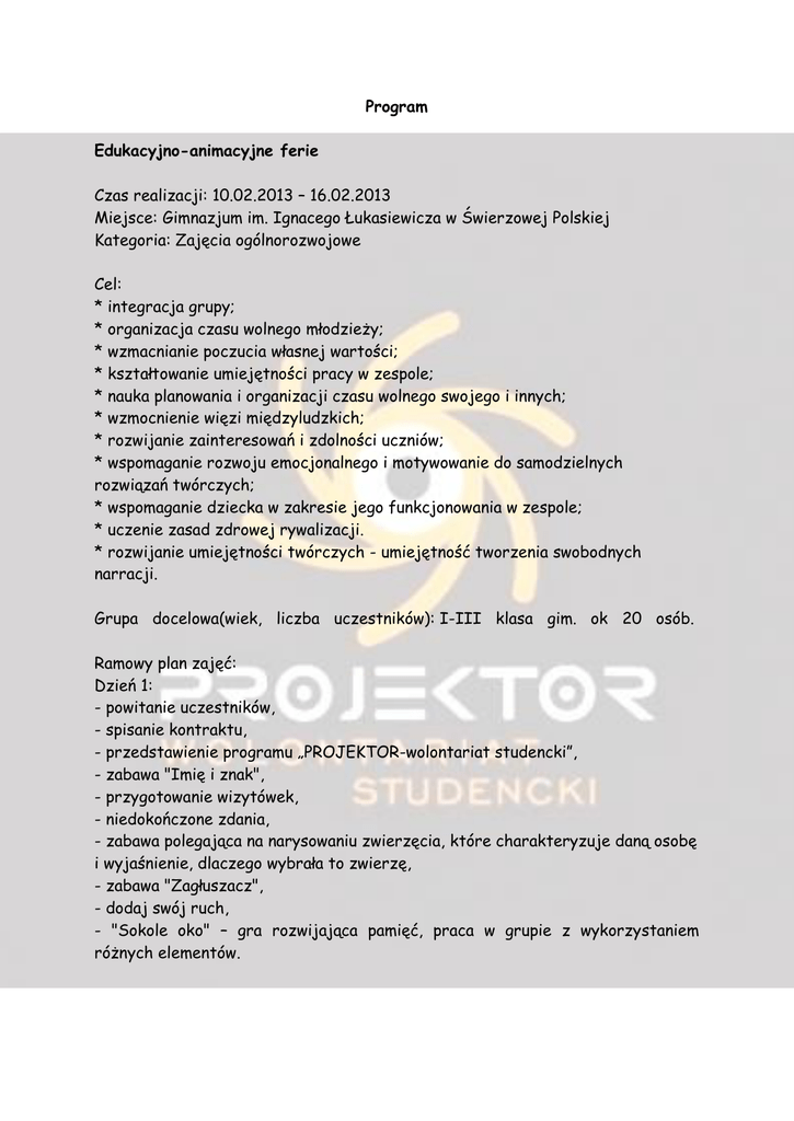 Program Edukacyjno-animacyjne ferie Czas realizacji: 10.02.2013 – 16.02.2013 Miejsce: Gimnazjum im. Ignacego Łukasiewicza w Świerzowej Polskiej Kategoria: Zajęcia ogólnorozwojowe Cel: * integracja grupy; * organizacja czasu wolnego młodzieży; * wzmacnianie poczucia własnej wartości; * kształtowanie umiejętności pracy w zespole; * nauka planowania i organizacji czasu wolnego swojego i innych; * wzmocnienie więzi międzyludzkich; * rozwijanie zainteresowań i zdolności uczniów; * wspomaganie rozwoju emocjonalnego i motywowanie do samodzielnych rozwiązań twórczych; * wspomaganie dziecka w zakresie jego funkcjonowania w zespole; * uczenie zasad zdrowej rywalizacji. * rozwijanie umiejętności twórczych - umiejętność tworzenia swobodnych narracji. Grupa docelowa(wiek, liczba uczestników): I-III klasa gim. ok 20 osób. Ramowy plan zajęć: Dzień 1: - powitanie uczestników, - spisanie kontraktu, - przedstawienie programu „PROJEKTOR-wolontariat studencki”, - zabawa "Imię i znak", - przygotowanie wizytówek, - niedokończone zdania, - zabawa polegająca na narysowaniu zwierzęcia, które charakteryzuje daną osobę i wyjaśnienie, dlaczego wybrała to zwierzę, - zabawa "Zagłuszacz", - dodaj swój ruch, - "Sokole oko" – gra rozwijająca pamięć, praca w grupie z wykorzystaniem różnych elementów. Dzień 2 * animacja językowa - zajęcia integracyjne z elementami języka rosyjskiego, niemieckiego i angielskiego; - przywitanie grupy; - powitanie wywiad cebulkowy, - wanted, - podaruj mi literkę, - powiedz mi kim jesteś, - pantomima, - gry w mieście. Dzień 3 * alternatywne metody pracy z historią m.in.: pisanie opowiadań historycznych, tworzenie własnej narracji - "Dopisane losy", Games room - historyczne gry planszowe. Dzień 4 * W świecie nauk ścisłych m.in. doświadczenia chemiczne, gry i zabawy matematyczno-logiczne; - zagadki matemetyczno-logiczne, - Efekt "Lava Lamp", - Niewidzialny atrament, - Sodowa fontanna. Dzień 5 *ćwiczenia relaksacyjne, jak radzić sobie ze stresem oraz jak tworzyć mapy skojarzeniowe i ćwiczyć pamięć. Metody, gry, zabawy wykorzystane w trakcie zajęć: burza mózgów, drama, zajęcia wykorzystujące ruch, relaksacyjne, integracyjne.
