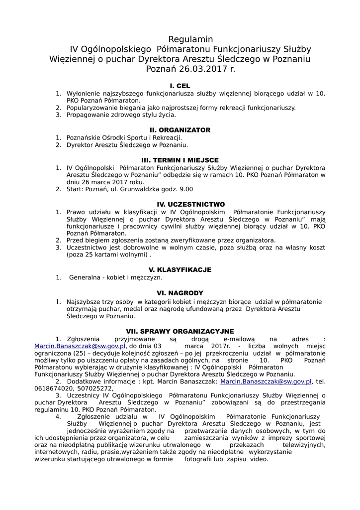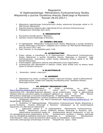 Regulamin IV Ogólnopolskiego Półmaratonu Funkcjonariuszy Służby Więziennej o puchar Dyrektora Aresztu Śledczego w Poznaniu Poznań 26.03.2017 r. I. CEL 1. Wyłonienie najszybszego funkcjonariusza służby więziennej biorącego udział w 10. PKO Poznań Półmaraton. 2. Popularyzowanie biegania jako najprostszej formy rekreacji funkcjonariuszy. 3. Propagowanie zdrowego stylu życia. II. ORGANIZATOR 1. Poznańskie Ośrodki Sportu i Rekreacji. 2. Dyrektor Aresztu Śledczego w Poznaniu. III. TERMIN I MIEJSCE 1. IV Ogólnopolski Półmaraton Funkcjonariuszy Służby Więziennej o puchar Dyrektora Aresztu Śledczego w Poznaniu” odbędzie się w ramach 10. PKO Poznań Półmaraton w dniu 26 marca 2017 roku. 2. Start: Poznań, ul. Grunwaldzka godz. 9.00 IV. UCZESTNICTWO 1. Prawo udziału w klasyfikacji w IV Ogólnopolskim Półmaratonie Funkcjonariuszy Służby Więziennej o puchar Dyrektora Aresztu Śledczego w Poznaniu” mają funkcjonariusze i pracownicy cywilni służby więziennej biorący udział w 10. PKO Poznań Półmaraton. 2. Przed biegiem zgłoszenia zostaną zweryfikowane przez organizatora. 3. Uczestnictwo jest dobrowolne w wolnym czasie, poza służbą oraz na własny koszt (poza 25 kartami wolnymi) . 1. V. KLASYFIKACJE Generalna - kobiet i mężczyzn. VI. NAGRODY 1. Najszybsze trzy osoby w kategorii kobiet i mężczyzn biorące udział w półmaratonie otrzymają puchar, medal oraz nagrodę ufundowaną przez Dyrektora Aresztu Śledczego w Poznaniu. VII. SPRAWY ORGANIZACYJNE 1. Zgłoszenia przyjmowane są drogą e-mailową na adres : [email protected], do dnia 03 marca 2017r. - liczba wolnych miejsc ograniczona (25) – decyduje kolejność zgłoszeń – po jej przekroczeniu udział w półmaratonie możliwy tylko po uiszczeniu opłaty na zasadach ogólnych, na stronie 10. PKO Poznań Półmaratonu wybierając w drużynie klasyfikowanej : IV Ogólnopolski Półmaraton Funkcjonariuszy Służby Więziennej o puchar Dyrektora Aresztu Śledczego w Poznaniu. 2. Dodatkowe informacje : kpt. Marcin Banaszczak: [email protected], tel. 0618674020, 507025272, 3. Uczestnicy IV Ogólnopolskiego Półmaratonu Funkcjonariuszy Służby Więziennej o puchar Dyrektora Aresztu Śledczego w Poznaniu” zobowiązani są do przestrzegania regulaminu 10. PKO Poznań Półmaraton. 4. Zgłoszenie udziału w IV Ogólnopolskim Półmaratonie Funkcjonariuszy Służby Więziennej o puchar Dyrektora Aresztu Śledczego w Poznaniu, jest jednocześnie wyrażeniem zgody na przetwarzanie danych osobowych, w tym do ich udostępnienia przez organizatora, w celu zamieszczania wyników z imprezy sportowej oraz na nieodpłatną publikację wizerunku utrwalonego w przekazach telewizyjnych, internetowych, radiu, prasie,wyrażeniem także zgody na nieodpłatne wykorzystanie wizerunku startującego utrwalonego w formie fotografii lub zapisu video.