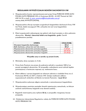 REGULAMIN WYPOŻYCZALNI BOXÓW DACHOWYCH VW 1. Wypożyczalnia boxów reprezentowana jest przez firmę PORSCHE INTER AUTO POLSKA AUTO PREMIUM VW ul. Krańcowa 40/42, 61-037 Poznań tel. 061 650 16 35, e-mail: [email protected] zwaną dalej WYPOŻYCZALNIĄ. 2. Wypożyczalnia oferuje wynajem oryginalnych bagażników dachowych firmy VW lub Thule, belek mocujących VW, uchwytów do nart oraz bagażników rowerowych. 3. Klient wypożyczalni zobowiązuje się wpłacić cały koszt wynajmu w dniu pobrania akcesoriów. Montaż i demontaż belek oraz bagażnika gratis. Cennik przedstawiono poniżej: OFERTA Wynajem bagażnika dachowego Belki dachowe, uchwyt do nart lub roweru Wypożyczenie akcesoriów powyżej tygodnia Wypożyczenie akcesoriów powyżej 2 tygodni Wypożyczenie akcesoriów powyżej 3 tygodni CENA/DOBĘ 50 zł 30 zł - 5 zł/szt - 10 zł/szt - 15 zł/szt Wszystkie ceny w cenniku są cenami brutto. 4. Minimalny okres wynajmu to 3 dni. 5. Firma Auto Premium ma prawo do pobrania zaliczki w wysokości 500 zł na poczet wynajętych akcesoriów. W przypadku uszkodzenia zwrot zaliczki będzie pomniejszony o konieczne naprawy np. malowanie boxu. 6. Klient odbiera i zwraca bagażnik we własnym zakresie w siedzibie firmy na ul. Krańcowej 40/42, 61-037 w Salonie VW. Istnieje możliwość odbioru wyposażonych artykułów od klienta na terenie Poznania – koszt 50 zł. 7. Wypożyczalnia wykonuje zdjęcie samochodu z zamontowanym bagażnikiem. 8. Wypożyczający powinien posiadać dowód rejestracyjny samochodu, na którym zostanie zamontowany bagażnik oraz dowód osobisty. 9. Bagażnik rezerwujemy przy wpłacie 50 zł, w przypadku rezygnacji, kaucja przepada. 10. Ostateczna interpretacja Regulaminu należy do PORSCHE INTER AUTO POLSKA AUTO PREMIUM VW.