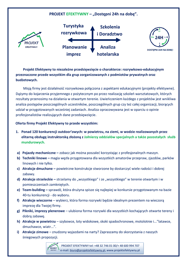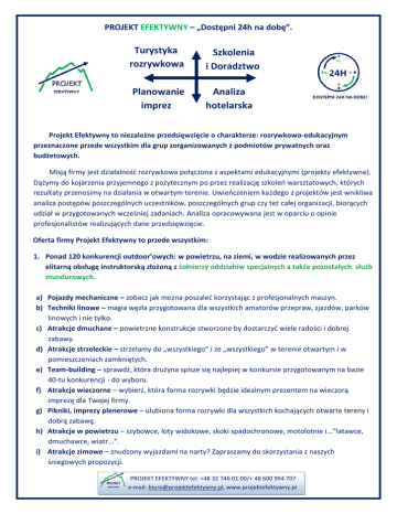PROJEKT EFEKTYWNY – „Dostępni 24h na dobę”. Turystyka rozrywkowa Szkolenia i Doradztwo Planowanie imprez Analiza hotelarska Projekt Efektywny to niezależne przedsięwzięcie o charakterze: rozrywkowo-edukacyjnym przeznaczone przede wszystkim dla grup zorganizowanych z podmiotów prywatnych oraz budżetowych. Misją firmy jest działalnośd rozrywkowa połączona z aspektami edukacyjnymi (projekty efektywne). Dążymy do kojarzenia przyjemnego z pożytecznym po przez realizację szkoleo warsztatowych, których rezultaty przenosimy na działania w otwartym terenie. Uwieoczeniem każdego z projektów jest wnikliwa analiza postępów poszczególnych uczestników, poszczególnych grup czy też całej organizacji, biorących udział w przygotowanych wcześniej zadaniach. Analiza opracowywana jest w oparciu o opinie profesjonalistów realizujących dane przedsięwzięcie. Oferta firmy Projekt Efektywny to przede wszystkim: 1. Ponad 120 konkurencji outdoor’owych: w powietrzu, na ziemi, w wodzie realizowanych przez elitarną obsługę instruktorską złożoną z żołnierzy oddziałów specjalnych a także pozostałych służb mundurowych. a) Pojazdy mechaniczne – zobacz jak można poszaled korzystając z profesjonalnych maszyn. b) Techniki linowe – magia węzła przygotowana dla wszystkich amatorów przepraw, zjazdów, parków linowych i nie tylko. c) Atrakcje dmuchane – powietrzne konstrukcje stworzone by dostarczyd wiele radości i dobrej zabawy. d) Atrakcje strzeleckie – strzelamy do „wszystkiego” i ze „wszystkiego” w terenie otwartym i w pomieszczeniach zamkniętych. e) Team-building – sprawdź, która drużyna spisze się najlepiej w konkursie przygotowanym na bazie 40-tu konkurencji - do wyboru. f) Atrakcje wieczorne – wybierz, która forma rozrywki będzie idealnym prezentem na wieczorą imprezę dla Twojej firmy. g) Pikniki, imprezy plenerowe – ulubiona forma rozrywki dla wszystkich kochających otwarte tereny i dobrą zabawę. h) Atrakcje w powietrzu – szybowce, loty widokowe, skoki spadochronowe, motolotnie i...”latawce, dmuchawce, wiatr...”. i) Atrakcje zimowe – znudzony wyjazdami na narty? Zapraszamy do skorzystania z naszych śniegowych propozycji. PROJEKT EFEKTYWNY tel: +48 32 746 01 00/+ 48 600 994 707 e-mail: [email protected], www.projektefektywny.pl 2. Praktyczne warsztaty i doradztwo prowadzone w oparciu o najefektywniejsze metody podnoszenia kwalifikacji kadry pracowniczej. Akademia Sprzedaży(AS): Akademia Managera(AM): - techniki sprzedaży, - rozwój kompetencji kierowniczychmotywowanie, kontrolowanie i coaching pracowników, - negocjacje handlowe, - profesjonalna obsługa klienta, - rekrutacja i selekcja personelu jako umiejętnośd kierownika, - telefoniczna obsługa klienta. - zarządzanie czasem i wyznaczanie celów, Rozwoj Osobowości Lidera (RL). - rozwój efektywności osobistej lidera, - coaching indywidualny, - doradztwo stylisty, - doradztwo indywidualne, -wsparcie psychologa. - asertywnośd i techniki wpływu społecznego, - budowanie zespołów roboczych, - sztuka rozwiązywania konfliktów. - walka ze stresem, 3. Meeting planning (planowanie wydarzeo) - nieodłącznym elementem dobrze przygotowanej - kreowanie wizerunku firmy – public imprezy a przede wszystkim bezproblemowego jej przebiegu są działania z zakresu „meeting relations. planning”. Możemy w tym miejscu odnieśd się do polskiego odpowiednika i zaryzykowad określenie „tworzenie scenariuszy spotkao” (imprez firmowych, konferencji, szkoleo etc.). Do usług świadczonych przez nas w zakresie meeting planning zaliczamy: a) Wyznaczanie elementarnych aspektów przebiegu całej imprezy (pobytu, wyjazdu, konferencji itp.), czyli głównych punktów odniesienia, na bazie których budowad będziemy plan wydarzenia. b) Przygotowanie pełnego planu przebiegu całości wydarzenia w ujęciu czasowym wraz z opcjami zastępczymi (awaryjnymi). c) Pełne wsparcie logistyczne (organizacja terenów pod zajęcia outdoor, transport, ubezpieczenia, umiejscowienie zdarzeo w przestrzeni oraz czasie). d) Selektywny dobór kadry wykonawców mających adekwatne doświadczenie w realizacji każdego z punktów programu. (firm szkoleniowych, incentive, obiektów hotelowych itp.). e) Sporządzenie finalnego konspektu podsumowującego przebieg całości wydarzenia. W tym przypadku używamy podejścia analitycznego opierając się na narzędziach generujących obiektywne wnioski co do poprawności podjętych wcześniej decyzji. Naszą przewagą nad konkurencją jest rozbudowana świadomośd o złożoności każdego z wydarzeo i o niesłychanie istotnych nawet najdrobniejszych szczegółach imprez, bez udziału których żaden z event’ów nie zostanie zrealizowany w 100 procentach. PROJEKT EFEKTYWNY tel: +48 32 746 01 00/+ 48 600 994 707 e-mail: [email protected], www.projektefektywny.pl 4. Analiza hotelarska - sprawdź czy dany hotel spełni Twoje oczekiwania. a) Podczas przygotowywania konkretnej oferty dla Paostwa dokonujemy szczegółowej analizy potencjalnych obiektów o charakterze hotelarskim, gastronomicznym oraz konferencyjnym w jakich może odbyd się dane wydarzenie lub seria wydarzeo. b) Drugim rodzajem analizy obiektów hotelowych jest kompleksowa analiza efektywności współpracy z danym obiektem. Jest to proces o wiele bardziej złożony oraz z samego założenia oceniający przydatnośd określonego obiektu do współpracy na dłuższy okres czasu. Taki rodzaj analizy proponujemy podmiotom szukającym miejsca na więcej niż 2 pobyty (np. seria szkoleo). Analiza oparta jest na profesjonalnych narzędziach stosowanych przez naszą komórkę do spraw współpracy z hotelami. Osoby pracujące w dziale ds. hoteli posiadają doświadczenie wywodzące się ze stanowisk kierowniczych działów recepcyjnych, marketingu, zarządzania. Przydatnośd narzędzi opisanych powyżej była szczególnie niedoceniania przez wielu organizatorów turystycznych w ostatnich latach, d