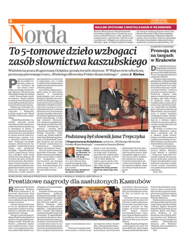 TYGODNIK KARTUZY 25 października 2013 r. 6 KOLEJNE SPOTKANIE Z MUZYKĄ KASZUB W WEJHEROWIE Muzeum Piśmiennictwa i Muzyki KaszubskoPomorskiej w Wejherowie (ul. Zamkowej 2a) zaprasza na XXXVII koncert z cyklu „Spotkania z muzyką Kaszub”, zatytułowany „Kaszuby w pieśni artystycznej”. Odbędzie się w sobotę, 26 października, o godz. 18. Wstęp bezpłatny. W progra- mie wieczoru znajdą się nieznane utwory Jana Michała Wieczorka, Feliksa Nowowiejskiego, Łucjana Kamieńskiego, Władysława Walentynowicza, Jana Trepczyka, Tadeusza Tylewskiego, Witosławy Frankowskiej, Aleksandra Żurbina inspirowane muzyką i poezją kaszubską. (bw) KASZUBY I GDAŃSK To5-tomowedziełowzbogaci zasóbsłownictwakaszubskiego Promują się na targach w Krakowie D P przezKaszubównacodzieńiteż te zapomniane, m.in. z myślą omożliwościichodrodzeniawe współczesnej kaszubszczyźnie mówionej i pisanej. Autor dzieła, Eugeniusz Gołąbek należy do osób dobrze znanych w środowisku kaszubologów, choć, jak podkreślaprof.Cybulski,niemawykształceniafilologicznego,zzawodu jest bowiem technikiem elektrykiem.Gołąbek jużodponad 30 lat uczestniczy w życiu kulturalnymKaszub,wrozwoju piśmiennictwa kaszubskiego, aprzedewszystkimwformowaniuodmianyogólnej(literackiej) języka kaszubskiego, w kilku jego stylowych odmianach, m.in.naukowej,szczególniejednak sakralnej i publicystycznej. Kaszubi zawdzięczają mu pierwsze i zarazem pełne „Skaszëbioné Swięté Pismiona Nowégo Testamńtu” (1993), a także całą „Knéga Psalmów” (1999)ikaszubskąwersjęlekcjonarza„To jeSłowoBożé”(2007). Jego autorstwa jest pierwszy w dziejach standaryzacji kaszubszczyzny - „Kaszëbsczi słoworz normatiwny” (2005). Słownik wydało Zrzeszenie Kaszubsko-Pomorskie, każda szkołaotrzymujegobezpłatnie. Można go też kupić w niektórych księgarniach, m.in. internetowych. Jest dostępny także w wejherowskim muzeum. Koszt pierwszego, 600stronicowego tomu to 45 zł. W sumie będzie ich pięć. (jk) FOT.JOANNAKIELAS Wieloletnia praca Eugeniusza Gołąbka ujrzała światło dzienne. W Wejherowie odbyła się promocja pierwszego tomu „Wielkiego Słownika Polsko-Kaszubskiego” - pisze J. Kielas romocjatejksiążkito dla nas wielkie wydarzenie, trudno sobie wyobrazić dla niej miejsce idealniejsze odnaszego, wszak jesteśmy Muzeum Piśmiennictwa iMuzykiKaszubsko-Pomorskiej - mówił Tomasz Fopke, dyrektor muzeum. - Mamy nadzieję, że wydanie słownika przyczyni się do ogólnej dyskusji nad stanem kaszubszczyzny obecnie. Wydarzenie uświetniło Towarzystwo Śpiewacze im. Jana Trepczyka z Wejherowa, laudację wygłosił prof. Marek Cybulski z Uniwersytetu Gdańskiego. -„WielkiSłownikPolsko-Kaszubski” gromadzi przede wszystkim w pełni udokumentowanesłownictwo(zawartenp. w słownikach B. Sychty, F. LorentzaiS.Ramułta)orazsłownictwotworzoneiasymilowane na użytek nowych funkcji kaszubszczyzny, zawarte m.in. w „Słowniku Polsko-Kaszubskim” Trepczyka i we współczesnym piśmiennictwie kaszubskim - wyjaśniał prof. Jerzy Treder, autor przedmowy doksiążki. - Ztegosłownikakorzystać mogą wszyscy, którzy chcą wzbogacić zasób swego słownictwa kaszubskiego tak w mowie, jak i przy tworzeniu tekstów pisanych. Słownik bowiem w miarę możności i oczywiścieograniczonejliczbyuwzględnianychźródeł,maprezentować jak najbogatszy zbiór słownictwa, wyrazy używane Drugi tom słownika najprawdopodobniej ukaże się w grudniu - zapowiedział Eugeniusz Gołąbek Podstawą był słownik Jana Trepczyka Z Eugeniuszem Gołąbkiem, autorem „Wielkiego Słownika Polsko-Kaszubskiego”, rozmawia Joanna Kielas Wtorkowa promocja „Wielkiego Słownika” to dopiero początek drogi... Pierwszy tom obejmuje litery od A do K. Ma 600 stron i podobnej objętości będą kolejne wydania. Planowanych jest 5 tomów. Kiedy możemy spodziewać się całości słownika? Jeszcze w tym roku światło dzienne ujrzy prawdopodobnie druga część. W grudniu planowane jest wydanie kolejnego tomu słownika, od litery L do P. Całość składać się będzie z pięciu tomów, z których ostatni pojawi się w 2016 roku. Takie są plany. Podstawą był dla mnie słownik Jana Trepczyka. Dodałem część wyrazów nowych, które się pojawiły, odjąłem te, których się nie używa. Poukładałem wszystko po swojemu. Oczywiście korzystałem też z wielu innych książek. Słownik zawiera też idiomy, obszernie traktuje związki frazeologiczne. (jk) Zdradzi Pan kulisy powstawania tak obszernego dzieła? o niedzieli potrwają 17. TargiKsiążkiwKrakowie. WramachimprezyprzygotowanoSalonMałeOjczyzny. W tym roku jego gospodarzami są Kaszuby i Gdańsk. - Przygotowując kaszubskogdańskisalonnaTargachKsiążki chcieliśmyprzybliżyćspecyfikę kulturową Kaszub oraz wyjątkowy klimat dawnego i współczesnego Gdańska - tłumaczą pomorscyuczestnicyimprezy.Doskonale zdajemy sobie sprawę,żeKaszubysączęstopostrzegane jako dobre miejsce do spędzenia urlopu, gdzie wjednymmiejscumamymorze, jeziora,lasyimalowniczewzgórza. I skąd blisko do Gdańska, gdzie najchętniej odwiedza się GłówneMiasto.AleprzecieżKaszuby to przede wszystkim mieszkającytuludzie-ichhistoria,język,kultura,naktórąskładają się w równym stopniu współczesna literatura piękna, muzyka i sztuki plastyczne, jak i ciągle żywy folklor. Nie byłoby to możliwe bez edukacji (kilkanaście tysięcy dzieci i młodzieży uczy się w szkołach języka kaszubskiego), bez badań naukowych i popularyzacji wiedzy, bez mediów,internetuorazaktywności obywatelskiej i animacyjnej. W programie przygotowanym przez Instytut Kaszubski, Instytut Kultury Miejskiej, Urząd Miejski w Gdańsku i Zrzeszenie Kaszubsko-Pomorskie znalazły się wystawy, panele dyskusyjne, promocje książek. Ponadto będzie można posłuchać tradycyjnej i współczesnej muzyki kaszubskiej oraz spróbować potraw kuchni regionalnej. (oprac. MA) WRĘCZONO MEDALE ŚWIĘTEGO WOJCIECHA I ME