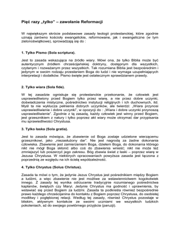 Pięć razy „tylko” – zawołanie Reformacji W największym skrócie podstawowe zasady teologii protestanckiej, które zgodnie uznają zarówno kościoły ewangelickie, reformowane, jak i ewangeliczne (w tym zielonoświątkowe), sprowadzają się do : 1. Tylko Pismo (Sola scriptura). Jest to zasada wskazująca na źródło wiary. Mówi ona, że tylko Biblia może być autentycznym źródłem chrześcijańskiej doktryny, dostępnym dla wszystkich, czytanym i rozważanym przez wszystkich. Tak rozumiana Biblia jest bezpośrednim i jedynym w swoim rodzaju przesłaniem Boga do ludzi i nie wymaga uzupełniających interpretacji i dodatków. Pismo święte jest ostatecznym sprawdzianem prawdy. 2. Tylko wiara (Sola fide). W tej zasadzie ogniskuje się protestanckie przekonanie, że człowiek jest usprawiedliwiony przed Bogiem tylko przez wiarę, a nie przez dobre uczynki, doświadczenia mistyczne, pośrednictwo instytucji religijnych i ich duchownych, itd. Myśl ta nie wyklucza pełnienia dobrych uczynków, ale twierdzi: „Wiara przynosi usprawiedliwienie i dobre uczynki”, w opozycji do : „Wiara i dobre uczynki przynoszą usprawiedliwienie”. Zgodnie z tą zasadą, każdy człowiek jest winny przed Bogiem, jest grzesznikiem z natury i tylko poprzez akt wiary może otrzymać dar przypisania mu sprawiedliwości Chrystusa. 3. Tylko łaska (Sola gratia). Jest to zasada mówiąca, że zbawienie od Boga zostaje udzielone wierzącemu grzesznikowi, jako „niezasłużony dar”. Nie jest nagrodą za żadne dokonania człowieka. Zbawienie jest zamierzeniem Boga, dziełem Boga, do dokonania którego nikt nie mógł Boga skłonić albo coś do zbawienia wnieść; nikt nie może też zmniejszyć lub poszerzyć jego zakresu. Bóg zbawia świat z łaski – poprzez wiarę w Jezusa Chrystusa. W niektórych opracowaniach powyższa zasada jest łączona z poprzednią ze względu na ich ścisłą współzależność. 4. Tylko Chrystus (Solus Christus). Zasada ta mówi o tym, że jedynie Jezus Chrystus jest pośrednikiem między Bogiem a ludźmi, a więc zbawienie nie jest możliwe za wstawiennictwem kogokolwiek innego. Z zasady tej wynika odrzucenie tradycyjnie rozumianego pośrednictwa kapłanów, świętych czy Maryi. Jedynie Chrystus ma godność i uprawnienia, by wstawiać się przed Bogiem za ludźmi. Zasada ta podkreśla również bezpośrednie prawo każdego chrześcijanina do kontaktu z Bogiem poprzez Chrystusa, do osobistej modlitwy i pogłębionej relacji. Według tej zasady, również Chrystus pozostaje w bliskim, aktywnym kontakcie ze swoimi uczniami we wszystkich ludzkich pokoleniach, aż do swojego powtórnego przyjścia (paruzji). 5. Tylko Bogu chwała (Soli Deo gloria). Ta zasada mówi o tym, że jedynie Bogu może oddawana być wszelka chwała, ponieważ zbawienie dokonuje się z Jego woli i w wyniku Jego działania. Wiara w zbawcze dzieło Chrystusa na krzyżu wzbudzana jest w sercu grzesznika poprzez pracę Ducha Świętego, który przypomina i potwierdza opisane w Piśmie dzieło Boga. Skoro tylko Bóg zbawia, tylko Bogu należna jest cześć. Z zasady tej wynika odrzucenie przez protestantów kultu aniołów i świętych, a także relikwii i wizerunków, ponieważ człowiek powinien czcić Stwórcę, a nie stworzenie. Opr. Pastor Henryk Karasiewicz