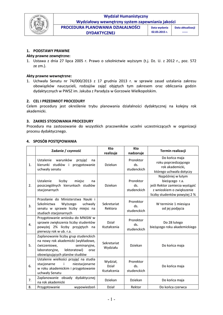 Wydział Humanistyczny Wydziałowy wewnętrzny system zapewniania jakości Data wydania Data aktualizacji PROCEDURA PLANOWANIA DZIAŁALNOŚCI 02.03.2015 r. -----DYDAKTYCZNEJ 1. PODSTAWY PRAWNE Akty prawne zewnętrzne: 1. Ustawa z dnia 27 lipca 2005 r. Prawo o szkolnictwie wyższym (t.j. Dz. U. z 2012 r., poz. 572 ze zm.). Akty prawne wewnętrzne: 1. Uchwała Senatu nr 74/000/2013 z 17 grudnia 2013 r. w sprawie zasad ustalania zakresu obowiązków nauczycieli, rodzajów zajęć objętych tym zakresem oraz obliczania godzin dydaktycznych w PWSZ im. Jakuba z Paradyża w Gorzowie Wielkopolskim. 2. CEL I PRZEDMIOT PROCEDURY Celem procedury jest określenie trybu planowania działalności dydaktycznej na kolejny rok akademicki. 3. ZAKRES STOSOWANIA PROCEDURY Procedura ma zastosowanie do wszystkich pracowników uczelni uczestniczących w organizacji procesu dydaktycznego. 4. SPOSÓB POSTĘPOWANIA Kto realizuje Kto nadzoruje 1. Ustalenie warunków przyjęć na kierunki studiów i przygotowanie uchwały senatu Dziekan Prorektor ds. studenckich 2. Ustalenie liczby miejsc na poszczególnych kierunkach studiów stacjonarnych Dziekan Prorektor ds. studenckich Sekretariat Rektora Prorektor ds. studenckich W terminie 1 miesiąca od jej podjęcia Dział Kształcenia Prorektor ds. studenckich Do 28 lutego bieżącego roku akademickiego Sekretariat Wydziału Dziekan Do końca maja Wydział, Dział Kształcenia Prorektor ds. studenckich Do końca maja Dziekan Dziekan Do końca maja Dział Rektor Do końca czerwca Zadanie / czynność 3. 4. 5. 6. 7. 8. Przesłanie do Ministerstwa Nauki i Szkolnictwa Wyższego uchwały senatu w sprawie liczby miejsc na studiach stacjonarnych Przygotowanie wniosku do MNiSW w sprawie zwiększenia liczby studentów powyżej 2% liczby przyjętych na pierwszy rok w ub. r.a. Zaplanowanie liczby grup studenckich na nowy rok akademicki (wykładowe, ćwiczeniowe, seminaryjne, laboratoryjne, lektoratowi) oraz obowiązujących planów studiów Ustalenie wielkości przyjęć na studia stacjonarne i niestacjonarne w roku akademickim i przygotowanie uchwały Senatu Zaplanowanie obsady dydaktycznej na rok akademicki Przygotowanie wypowiedzeń -1- Termin realizacji Do końca maja roku poprzedzającego rok akademicki, którego uchwała dotyczy Najpóźniej w lutym bieżącego r.a. jeśli Rektor zamierza wystąpić z wnioskiem o zwiększenie liczby studentów powyżej 2 % Wydział Humanistyczny Wydziałowy wewnętrzny system zapewniania jakości Data wydania Data aktualizacji PROCEDURA PLANOWANIA DZIAŁALNOŚCI 02.03.2015 r. -----DYDAKTYCZNEJ warunków pracy 9. 10. 11. 12. 13. 14. 15. 16. 17. Zgłoszenie zapotrzebowania na nowych pracowników Przeprowadzenie konkursów na nowe stanowiska pracy i zatrudnienie nowych pracowników Przekazanie do zatwierdzenia liczby grup studenckich na poszczególnych kierunkach i formach studiów Ustalenie rozkładów zajęć i podanie studentom do wiadomości Wprowadzenie obsady dydaktycznej w arkuszu Excela i przekazanie do Działu Kształcenia Ustalenie zakresów obowiązków nauczycieli na nowy rok akademicki i wystąpienie do Rektora z wnioskami o obniżenie pensum dydaktycznego nauczycieli Sporządzenie wykazu pracowników do Działu Kształcenia Sprawdzanie obsady dydaktycznej z obowiązującymi planami studiów i drukowanie przydziałów Weryfikacja liczby grup studenckich po semestrze zimowym w związku z wyborem przez studentów specjalności lub zmniejszeniem liczby studentów OrganizacyjnoPrawny i Kadr Dziekan Rektor Przed ogłoszeniem konkursu Dział OrganizacyjnoPrawny i Kadr Rektor 14 dni przed datą zatrudnienia Sekretariat Wydziału Dziekan Do 20 września Sekretariat Wydziału Dziekan Tydzień przed rozpoczęciem roku akademickiego Sekretariat Wydziału Dziekan Do 5 października Dziekan Dziekan Do 20 września Dział OrganizacyjnoPrawny i Kadr Rektor Do 5 października Dział Kształcenia Prorektor ds. studenckich Do końca listopada Dziekan Rektor Przed zaplanowaniem zajęć w semestrze letnim 5. ZAŁĄCZNIKI Załącznik nr 1 - Wzór tabeli do zatwierdzenia liczby grup. Załącznik nr 2 - Wzór przydziału dydaktycznego. -2-