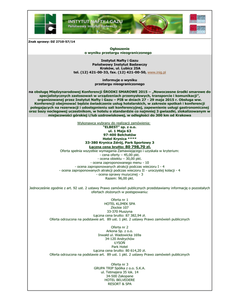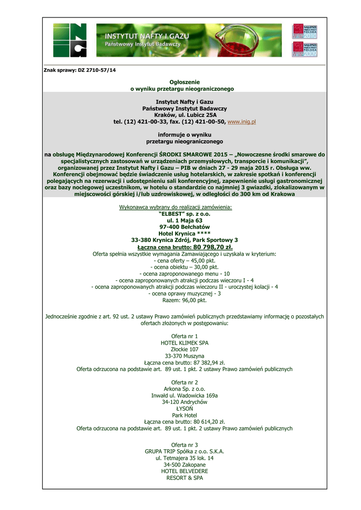 Znak sprawy: DZ 2710-57/14 Ogłoszenie o wyniku przetargu nieograniczonego Instytut Nafty i Gazu Państwowy Instytut Badawczy Kraków, ul. Lubicz 25A tel. (12) 421-00-33, fax. (12) 421-00-50, www.inig.pl informuje o wyniku przetargu nieograniczonego na obsługę Międzynarodowej Konferencji ŚRODKI SMAROWE 2015 – „Nowoczesne środki smarowe do specjalistycznych zastosowań w urządzeniach przemysłowych, transporcie i komunikacji”, organizowanej przez Instytut Nafty i Gazu – PIB w dniach 27 - 29 maja 2015 r. Obsługa ww. Konferencji obejmować będzie świadczenie usług hotelarskich, w zakresie spotkań i konferencji polegających na rezerwacji i udostępnieniu sali konferencyjnej, zapewnienie usługi gastronomicznej oraz bazy noclegowej uczestnikom, w hotelu o standardzie co najmniej 3 gwiazdki, zlokalizowanym w miejscowości górskiej i/lub uzdrowiskowej, w odległości do 300 km od Krakowa Wykonawca wybrany do realizacji zamówienia: “ELBEST” sp. z o.o. ul. 1 Maja 63 97-400 Bełchatów Hotel Krynica **** 33-380 Krynica Zdrój, Park Sportowy 3 Łączna cena brutto: 80 798,70 zł. Oferta spełnia wszystkie wymagania Zamawiającego i uzyskała w kryterium: - cena oferty – 45,00 pkt. - ocena obiektu – 30,00 pkt. - ocena zaproponowanego menu - 10 - ocena zaproponowanych atrakcji podczas wieczoru I - 4 - ocena zaproponowanych atrakcji podczas wieczoru II - uroczystej kolacji - 4 - ocena oprawy muzycznej - 3 Razem: 96,00 pkt. Jednocześnie zgodnie z art. 92 ust. 2 ustawy Prawo zamówień publicznych przedstawiamy informację o pozostałych ofertach złożonych w postępowaniu: Oferta nr 1 HOTEL KLIMEK SPA Złockie 107 33-370 Muszyna Łączna cena brutto: 87 382,94 zł. Oferta odrzucona na podstawie art. 89 ust. 1 pkt. 2 ustawy Prawo zamówień publicznych Oferta nr 2 Arkona Sp. z o.o. Inwałd ul. Wadowicka 169a 34-120 Andrychów ŁYSOŃ Park Hotel Łączna cena brutto: 80 614,20 zł. Oferta odrzucona na podstawie art. 89 ust. 1 pkt. 2 ustawy Prawo zamówień publicznych Oferta nr 3 GRUPA TRIP Spółka z o.o. S.K.A. ul. Tetmajera 35 lok. 14 34-500 Zakopane HOTEL BELVEDERE RESORT & SPA Oferta spełnia wszystkie wymagania Zamawiającego i uzyskała w kryterium: - cena oferty – 39,00 pkt. - ocena obiektu – 30,00 pkt. - ocena zaproponowanego menu - 8 - ocena zaproponowanych atrakcji podczas wieczoru I - 5 - ocena zaproponowanych atrakcji podczas wieczoru II - uroczystej kolacji - 4 - ocena oprawy muzycznej - 3 Razem: 89,00 pkt. Dyrektor Instytutu Nafty i Gazu Państwowego Instytutu Badawczego Maria Ciechanowska 8 października 2014r.