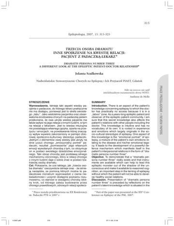 315 Epileptologia, 2007, 15: 315-325 TRZECIA OSOBA DRAMATU INNE SPOJRZENIE NA KWESTIĘ RELACJI: PACJENT Z PADACZKĄ-LEKARZ * DRAMATIS PERSONA NUMBER THREE A DIFFERENT LOOK AT THE EPILEPTIC PATIENT-DOCTOR RELATIOSHIP** Jolanta Szulkowska Nadwiślańskie Stowarzyszenie Chorych na Epilepsję i Ich Przyjaciół PIAST, Gdańsk Anthony de Mello 4-2007.p65 STRESZCZENIE SUMMARY Wprowadzenie. Istnieje taki aspekt wiedzy pacjenta o padaczce, do którego lekarz praktycznie nie ma dostępu, ponieważ jest to strefa swoistego „tabu”. Jako wieloletnia pacjentka oraz obserwatorka środowiska chorych na padaczkę jestem przekonana, że owa ukryta wiedza pacjenta ma także wpływ na jego relacje z innymi ludźmi, w tym na relacje z lekarzem. Jest to wiedza intuicyjna nie posiadająca własnego języka, oparta na przeżyciu i emocjach, na powstawanie której znaczący wpływ wywiera zakorzeniony w pamięci zbiorowej społeczno-kulturowy stereotyp padaczki. Jednym z elementów owej wiedzy jest ukryty na dnie uczuć chorego „emocjonalny portret” padaczki, rezultat „pomieszania” jego własnych emocji wywołanych chorobą z tym, co otrzymuje on w postaci swoistego dziedzictwa emocjonalnego. Taki obraz choroby jest podstawą silnego mechanizmu obronnego, który w relacji chorego z innymi ludźmi daje o sobie znać w postaci tzw. trzeciej osoby dramatu. Cel. Pokazanie, że coś takiego, jak „trzecia osoba dramatu” rzeczywiście istnieje oraz – że istnieją narzędzia, za pomocą których można to padaczkowe monstrum wyprowadzić z cienia nieświadomości i uczynić dostępne poznaniu rozumowemu, co stanowi w oswajaniu choroby istotny krok, od którego zależy budowanie przez chorego prawidłowych, zdrowych relacji społecz- Introduction. There is an aspect of the patient’s knowledge concerning epilepsy to which the doctor has practically no access because it is in a „taboo” zone. As a years-long epileptic patient and observer of the epileptic patient community, I am sure that this secret knowledge also affects the patient’s relations with other people including the doctor. This knowledge is intuitive and has no vocabulary of its own. It is rooted in experience and emotions which largely originate in the socio-cultural stereotype of epilepsy. One aspect of this knowledge is the “emotional portrait” of epilepsy, a mixture of the patient’s own emotions relating to the disease and his/her emotional legacy. It leads to the development of a powerful defence mechanism which manifests itself in the patient’s interpersonal relations in the form of “dramatis persona number three”. Objective. To demonstrate that a “dramatis persona number three” really exists and that instruments are available which can help to lead this epileptic monster out of the shadow of the unconscious and make it available to reasoned cognition, an important step in the taming of epilepsy without which the patient will not be able to develop healthy social relations. Discussion. Presentation of “dramatis persona number three” is preceded by reflections on the patient’s latent knowledge which is situated in the * Praca została przedstawiona na XX Konferencji nt. Padaczki PTE w 2007 r. * Part of the paper was presented at the XXth Conference on Epilepsy of the PSE, 2007. 315 07-11-26, 21:48 PRACE PRZEGLĄDOWE • REVIEW PAPERS Nikt się jeszcze nie upił intelektualnym rozumieniem słowa WINO. 316 PRACE PRZEGLĄDOWE • REVIEW PAPERS Jolanta Szulkowska 4-2007.p65 nych. Omówienie. Relację dotyczącą „trzeciej osoby dramatu” poprzedzam rozważaniami na temat ukrytej wiedzy pacjenta, sytuując ją bardziej po stronie współczesnej „mądrości ludowej”, opartej na wiedzy intuicyjnej czerpanej bezpośrednio z życiowego doświadczenia niż po stronie wiedzy opartej na intelekcie i nauce. Pacjent ma do takiej wiedzy pełne prawo, a lekarz nie tylko powinien mu to prawo przyznać, ale podejść do owej wiedzy z powagą i zrozumieniem. Wnioski. Zauważalnym faktem jest brak u lekarzy odpowiedniej wiedzy psychologicznej i w związku z tym niedocenianie siły społeczno-kulturowego stereotypu padaczki – źródła wielu mechanizmów obronnych utrudniających relacje społeczne, przez co lekarz staje się także współtwórcą „języka sekretnego”. realm of contemporary “folk wisdom” based on knowledge intuitively and directly gleaned from practical experience rather than based on science and intellect. The patient has every right to this knowledge and not only must the doctor acknowledge this right, but also approach this with consideration and understanding. Conclusions. Doctors lack sufficient psychological knowledge and therefore tend to overlook the strength of the socio-cultural stereotype of epilepsy, source of many defence mechanisms impeding good social relations. Hence the doctor involuntarily helps to create this “secret language”. Key words: Epileptic patient-Doctor relations – The social stereotype of epilepsy – The role of emotions in epilepsy Słowa kluczowe: Relacje pacjent z padaczką-lekarz – Społeczny stereotyp padaczki – Rola emocji w padaczce WPROWADZENIE K ilka miesięcy temu profesor Jerzy Majkowski poprosił mnie, bym wystąpiła w sesji satelitarnej XX Konferencji PTE nt. Padaczki. Sesja odbyła się w Warszawie 25 maja bieżącego roku, a jej tematem było: „Znaczenie komunikacji lekarz-pacjent dla jakości życia chorych z padaczką”. Zostałam poproszona o zabranie głosu właśnie w tej sprawie, ale z punktu widzenia pacjenta. Jeśli dobrze zrozumiałam intencję organizatorów sesji, oczekiwano ode mnie, że będzie to inne spojrzenie na sprawę podaną w temacie. W moim rozumieniu określenie „inne spojrzenie” w tym wypadku odnosi się bezpośrednio do wiedzy pacjenta, a ściślej, do tego jej aspektu, który lekarz wprawdzie wyczuwa, ale praktycznie nie ma do niego dostępu, ponieważ jest to strefa swoistego „tabu” (o „pewnych rze