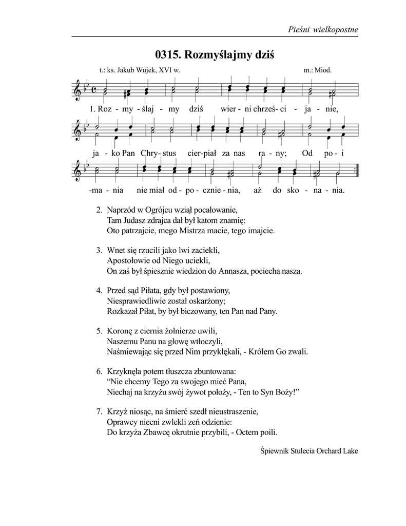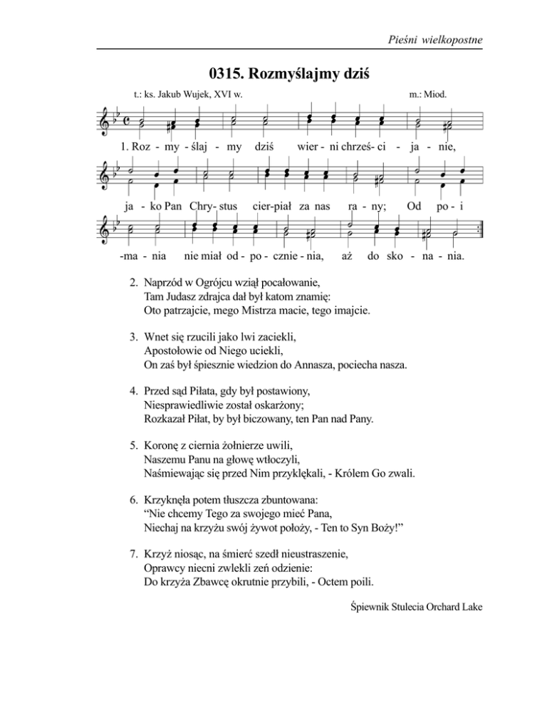 Pieśni wielkopostne 0315. Rozmyślajmy dziś t.: ks. Jakub Wujek, XVI w. 1. Roz - my - ślaj - my ja - ko Pan Chry- stus -ma - nia m.: Miod. dziś wier - ni chrześ- ci - ja - nie, cier-piał za nas nie miał od - po - cznie - nia, ra - ny; aż Od po - i do sko - na - nia. 2. Naprzód w Ogrójcu wziął pocałowanie, Tam Judasz zdrajca dał był katom znamię: Oto patrzajcie, mego Mistrza macie, tego imajcie. 3. Wnet się rzucili jako lwi zaciekli, Apostołowie od Niego uciekli, On zaś był śpiesznie wiedzion do Annasza, pociecha nasza. 4. Przed sąd Piłata, gdy był postawiony, Niesprawiedliwie został oskarżony; Rozkazał Piłat, by był biczowany, ten Pan nad Pany. 5. Koronę z ciernia żołnierze uwili, Naszemu Panu na głowę wtłoczyli, Naśmiewając się przed Nim przyklękali, - Królem Go zwali. 6. Krzyknęła potem tłuszcza zbuntowana: “Nie chcemy Tego za swojego mieć Pana, Niechaj na krzyżu swój żywot położy, - Ten to Syn Boży!” 7. Krzyż niosąc, na śmierć szedł nieustraszenie, Oprawcy niecni zwlekli zeń odzienie: Do krzyża Zbawcę okrutnie przybili, - Octem poili. Śpiewnik Stulecia Orchard Lake