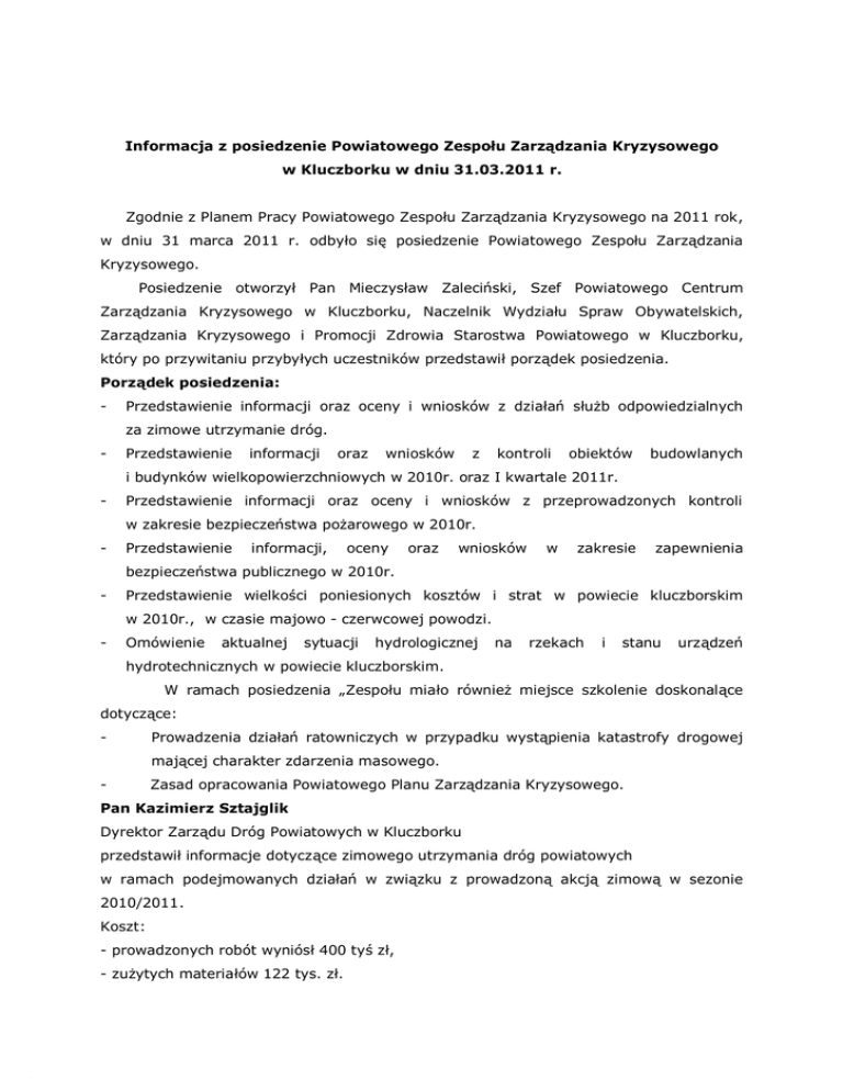 Informacja z posiedzenie Powiatowego Zespołu Zarządzania Kryzysowego w Kluczborku w dniu 31.03.2011 r. Zgodnie z Planem Pracy Powiatowego Zespołu Zarządzania Kryzysowego na 2011 rok, w dniu 31 marca 2011 r. odbyło się posiedzenie Powiatowego Zespołu Zarządzania Kryzysowego. Posiedzenie otworzył Pan Mieczysław Zaleciński, Szef Powiatowego Centrum Zarządzania Kryzysowego w Kluczborku, Naczelnik Wydziału Spraw Obywatelskich, Zarządzania Kryzysowego i Promocji Zdrowia Starostwa Powiatowego w Kluczborku, który po przywitaniu przybyłych uczestników przedstawił porządek posiedzenia. Porządek posiedzenia: - Przedstawienie informacji oraz oceny i wniosków z działań służb odpowiedzialnych za zimowe utrzymanie dróg. - Przedstawienie informacji oraz wniosków z kontroli obiektów budowlanych i budynków wielkopowierzchniowych w 2010r. oraz I kwartale 2011r. - Przedstawienie informacji oraz oceny i wniosków z przeprowadzonych kontroli w zakresie bezpieczeństwa pożarowego w 2010r. - Przedstawienie informacji, oceny oraz wniosków w zakresie zapewnienia bezpieczeństwa publicznego w 2010r. - Przedstawienie wielkości poniesionych kosztów i strat w powiecie kluczborskim w 2010r., w czasie majowo - czerwcowej powodzi. - Omówienie aktualnej sytuacji hydrologicznej na rzekach i stanu urządzeń hydrotechnicznych w powiecie kluczborskim. W ramach posiedzenia „Zespołu miało również miejsce szkolenie doskonalące dotyczące: - Prowadzenia działań ratowniczych w przypadku wystąpienia katastrofy drogowej mającej charakter zdarzenia masowego. - Zasad opracowania Powiatowego Planu Zarządzania Kryzysowego. Pan Kazimierz Sztajglik Dyrektor Zarządu Dróg Powiatowych w Kluczborku przedstawił informacje dotyczące zimowego utrzymania dróg powiatowych w ramach podejmowanych działań w związku z prowadzoną akcją zimową w sezonie 2010/2011. Koszt: - prowadzonych robót wyniósł 400 tyś zł, - zużytych materiałów 122 tys. zł. W trakcie zimy wykorzystano ok.1200 t trzydziesto procentowej mieszanki piaskowo solnej. Doświadczenia z tegorocznej zimy potwierdzają konieczność reorganizacji prowadzonych działań oraz doposażenia w nowy sprzęt. W związku z dużym kosztem tych urządzeń działania te należy prowadzić systematycznie. Wartość jednego pługu wacha się w granicach około 35 tyś zł. Natomiast jednej solarko piaskarki wynosi od 70 do 150 tys. zł. Pan Edward Baj Kierownik Generalnej Dyrekcji Dróg Krajowych i Autostrad rejon Kluczbork poinformował, że w ramach zimowego utrzymania dróg na terenie powiatu w sezonie zimowym 2010/2011 długość odcinków ogółem objętych zimowym utrzymaniem wynosi - 170,59 km, w tym na terenie powiatu Kluczborskiego)-86,4 km (DK 11, DK42, DK 45). Sprzęt, którym prowadzono zimowe utrzymanie - solarki nakładane na nośniki - 8 szt. - pługi jednostronne-11 szt. - ładowarka do załadunku materiałów (soli, mieszanki piaskowo-solnej, piasku) 1 szt. - wytwornica solanki o wydajności 2000 litrów/h -sprzęt do odśnieżania przy intensywnych opadach, pług ciężki dwustronny na nośniku z napędem na 3 osie ładowarka o pojemności łyżki 1,0 m3, równiarka. Materiały stosowane przy zwalczaniu śliskości zimowej; planowane zużycie zużyto w sezonie ] 2010/2011 - sól drogowa 2300 ton 2379 ton 500 t on 1097 ton - piasek Magazyn soli (igloo) oraz składowisko materiałów uszorstniających zlokalizowane były w Kluczborku, ul Byczyńska (przy DK 42) Ochrona bierna, - ustawiono zasłony przeciwśnieżne - 25,3 km, - ustawiono znaki A-32 „oszronienie jezdni" - 51 szt. Osłona meteorologiczna, stacje pogodowe przy DK 11 w m. Byczyna i Sowczyce oraz przy DK42 w m. Rudniki. Koszty w sezonie 2010/2011 III i IV kwartał 2010r. - 1677- tys. zł. I i II kwartał 2011 r. - 758-tys. zł. - razem sezon: - 2435-tys. zł. Wykonawcy usług zimowego utrzymania dróg; a) Przedsiębiorstwo Transportowo-Handlowe „NOCZYNSKI" z siedzibą w Kluczborku, ul. Karola Miarki 15 (usuwanie śliskości zimowej jezdni i odśnieżanie jezdni i poboczy), b) Przedsiębiorstwo Drogowe „TRAKT" z siedziba w Kluczborku, ul. Matejki 1 (usuwania śliskości zimowej i odśnieżanie chodników). Punkt dyspozycyjny prowadzenia akcji zimowe zlokalizowany był w siedzibie GDDKiA Rejonu w Kluczborku, ul Dworcowa 2, Pan Piotr Rasztar Powiatowy Inspektor Nadzoru Budowlanego w Kluczborku przedstawiając sytuację związaną z monitorowaniem obiektów wielkopowierzchniowych poinformował o systematycznych działania w tym zakresie. W związku z zapisami Prawa Budowlanego, właściciele obiektów wielkopowierzchniowych zobligowani są do przeprowadzenia kontroli stanu technicznego swoich obiektów co najmniej dwa razy do roku w nieprzekraczalnym terminie do 30 listopada oraz 31 maja. Oświadczenia z przeprowadzonych kontroli przekazywane są do Inspektora Nadzoru budowlanego. Pan Piotr Rasztar przypomniał, że mówiąc o obiektach wilkopowierzchniowych mamy na myśli konstrukcje o powierzchni przekraczającej 2000m2 lub o powierzchni dachu przekraczającej 1000m2. Na terenie powiatu kluczborskiego zlokalizowanych jest 27 obiektów wielkopowierzchniowych, z tego w ramach prowadzonych działań skontrolowano 4. W ramach prowadzonych działań zarządcy profilaktycznie są również pisemnie informowani o konieczności usuwania zalegającego śniegu. Pan Janusz Krupa Komendant Powiatowy Państwowej Straży Pożarnej przedstawił informację oraz ocenę i wnioski z przeprowadzonych kontroli w zakresie bezpieczeństwa pożarowego w 2010r. Komenda Powiatowa Państwowej Straż Pożarnej systematycznie prowadzi działania kontrolno rozpoznawcze, w których sprawdzane są przede wszystkim wypełniane obowiązki w zakresie zachowania bezpieczeństwa przeciwpożarowego. W roku 2010 w tym zakresie przeprowadzono 72 kontrole i stwierdzono 207 nieprawidłowości. Na tej podstawie wydano 61 aktów administracyjnych. Na podstawie przeprowadzonych kontroli generalnie mo