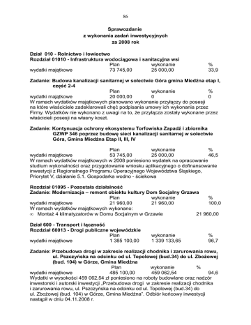 86 Sprawozdanie z wykonania zadań inwestycyjnych za 2008 rok Dział 010 - Rolnictwo i łowiectwo Rozdział 01010 - Infrastruktura wodociągowa i sanitacyjna wsi Plan wykonanie wydatki majątkowe 73 745,00 25 000,00 % 33,9 Zadanie: Budowa kanalizacji sanitarnej w sołectwie Góra gmina Miedźna etap I, część 2-4 Plan wykonanie % wydatki majątkowe 20 000,00 0 0 W ramach wydatków majątkowych planowano wykonanie przyłączy do posesji na które właściciele zadeklarowali chęć podpisania umowy ich wykonania przez Firmy. Wydatków nie wykonano z uwagi na to, że przyłącza zostały wykonane przez właścicieli posesji na własny koszt. Zadanie: Kontynuacja ochrony ekosystemu Torfowiska Zapadź i zbiornika GZWP 346 poprzez budowę sieci kanalizacji sanitarnej w sołectwie Góra, Gmina Miedźna Etap II, III, IV Plan wykonanie % wydatki majątkowe 53 745,00 25 000,00 46,5 W ramach wydatków majątkowych w 2008 poniesiono wydatek na opracowanie studium wykonalności oraz przygotowanie wniosku aplikacyjnego o dofinansowanie inwestycji z Regionalnego Programu Operacyjnego Województwa Śląskiego, Priorytet V, działanie 5.1. Gospodarka wodno - ściekowa Rozdział 01095 - Pozostała działalność Zadanie: Modernizacja – remont obiektu kultury Dom Socjalny Grzawa Plan wykonanie % wydatki majątkowe 21 960,00 21 960,00 100,0 W ramach wydatków majątkowych wykonano: • Montaż 4 klimatyzatorów w Domu Socjalnym w Grzawie 21 960,00 Dział 600 - Transport i łączność Rozdział 60013 - Drogi publiczne wojewódzkie Plan wydatki majątkowe 1 385 100,00 wykonanie 1 339 133,65 % 96,7 Zadanie: Przebudowa drogi w zakresie realizacji chodnika i zarurowania rowu, ul. Pszczyńska na odcinku od ul. Topolowej (bud.34) do ul. Zbożowej (bud. 104) w Górze, Gmina Miedźna Plan wykonanie % wydatki majątkowe 485 100,00 459 062,54 94,6 Wydatki w wysokości 459 062,54 zł poniesiono na roboty budowlane oraz nadzór inwestorski i autorski inwestycji „Przebudowa drogi w zakresie realizacji chodnika i zarurowania rowu, ul. Pszczyńska na odcinku od ul. Topolowej (bud.34) do ul. Zbożowej (bud. 104) w Górze, Gmina Miedźna”. Odbiór końcowy inwestycji nastąpił w dniu 04.11.2008 r. 87 Zadanie: Przebudowa drogi wojewódzkiej nr 933 oraz zarurowanie rowu i budowa chodnika w ciągu drogi wojewódzkiej nr 933 ul. Pszczyńska w Miedźnej Plan wykonanie % wydatki majątkowe 900 000,00 880 071,11 97,8 Wydatki w wysokości 880 071,11 zł poniesiono na roboty budowlane oraz nadzór inwestorski i autorski inwestycji „Przebudowa drogi wojewódzkiej nr 933 oraz zarurowanie rowu i budowa chodnika w ciągu drogi wojewódzkiej nr 933 ul. Pszczyńska w Miedźnej”. Odbiór końcowy inwestycji nastąpił w dniu 04.11.2008 r. Rozdział 60014 - Drogi publiczne powiatowe Zadanie: Współfinansowanie zadań w ciągu dróg powiatowych prowadzonych na terenie Gminy Miedźna Plan wykonanie % wydatki majątkowe 224 000,00 222 282,08 99,2 Zgodnie z porozumieniem Gminy Miedźna z Powiatem Pszczyńskim w sprawie wspólnych inwestycji w ciągu dróg powiatowych na terenie Gminy Miedźna w roku 2008 w ramach wydatków majątkowych wykonano: •Dokończenie przebudowy chodnika przy ul. Pszczyńskiej w Woli 89 379,30 •Dokończenie budowy chodnika przy ul. Bieruńskiej w Miedźnej 27 287,80 •Opracowania dokumentacji projektowej na kanalizację i chodnik wzdłuż ul. Miodowej we Frydku 40 500,00 • Przebudowa nawierzchni chodnika przy ul. Pszczyńskiej w Woli na długości 45 mb 27 291,80 • Dokończenie budowy kanalizacji deszczowej przy ul. Bieruńskiej w Miedźnej 35 993,18 •Sporządzenie projektów budowlanych dróg 1 830,00 Rozdział 60016 - Drogi publiczne gminne Plan wydatki majątkowe 288 130,00 wykonanie 240 874,44 % 83,6 Zadanie: Modernizacja dróg gminnych Plan wydatki majątkowe 282 030,00 wykonanie 234 774,44 % 83,2 W ramach wydatków majątkowych poniesionych w 2008 roku wykonano: • Modernizacja nawierzchni ul. Stolarskiej we Frydku 31 720,00 • Dalsza budowa chodnika i kanalizacji deszczowej przy ul. Stawowej w Woli 23 561,59 • Montaż 3 szt. trójników Ø315 na kanalizacji deszczowej przy Ul. Stawowej w Woli 915,00 • Utwardzenie ul. Błachowej w Woli 23 180,00 • Utwardzenie ul. Cichej w Woli 37 820,00 • Ewidencja dróg gminnych 26 230,00 • Budowa chodnika wzdłuż ul. Przemysłowej w Woli na odcinku od skrzyżowania z ul. Pszczyńską w kierunku OZ „Medyk” 13 655,25 • Przebudowa placu manewrowego przed OSP w Miedźnej 46 848,00 88 • • • • Wykonanie parkingu na Osiedlu Wola II Modernizacja dróg i chodników w sołectwie Gilowice Budowa chodnika w rejonie Szkoły Podstawowej nr 2 w Woli przy ul. Lipowej Wykonanie projektów w/w dróg 6 900,00 15 770,60 5 978,00 2 196,00 Zadanie: Zakup agregatu prądotwórczego - spawalniczego Plan wykonanie % wydatki majątkowe 6 100,00 6 100,00 100,0 W ramach wydatków majątkowych zakupiono agregat prądotwórczo – spawalniczy z przeznaczeniem na wykonywanie drobnych remontów przez dróżnika na drogach gminnych. Dział 700 - Gospodarka mieszkaniowa Rozdział 70004 - Różne jednostki obsługi gospodarki mieszkaniowej Zadanie: Modernizacja obiektów komunalnych Plan wykonanie % wydatki majątkowe 46 993,00 46 308,86 98,5 W ramach wydatków majątkowych poniesionych w 2008 roku wykonano: • Modernizację domu socjalnego w Górze - dostawa i wymiana 3 szt. okien oraz modernizacja pokrycia dachowego 12 528,69 • Modernizacja ogrodzenia przy Centrum Kultury w Woli 27 352,17 • Przebudowa ścianki osłonowej klatki wejściowej do budynku komunalnego w Grzawie 3 500,00 • Wykonanie instalacji elektrycznej dla czterech klimatyzatorów w Domu Socjalnym w Grzawie 2 928,00 Dział 750 - Administracja publiczna Rozdział 75023 - Urzędy gmin (miast i miast na prawach powiatu) Plan wykonanie wydatki majątkowe 114 000,00 57 995,46 % 50,9 Zadanie: Przygotowanie dokumentacji modernizacji budynku Urzędu Gminy Plan wykonanie % wydatki majątkowe 79 000,