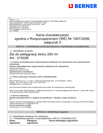 Strona 1 z 21 Karta charakterystyki zgodna z Rozporządzeniem (WE) Nr 1907/2006, załącznik II Data sporządzenia / numer wersji: 04.02.2015 / 0001 Data aktualizacji / numer wersji: 04.02.2015 / 0001 Obowiązuje od: 04.02.2015 Data druku pdf: 12.02.2015 Żel do pielęgnacji skóry 250 ml Art.: 219326 Karta charakterystyki zgodna z Rozporządzeniem (WE) Nr 1907/2006, załącznik II SEKCJA 1: Identyfikacja substancji/mieszaniny i identyfikacja przedsiębiorstwa 1.1 Identyfikator produktu Żel do pielęgnacji skóry 250 ml Art.: 219326 1.2 Istotne zidentyfikowane zastosowania substancji lub mieszaniny oraz zastosowania odradzane Istotne zidentyfikowane zastosowania substancji lub mieszaniny: Preparat kosmetyczny czyszczenie i ochrona skóry Zastosowania odradzane: Aktualnie brak informacji na ten temat. 1.3 Dane dotyczące dostawcy karty charakterystyki Berner Polska Sp. Z o.o., Al. Gen. T. Bora-Komorowskiego 25a, 31-476 Kraków, Polska Telefon: +48 12 297 62 40, Faks: +48 12 297 62 02 [email protected], www.berner.pl Dane dotyczące dostawcy karty charakterystyki patrz sekcja 16 niniejszej karty charakterystyki. Adres e-mail osoby odpowiedzialnej: [email protected], [email protected] - proszę NIE używać do wysyłania próśb o karty charakterystyki. 1.4 Numer alarmowy Służby powiadamiane w nagłych przypadkach / oficjalny organ doradczy : Centrum Informacji Toksykologicznej - Gdańsk. NZOZ Pomorskie Centrum Toksykologii, ul. Kartuska 4/6, 80-104 Gdańsk. Telefon alarmowy (24 h): (058) 682 04 04 Numer alarmowy spółki: +49 (0) 700 / 24 112 112 (BRC) SEKCJA 2: Identyfikacja zagrożeń 2.1 Klasyfikacja substancji lub mieszaniny 2.1.1 Klasyfikacja zgodnie z rozporządzeniem (WE) Nr 1272/2008 (CLP) Klasa Kategoria Zwrot określający zagrożenie zagrożenia zagrożenia Strona 2 z 21 Karta charakterystyki zgodna z Rozporządzeniem (WE) Nr 1907/2006, załącznik II Data sporządzenia / numer wersji: 04.02.2015 / 0001 Data aktualizacji / numer wersji: 04.02.2015 / 0001 Obowiązuje od: 04.02.2015 Data druku pdf: 12.02.2015 Żel do pielęgnacji skóry 250 ml Art.: 219326 Flam. Liq. 2 H225-Wysoce łatwopalna ciecz i pary. 2.1.2 Klasyfikacja zgodnie z dyrektywami 67/548/EWG oraz 1999/45/WE (łącznie ze zmianami) F, Produkt wysoce łatwopalny, R11 2.2 Elementy oznakowania 2.2.1 Oznakowanie zgodnie z rozporządzeniem (WE) Nr 1272/2008 (CLP) Należy stosować rozporządzenie dotyczące kosmetyków. Niebezpieczeństwo H225-Wysoce łatwopalna ciecz i pary. P210-Przechowywać z dala od źródeł ciepła, gorących powierzchni, źródeł iskrzenia, otwartego ognia i innych źródeł zapłonu. Nie palić. P233-Przechowywać pojemnik szczelnie zamknięty. 2.3 Inne zagrożenia Mieszanina nie zawiera substancji vPvB (vPvB = very persistent, very bioaccumulative) bądź nie jest wykazana w załączniku XIII rozporządzenia (WE) 1907/2006. Mieszanina nie zawiera substancji PBT (PBT = persistent, bioaccumulative, toxic) bądź nie jest wykazana w załączniku XIII rozporządzenia (WE) 1907/2006. SEKCJA 3: Skład/informacja o składnikach 3.1 Substancja n.s. 3.2 Mieszanina Etanol Numer rejestracji (REACH) Index EINECS, ELINCS, NLP CAS Stęż.% Klasyfikacja zgodnie z dyrektywą 67/548/EWG Klasyfikacja zgodnie z rozporządzeniem (WE) Nr 1272/2008 (CLP) 01-2119457610-43-XXXX 603-002-00-5 200-578-6 CAS 64-17-5 50-70 Produkt wysoce łatwopalny, F, R11 Flam. Liq. 2, H225 Eye Irrit. 2, H319 Strona 3 z 21 Karta charakterystyki zgodna z Rozporządzeniem (WE) Nr 1907/2006, załącznik II Data sporządzenia / numer wersji: 04.02.2015 / 0001 Data aktualizacji / numer wersji: 04.02.2015 / 0001 Obowiązuje od: 04.02.2015 Data druku pdf: 12.02.2015 Żel do pielęgnacji skóry 250 ml Art.: 219326 Propan-2-ol Numer rejestracji (REACH) Index EINECS, ELINCS, NLP CAS Stęż.% Klasyfikacja zgodnie z dyrektywą 67/548/EWG Klasyfikacja zgodnie z rozporządzeniem (WE) Nr 1272/2008 (CLP) (l)-alfa-bisabolol Numer rejestracji (REACH) Index EINECS, ELINCS, NLP CAS Stęż.% Klasyfikacja zgodnie z dyrektywą 67/548/EWG Klasyfikacja zgodnie z rozporządzeniem (WE) Nr 1272/2008 (CLP) -603-117-00-0 200-661-7 CAS 67-63-0 1-10 Produkt wysoce łatwopalny, F, R11 Produkt drażniący, Xi, R36 R67 Flam. Liq. 2, H225 Eye Irrit. 2, H319 STOT SE 3, H336 ---245-423-3 CAS 23089-26-1 0,1-<1 Produkt niebezpieczny dla środowiska, N, R51 Produkt niebezpieczny dla środowiska, R53 Aquatic Chronic 2, H411 Tekst formuł R i H, a także ich kod klasyfikacji (GHS/CLP) patrz sekcja 16. Substancje wymienione w tym punkcie mają określoną faktycznie obowiązującą klasyfikację! W przypadku substancji wymienionych w załączniku VI, tabela 3.1/3.2 rozporządzenia (WE) nr 1272/2008 (rozporządzenie CLP) oznacza to, że zostały uwzględnione wszystkie ewentualne wymienione tam uwagi dla podanej tutaj klasyfikacji. SEKCJA 4: Środki pierwszej pomocy 4.1 Opis środków pierwszej pomocy Drogi oddechowe Osobie zapewnić dopływ świeżego powietrza, w zależności od objawów skonsultować się z lekarzem. Kontakt ze skórą Umyć wodą. Kontakt z oczami Usunąć szkła kontaktowe. Przez kilka minut dokładnie spłukać dużą ilością wody, jeżeli potrzeba, udać się do lekarza. Drogi pokarmowe Jamę ustną dokładnie przepłukać wodą. Podać dużą ilość wody do picia, natychmiast udać się do lekarza. 4.2 Najważniejsze ostre i opóźnione objawy oraz skutki narażenia Jeśli dotyczy, objawy występujące z opóźnieniem i działanie podane są w punkcie 11. lub wśród dróg wchłaniania w punkcie 4.1. W określonych przypadkach objawy zatrucia mogą pojawić się dopiero po dłuższym czasie/po kilku godzinach. 4.3 Wskazania dotyczące wszelkiej natychmiastowej pomocy lekarskiej i szczególnego postępowania z poszkodowanym n.b. SEKCJA 5: Postępowanie w przypadku pożaru Strona 4 z 21 Karta charakterystyki zgodna z Rozporządzeniem (WE) Nr 1907/2006, załącznik II Data sporządzenia / numer wersji: 04.02.2015 / 0001 Data aktualizacji / numer wersji: