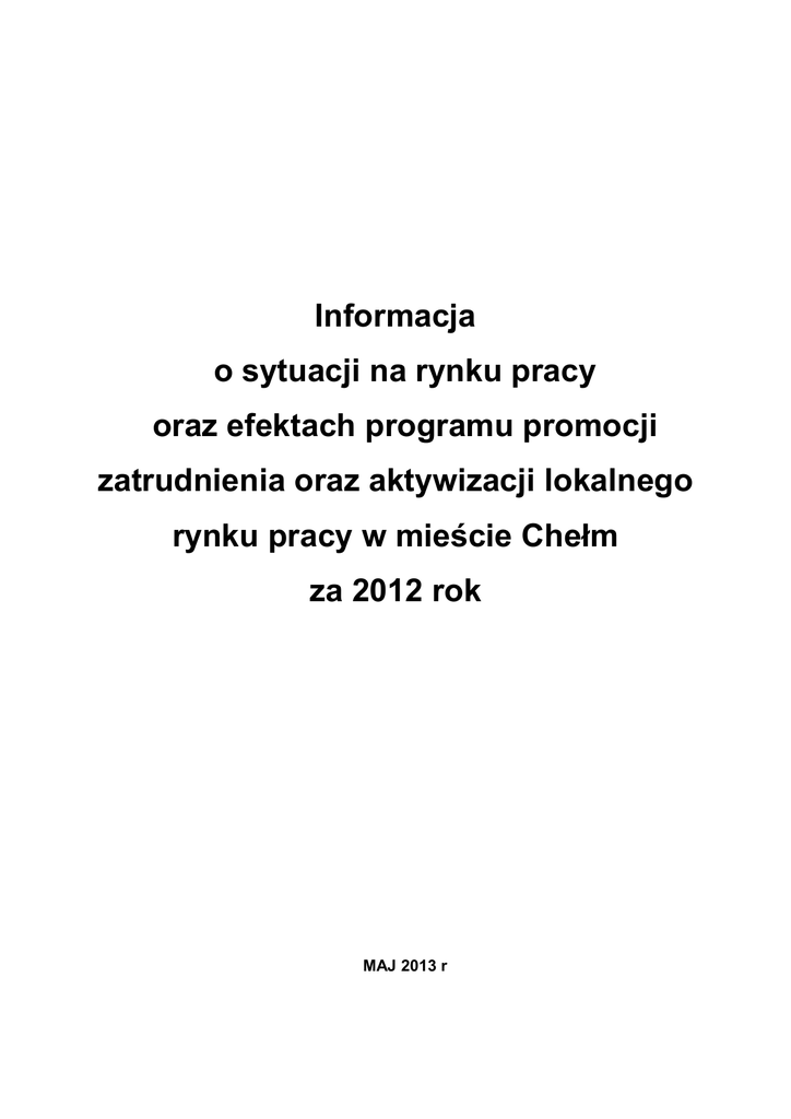 Informacja o sytuacji na rynku pracy oraz efektach programu promocji zatrudnienia oraz aktywizacji lokalnego rynku pracy w mieście Chełm za 2012 rok MAJ 2013 r Spis treści WSTĘP..............................................................................................................4 Cześć I. SYTUACJA NA RYNKU PRACY W MIEŚCIE CHEŁM................................6 1. STAN I STRUKTURA BEZROBOCIA W MIEŚCIE CHEŁM W 2012 ROKU...................................................................................................6 1.1.Poziom bezrobocia......................................................................................6 1.2. Struktura bezrobocia...................................................................................8 1.3. Bezrobotni będący w szczególnej sytuacji na rynku pracy.......................11 1.4. Zawody deficytowe i nadwyżkowe w mieście Chełm w 2012 roku...........13 2. FORMY DZIAŁALNOŚCI POWIATOWEGO URZĘDU PRACY W CHEŁMIE W 2012 ewidencja osób ROKU...........................................................................15 2.1. Rejestracja i bezrobotnych..............................................15 2.2. Usługi rynku pracy................................................................................... 17 2.2.1. Pośrednictwo pracy................................................................................17 2.2.2. Organizacja szkoleń..............................................................................18 2.2.3. Studia Podyplomowe.............................................................................19 2.2.4. Poradnictwo zawodowe i informacja zawodowa....................................20 2.2.5. Pomoc w aktywnym poszukiwaniu pracy...............................................20 Informacja o sytuacji na rynku pracy oraz efektach programu promocji zatrudnienia oraz aktywizacji lokalnego rynku pracy w mieście Chełm za rok 2012 2/45 2.3. Instrumenty rynku pracy...........................................................................21 2.3.1. Prace interwencyjne..............................................................................22 2.3.2. Roboty publiczne.................................................................................. 22 2.3.3. Staże......................................................................................................22 2.3.4. Jednorazowe środki na podjęcie działalności gospodarczej.................22 2.3.5. Refundacja kosztów wyposażenia i doposażenia stanowisk pracy.......23 2.3.6. Refundacja kosztów opieki nad dzieckiem do 7 lat..............................23 2.3.7. Program „JUNIOR”................................................................................23 2.3.8. Programy lokalne realizowane przez PUP w Chełmie..........................23 Część II. PROJEKTY, PROGRAMY REALIZOWANE W 2012 ROKU.....................25 1. Projekty realizowane przez Powiatowy Urząd Pracy w Chełmie w ramach Europejskiego Funduszu Społecznego..................................25 2. Programy specjalne …..............................................................................26 3. Projekty partnerskie..................................................................................28 Część III. FINANSOWANIE DZIAŁALNOŚCI POWIATOWEGO URZĘDU PRACY W CHEŁMIE W 2012 ROKU..................................................................... ....31 Część IV. INNE DZIAŁANIA NA RZECZ AKTYWNOŚCI BEZROBOTNYCH..........32 1. Ewidencja Działalności Gospodarczej.....................................................32 Informacja o sytuacji na rynku pracy oraz efektach programu promocji zatrudnienia oraz aktywizacji lokalnego rynku pracy w mieście Chełm za rok 2012 3/45 2. Usługi Agencji Rozwoju Lokalnego w Chełmie – Oddział Lubelskiej Fundacji Rozwoju.....................................................................................33 2.1. Kluby pracy...............................................................................................34 2.2. Pośrednictwo pracy i działalność promocyjna..........................................35 2.3. Inne aktywności........................................................................................35 2.4. Inne działania na rzecz przeciwdziałania bezrobociu...............................36 3. Działalność Centrum Integracji Społecznego w Chełmie na rzecz aktywizacji zawodowej.............................................................................36 4. Działalność Miejskiego Ośrodka Pomocy Rodzinie w Chełmie.......................................................................................................38 5. Formy aktywizacji zawodowej zorganizowanej w Urzędzie Miasta Chełm.........................................................................................................38 6. Działalność Ochotniczych przeciwdziałania Hufców Pracy na bezrobociu rzecz osób młodych.......................................................................39 PODSUMOWANIE.....................................................................................................43 Informacja o sytuacji na rynku pracy oraz efektach programu promocji zatrudnienia oraz aktywizacji lokalnego rynku pracy w mieście Chełm za rok 2012 4/45 WSTĘP Bezrobocie jest jednym z największych zagrożeń o charakterze ekonomicznym i społecznym. Walka z bezrobociem jest zjawiskiem trudnym, które wymaga współdziałania wielu instytucji, firm i organizacji. Instytucjami rynku pracy, realizującymi zadania z zakresu polityki rynku pracy są: 1. Publiczne służby zatrudnienia, tworzą organy zatrudnienia wraz z powiatowymi i wojewódzkimi urzędami pracy, urzędem obsługującym ministra właściwego do spraw pracy oraz urzędami wojewódzkimi, realizującymi zadania określone ustawą. 2. Ochotnicze Hufce Pracy (OHP) będące państwową jednostką wyspecjalizowaną w działaniach na rzecz młodzieży, w szczególn