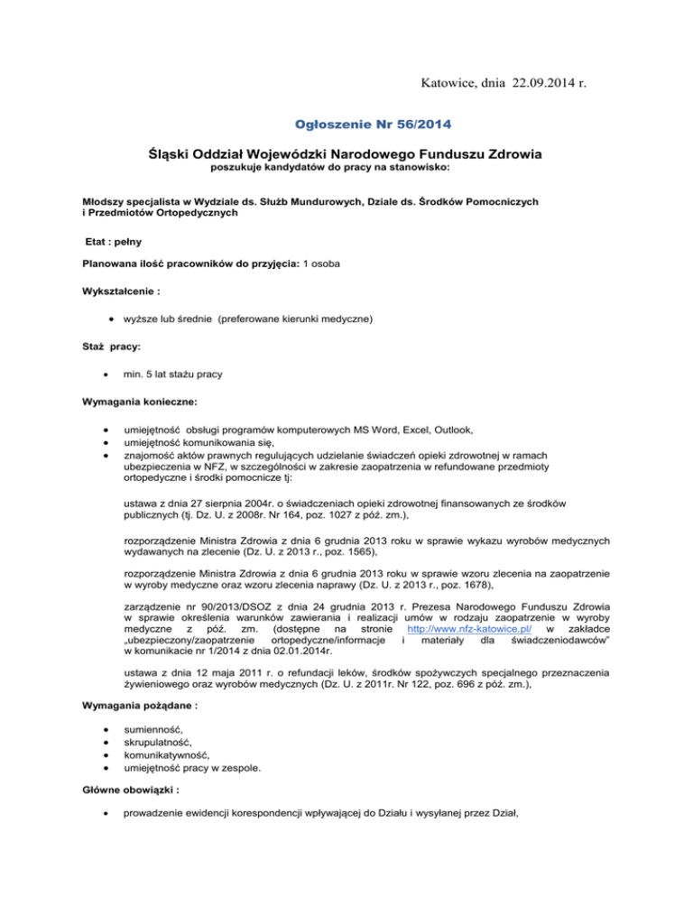 Katowice, dnia 22.09.2014 r. Ogłoszenie Nr 56/2014 Śląski Oddział Wojewódzki Narodowego Funduszu Zdrowia poszukuje kandydatów do pracy na stanowisko: Młodszy specjalista w Wydziale ds. Służb Mundurowych, Dziale ds. Środków Pomocniczych i Przedmiotów Ortopedycznych Etat : pełny Planowana ilość pracowników do przyjęcia: 1 osoba Wykształcenie : wyższe lub średnie (preferowane kierunki medyczne) Staż pracy: min. 5 lat stażu pracy Wymagania konieczne: umiejętność obsługi programów komputerowych MS Word, Excel, Outlook, umiejętność komunikowania się, znajomość aktów prawnych regulujących udzielanie świadczeń opieki zdrowotnej w ramach ubezpieczenia w NFZ, w szczególności w zakresie zaopatrzenia w refundowane przedmioty ortopedyczne i środki pomocnicze tj: ustawa z dnia 27 sierpnia 2004r. o świadczeniach opieki zdrowotnej finansowanych ze środków publicznych (tj. Dz. U. z 2008r. Nr 164, poz. 1027 z póź. zm.), rozporządzenie Ministra Zdrowia z dnia 6 grudnia 2013 roku w sprawie wykazu wyrobów medycznych wydawanych na zlecenie (Dz. U. z 2013 r., poz. 1565), rozporządzenie Ministra Zdrowia z dnia 6 grudnia 2013 roku w sprawie wzoru zlecenia na zaopatrzenie w wyroby medyczne oraz wzoru zlecenia naprawy (Dz. U. z 2013 r., poz. 1678), zarządzenie nr 90/2013/DSOZ z dnia 24 grudnia 2013 r. Prezesa Narodowego Funduszu Zdrowia w sprawie określenia warunków zawierania i realizacji umów w rodzaju zaopatrzenie w wyroby medyczne z póź. zm. (dostępne na stronie http://www.nfz-katowice.pl/ w zakładce „ubezpieczony/zaopatrzenie ortopedyczne/informacje i materiały dla świadczeniodawców” w komunikacie nr 1/2014 z dnia 02.01.2014r. ustawa z dnia 12 maja 2011 r. o refundacji leków, środków spożywczych specjalnego przeznaczenia żywieniowego oraz wyrobów medycznych (Dz. U. z 2011r. Nr 122, poz. 696 z póź. zm.), Wymagania pożądane : sumienność, skrupulatność, komunikatywność, umiejętność pracy w zespole. Główne obowiązki : prowadzenie ewidencji korespondencji wpływającej do Działu i wysyłanej przez Dział, rejestracja pism w SOD (System Obiegu Dokumentów) , przygotowanie korespondencji do wysłania, przygotowywanie projektów odpowiedzi w ramach korespondencji prowadzonej przez Dział w sprawach dotyczących zaopatrzenia w wyroby medyczne, prowadzenie postępowania wyjaśniającego zarówno z pracownikami Sekcji Obsługi Ubezpieczonych, jak i Świadczeniodawcami w zakresie kontroli prawidłowości realizacji zleceń na podstawie dokumentacji rozliczeniowej, prowadzenie archiwum Działu w zakresie rozliczeń ze Świadczeniodawcami, zaopatrzenie działu w materiały biurowe, prowadzenie dokumentacji z tym związanej, udział w szkoleniach organizowanych przez Dział bądź inne komórki organizacyjne Oddziału, wykonywanie innych prac zleconych przez Kierownika Działu przestrzeganie regulaminu pracy. Ponadto kandydaci do zatrudnienia powinni spełniać wymogi określone dla pracowników NFZ w art. 112 ustawy z dnia 27 sierpnia 2004 r. o świadczeniach opieki zdrowotnej finansowanych ze środków publicznych ( Dz. U. z 2008 r. Nr 164, poz. 1027) Wymagane dokumenty : list motywacyjny i życiorys (CV) opatrzony własnoręcznym podpisem dokumenty potwierdzające wykształcenie, odbyte kursy i szkolenia (kopie) kwestionariusz osobowy dla osoby ubiegającej się o pracę *wzór do pobrania dokumenty potwierdzające dotychczasowe zatrudnienie - świadectwa/o pracy (a w przypadku pozostawania w zatrudnieniu – aktualne zaświadczenie o zatrudnieniu) oświadczenia kandydata o: wyrażeniu zgody na przetwarzanie danych osobowych zawartych w ofercie pracy w zakresie niezbędnym do przeprowadzenia rekrutacji, korzystaniu w pełni z praw publicznych i o niekaralności za przestępstwo popełnione umyślnie oraz spełnieniu wymogów wynikających z art.112 ustawy z dnia 27 sierpnia 2004r. o świadczeniach opieki zdrowotnej finansowanych ze środków publicznych *wzór do pobrania Inne informacje : Aplikacje należy przesłać lub dostarczyć w terminie do 14 dni od daty ukazania się ogłoszenia na adres: Śląski Oddział Wojewódzki Narodowego Funduszu Zdrowia, 40-844 Katowice, ul. Kossutha 13 Wydział Organizacyjny, Kadr i Szkoleń, pokój 503 (Dokumenty należy składać w biurze podawczym na parterze) z dopiskiem: Oferta pracy Nr 56/2014 na stanowisko młodszego specjalisty w Wydziale ds. Służb Mundurowych, Dziale ds. Środków Pomocniczych i Przedmiotów Ortopedycznych. Informacje telefoniczne pod nr 32/735-15-68 Aplikacje niekompletne, niezgodne z wymogami zawartymi w ogłoszeniu oraz po upływie wyżej określonego terminu nie będą rozpatrywane (liczy się data wpływu do Śląskiego OW NFZ). Kandydaci spełniający wymogi formalne zostaną powiadomieni o terminie spotkania rekrutacyjnego. Dokumentów aplikacyjnych nie zwracamy. Informacja o wynikach naboru zostanie umieszczona w Biuletynie Informacji Publicznej na stronie www.nfzkatowice.pl oraz tablicy ogłoszeń w siedzibie Oddziału, Katowice, ul. Kossutha 13 IV p.