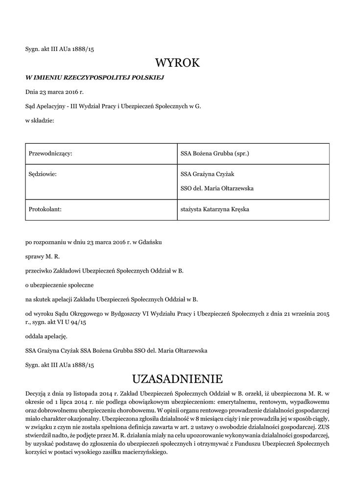 Sygn. akt III AUa 1888/15 WYROK W IMIENIU RZECZYPOSPOLITEJ POLSKIEJ Dnia 23 marca 2016 r. Sąd Apelacyjny - III Wydział Pracy i Ubezpieczeń Społecznych w G. w składzie: Przewodniczący: SSA Bożena Grubba (spr.) Sędziowie: SSA Grażyna Czyżak SSO del. Maria Ołtarzewska Protokolant: stażysta Katarzyna Kręska po rozpoznaniu w dniu 23 marca 2016 r. w Gdańsku sprawy M. R. przeciwko Zakładowi Ubezpieczeń Społecznych Oddział w B. o ubezpieczenie społeczne na skutek apelacji Zakładu Ubezpieczeń Społecznych Oddział w B. od wyroku Sądu Okręgowego w Bydgoszczy VI Wydziału Pracy i Ubezpieczeń Społecznych z dnia 21 września 2015 r., sygn. akt VI U 94/15 oddala apelację. SSA Grażyna Czyżak SSA Bożena Grubba SSO del. Maria Ołtarzewska Sygn. akt III AUa 1888/15 UZASADNIENIE Decyzją z dnia 19 listopada 2014 r. Zakład Ubezpieczeń Społecznych Oddział w B. orzekł, iż ubezpieczona M. R. w okresie od 1 lipca 2014 r. nie podlega obowiązkowym ubezpieczeniom: emerytalnemu, rentowym, wypadkowemu oraz dobrowolnemu ubezpieczeniu chorobowemu. W opinii organu rentowego prowadzenie działalności gospodarczej miało charakter okazjonalny. Ubezpieczona zgłosiła działalność w 8 miesiącu ciąży i nie prowadziła jej w sposób ciągły, w związku z czym nie została spełniona definicja zawarta w art. 2 ustawy o swobodzie działalności gospodarczej. ZUS stwierdził nadto, że podjęte przez M. R. działania miały na celu upozorowanie wykonywania działalności gospodarczej, by uzyskać podstawę do zgłoszenia do ubezpieczeń społecznych i otrzymywać z Funduszu Ubezpieczeń Społecznych korzyści w postaci wysokiego zasiłku macierzyńskiego. Odwołanie od tej decyzji złożyła ubezpieczona M. R., żądając zmiany decyzji i objęcie jej obowiązkowym ubezpieczeniom: emerytalnym, rentowym i wypadkowym oraz dobrowolnym ubezpieczeniem chorobowym od dnia 1 lipca 2014 r. W uzasadnieniu ubezpieczona wskazała na to, iż prowadzi działalność gospodarczą w sposób zorganizowany, ciągły i w celu zarobkowym. O zarobkowym charakterze prowadzonej działalności świadczy to, iż otrzymuje obecnie większą liczbę zleceń niż na początku działalności. W odpowiedzi na odwołanie pozwany organ rentowy wniósł o jego oddalenie, podtrzymując stanowisko przedstawione w uzasadnieniu zaskarżonej decyzji. Wyrokiem z dnia 21 września 2015 r. Sąd Okręgowy w Bydgoszczy VI Wydział Pracy i Ubezpieczeń Społecznych zmienił zaskarżoną decyzję w ten sposób, że ustalił, iż M. R. w okresie od 1 lipca 2014 r. podlega obowiązkowym ubezpieczeniom: emerytalnemu, rentowym, wypadkowemu oraz dobrowolnemu ubezpieczeniu chorobowemu jako osoba prowadząca pozarolniczą działalność. Powyższe rozstrzygnięcie Sąd Okręgowy oparł na następujących ustaleniach i rozważaniach: W celu wyjaśnienia, czy w przedmiotowej sprawie doszło do faktycznego rozpoczęcia prowadzenia działalności gospodarczej przez ubezpieczoną M. R. od dnia 1 lipca 2014 r., skutkującego podleganiem obowiązkowym ubezpieczeniom emerytalnemu, rentowym, wypadkowemu oraz dobrowolnemu ubezpieczeniu chorobowemu, Sąd Okręgowy zapoznał się z materiałem zgromadzonym w aktach rentowych i w aktach sądowych, a także przesłuchał świadków oraz ubezpieczoną. M. R. dnia 27 czerwca 2014 r. złożyła wniosek o wpis do Centralnej Ewidencji i Informacji o Działalności Gospodarczej. Ubezpieczonej dnia 30 czerwca 2014 r. nadano numer identyfikacji podatkowej. Z kolei z dniem 1 lipca 2014 r. M. R. rozpoczęła prowadzenie pozarolniczej działalności gospodarczej pod firmą (...). Jako przeważającą działalność gospodarczą określiła działalność w zakresie specjalistycznego projektowania. Powódka 1 lipca 2014 r. zawarła z Biurem (...) umowę na prowadzenie jej księgowości na czas nieokreślony. Na mocy tej umowy biuro zobowiązało względem ubezpieczonej do prowadzenia ewidencji zakupu i sprzedaży, podatkowej księgi przychodów i rozchodów oraz do ustalania wysokości należnego podatku dochodowego, sporządzania miesięcznych deklaracji rozliczeniowych, a także zeznania rocznego na podstawie danych wynikających z zapisów w ewidencjach oraz innych informacji dostarczonych przez ubezpieczoną. Strony ustaliły odpłatność za prowadzenie księgi handlowej, ewidencji zakupu i sprzedaży, rozliczeń z ZUS w wysokości 100 zł + podatek VAT. M. R. poniosła koszty umieszczenia reklamy prowadzonej przez siebie działalności na portalu (...). Ubezpieczona od momentu rozpoczęcia prowadzenia działalności gospodarczej regularnie opłacała składki na ZUS. Odwołująca zadeklarowała i opłaciła składki na ubezpieczenia społeczne od podstawy wymiaru składek za miesiąc lipiec 2014 r. w wysokości 9000,00 zł oraz za sierpień 2014 r. w wysokości 3600,00 zł. Dnia 16 sierpnia 2014 r. powódka urodziła dziecko. W ramach prowadzonej pozarolniczej działalności gospodarczej, w lipcu 2014 r. odwołująca osiągnęła przychód w wysokości 105 zł, a w sierpniu 2014 r. przychód w kwocie 95 zł. Po podliczeniu kosztów prowadzonej działalności gospodarczej, okazało się, że w sierpniu 2014 r. skarżąca odnotowała stratę w wymiarze 323,82 zł. We wrześniu 2014 r. przychód z działalności gospodarczej wyniósł 215 zł. Znacznie większe obroty z tytułu prowadzonej pozarolniczej działalności gospodarczej ubezpieczona M. R. zanotowała od października 2014 r., w którym przychód wyniósł 6899 zł. Szczególnie istotne dla osiągnięcia takiego przychodu było wykonanie usług reklamowych oraz sporządzenie projektów graficznych na rzecz T. M. za kwotę 3500 zł oraz wykonanie strony internetowej na rzecz Biura (...) za kwotę 3000 zł. W kolejnym miesiącu powódka wypracowała przychód w wymiarze 1984,50 zł. Wynikało to w głównej mierze z wykonania strony internetowej dla (...) sp. z o.o. za kwotę 1400 zł. Za okres od stycznia do sierpnia 2015 r. ubezpieczona osiągnęł