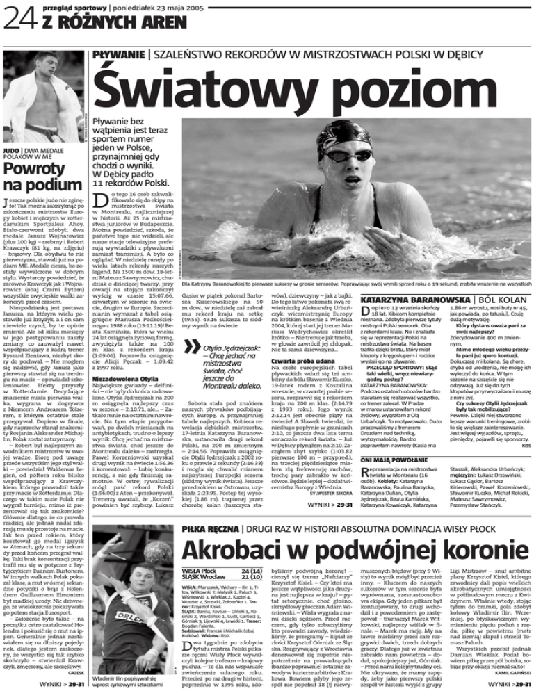 24 Z RÓŻNYCH AREN przegląd sportowy | poniedziałek 23 maja 2005 Powroty na podium eszcze polskie judo nie zginęło! Tak można zakrzyknąć po zakończeniu mistrzostw Europy kobiet i mężczyzn w rotterdamskim Sportpaleis Ahoy. Biało-czerwoni zdobyli dwa medale. Janusz Wojnarowicz (plus 100 kg) – srebrny i Robert Krawczyk (81 kg, na zdjęciu) – brązowy. Dla obydwu to nie pierwszyzna, stawali już na podium ME. Medale cieszą, bo zostały wywalczone w dobrym stylu. Wystarczy powiedzieć, że zarówno Krawczyk jak i Wojnarowicz (obaj Czarni Bytom) wszystkie zwycięskie walki zakończyli przed czasem. Niespodzianką jest postawa Janusza, na którym wielu postawiło już krzyżyk, a i on sam niewiele czynił, by te opinie zmienić. Ale od kilku miesięcy w jego postępowaniu zaszły zmiany, co zauważył nawet współpracujący z kadrą trener Ryszard Zieniawa, niezbyt skory do pochwał. – Nie mogłem się nadziwić, gdy Janusz jako pierwszy stawiał się na treningu na macie – opowiadał szkoleniowiec. Efekty przyszły w Rotterdamie. Decydujące znaczenie miała pierwsza walka, wygrana w dogrywce z Niemcem Andreasem Tölzerem, z którym ostatnio stale przegrywał. Dopiero w finale, gdy naprzeciw stanął znakomity Rosjanin Aleksander Michajlin, Polak został zatrzymany. – Robert był najlepszym zawodnikiem mistrzostw w swojej wadze. Biorę pod uwagę przede wszystkim jego styl walki – powiedział Waldemar Legień, od półtora roku blisko współpracujący z Krawczykiem, którego prowadził także przy macie w Rotterdamie. Dlaczego w takim razie Polak nie wygrał turnieju, mimo iż prezentował się tak znakomicie? Głównie dlatego, że co prawda rzadziej, ale jednak nadal zdarzają mu się przestoje na macie. Jak ten przed rokiem, który kosztował go medal igrzysk w Atenach, gdy na trzy sekundy przed końcem przegrał walkę. Taki brak koncentracji przytrafił mu się w potyczce z Brytyjczykiem Euanem Burtonem. W innych walkach Polak pokazał klasę, a rzut w ósmej sekundzie potyczki o brąz z Holendrem Guillaumem Elmontem był rzadkiej urody. Nic dziwnego, że wielokrotnie pokazywała go potem stacja Eurosport. – Założenie było takie – na początku ostro zaatakować Holendra i pokusić się o rzut na ippon. Generalnie jednak nastawiałem się na dłuższy pojedynek‚ dlatego jestem zaskoczony‚ że wszystko się tak szybko skończyło – stwierdził Krawczyk, zmęczony, ale szczęśliwy. J Pływanie bez wątpienia jest teraz sportem numer jeden w Polsce‚ przynajmniej gdy chodzi o wyniki. W Dębicy padło 11 rekordów Polski. o tego 16 osób zakwalifikowało się do ekipy na mistrzostwa świata w Montrealu‚ najliczniejszej w historii. Aż 25 na mistrzostwa juniorów w Budapeszcie. Można powiedzieć‚ szkoda‚ że państwo tego nie widzieli‚ ale nasze stacje telewizyjne preferują wywiadziki z pływakami zamiast transmisji. A było co oglądać. W niedzielę runęły po wielu latach rekordy naszych legend. Na 1500 m dow. 18-letni Mateusz Sawrymowicz‚ chudziak o dziecięcej twarzy‚ przy owacji na stojąco zakończył wyścig w czasie 15:07.66‚ czwartym w sezonie na świecie‚ drugim w Europie. Szczecinianin wymazał z tabel osiągnięcie Mariusza Podkościelnego z 1988 roku (15:11.19)! Beata Kamińska‚ która w wieku 24 lat osiągnęła życiową formę‚ zwyciężyła także na 100 m klas. z rekordem kraju (1:09.06). Poprawiła osiągnięcie Alicji Pęczak – 1:09.42 z 1997 roku. D Dla Katrzyny Baranowskiej to pierwsze sukcesy w gronie seniorów. Poprawiając swój wynik sprzed roku o 19 sekund, zrobiła wrażenie na wszystkich Gąsior w piątek pokonał Bartosza Kizierowskiego na 50 m dow.‚ w niedzielę zaś zabrał mu rekord kraju na setkę (49.55). 49.16 Łukasza to siódmy wynik na świecie Otylia Jędrzejczak: – Chcę jechać na mistrzostwa świata‚ choć jeszcze do Montrealu daleko. Niezadowolona Otylia Największe gwiazdy – delfiniści – nie były do końca zadowolone. Otylia Jędrzejczak na 200 m osiągnęła najlepszy czas w sezonie – 2:10.71‚ ale... – Zatkało mnie na ostatnim nawrocie. Na tym etapie przygotowań‚ po dwóch miesiącach na antybiotykach, trudno o lepszy wynik. Chcę jechać na mistrzostwa świata‚ choć jeszcze do Montrealu daleko – zastrzegła. Paweł Korzeniowski uzyskał drugi wynik na świecie 1:56.36 i komentował: – Lubię konkurencję‚ a nie gdy finiszuję samotnie. W ostrej rywalizacji mógł paść rekord Polski (1:56.00) z Aten – przekonywał. Trenerzy uważali‚ że „Korzeń” powinien być szybszy. Łukasz Sobota stała pod znakiem naszych pływaków podbijających Europę. A przynajmniej tabele najlepszych. Kobieca rewelacja dębickich mistrzostw, 17-letnia Katarzyna Baranowska, ustanowiła drugi rekord Polski‚ na 200 m zmiennym – 2:14.56. Poprawiła osiągnięcie Otylii Jędrzejczak z 2002 roku o prawie 2 sekundy (2:16.33) i mogła się chwalić mianem najszybszej Europejki sezonu (siódmy wynik świata). Jeszcze przed rokiem w Ostrowcu, uzyskała 2:23.95. Postęp tej wysokiej (1.86 m)‚ trapionej przez chorobę kolan (łuszczyca sta- wów), dziewczyny – jak z bajki. Do tego łatwo pokonała swą rówieśniczkę Aleksandrę Urbańczyk‚ wicemistrzynię Europy na krótkim basenie z Wiednia 2004‚ której start jej trener Mariusz Wędrychowicz określił krótko: – Nie trenuje jak trzeba‚ w głowie zawrócił jej chłopak. Nie ta sama dziewczyna... Czwarta próba udana Na czoło europejskich tabel pływackich wdarł się też ambitny do bólu Sławomir Kuczko. 19-latek rodem z Koszalina wreszcie‚ w czwartej próbie sezonu‚ rozprawił się z rekordem kraju na 200 m klas. (2:14.79 z 1993 roku). Jego wynik 2:12.14 jest obecnie piąty na świecie! A Sławek twierdzi‚ że niedługo popłynie w granicach 2:10‚ co jeszcze dwa lata temu oznaczało rekord świata. – Już w Dębicy płynąłem na 2:10. Zacząłem zbyt szybko (1:03.82 pierwsze 100 m – przyp