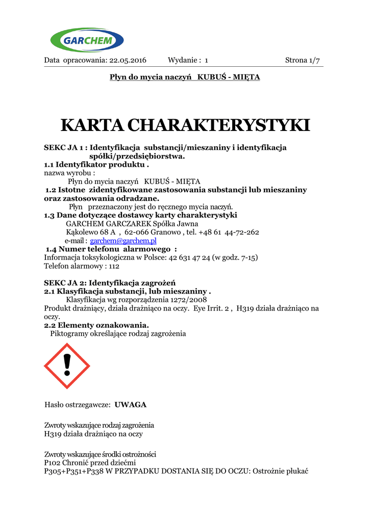 Data opracowania: 22.05.2016 Wydanie : 1 Strona 1/7 Płyn do mycia naczyń KUBUŚ - MIĘTA KARTA CHARAKTERYSTYKI SEKC JA 1 : Identyfikacja substancji/mieszaniny i identyfikacja spółki/przedsiębiorstwa. 1.1 Identyfikator produktu . nazwa wyrobu : Płyn do mycia naczyń KUBUŚ - MIĘTA 1.2 Istotne zidentyfikowane zastosowania substancji lub mieszaniny oraz zastosowania odradzane. Płyn przeznaczony jest do ręcznego mycia naczyń. 1.3 Dane dotyczące dostawcy karty charakterystyki GARCHEM GARCZAREK Spółka Jawna Kąkolewo 68 A , 62-066 Granowo , tel. +48 61 44-72-262 e-mail : [email protected] 1.4 Numer telefonu alarmowego : Informacja toksykologiczna w Polsce: 42 631 47 24 (w godz. 7-15) Telefon alarmowy : 112 SEKC JA 2: Identyfikacja zagrożeń 2.1 Klasyfikacja substancji, lub mieszaniny . Klasyfikacja wg rozporządzenia 1272/2008 Produkt drażniący, działa drażniąco na oczy. Eye Irrit. 2 , H319 działa drażniąco na oczy. 2.2 Elementy oznakowania. Piktogramy określające rodzaj zagrożenia Hasło ostrzegawcze: UWAGA Zwroty wskazujące rodzaj zagrożenia H319 działa drażniąco na oczy Zwroty wskazujące środki ostrożności P102 Chronić przed dziećmi P305+P351+P338 W PRZYPADKU DOSTANIA SIĘ DO OCZU: Ostrożnie płukać Data opracowania: 22.05.2016 Wydanie : 1 Strona 2/7 Płyn do mycia naczyń KUBUŚ - MIĘTA wodą przez kilka minut. Wyjąć soczewki kontaktowe, jeżeli są i można je łatwo usunąć. Nadal płukać. P337+P313 W przypadku utrzymywania się działania drażniącego na oczy: zasięgnąć porady/zgłosić się pod opiekę lekarza 2.3 Inne zagrożenia Nie dotyczy . SEKC JA 3 : Skład/ informacja o składnikach 3.1 Substancje Nie dotyczy 3.2 M i es z a n i n y Wodny roztwór zawierający anionowe środki powierzchniowo czynne, kompozycję zapachową, konserwanty , barwniki oraz środki wspomagające proces mycia Składniki szkodliwe 2,0–5,0 % sól sodowa oksyetylenowanego siarczanu alkoholu tłuszczowego C 12-14, nr indeksowy: nie dotyczy, nr CAS 68891-38-3, nr WE 500-234-8, nr rejestracji 01-2119488639-16-XXXX Klasyfikacja wg Rozporządzenia 1272/2008: Eye Dam. 1, H318 powoduje poważne uszkodzenie oczu ; Skin Irrit.2, H315 działa drażniąco na skórę SEKCJA 4. Środki pierwszej pomocy 4.1 Opis środków pierwszej pomocy Drogi oddechowe: Brak zagrożeń – niekonieczne . Oczy: Natychmiast płukać obficie oczy (przy wywiniętych powiekach) wodą przez co najmniej 15 minut. W razie potrzeby skontaktować się z okulistą . Skóra: Brak zagrożeń – niekonieczne . Połknięcie: Wypłukać jamę ustną. W razie potrzeby skontaktować się z lekarzem . 4.2 Najważniejsze ostre i opóźnione objawy oraz skutki narażenia Brak 4.3 Wskazania dotyczące wszelkiej natychmiastowej pomocy lekarskiej i szczegółowego postępowania z poszkodowanym Brak SEKCJA 5. Postępowanie w przypadku pożaru 5.1 Środki gaśnicze: Produkt niepalny . Pożary w obecności preparatu gasić środkami właściwymi dla palących się materiałów . 5.2 Szczegółowe zagrożenia związane z substancją lub mieszaniną Brak 5.3 Informacje dla straży pożarnej Zbiorniki narażone na działanie wysokiej temperatury chłodzić wodą z bezpiecznej odległości. O ile to możliwe usunąć produkt z obszaru zagrożenia. Data opracowania: 22.05.2016 Wydanie : 1 Strona 3/7 Płyn do mycia naczyń KUBUŚ - MIĘTA Środki ochrony dróg oddechowych, ubranie i rękawice ługoodporne SEKCJA 6. Postępowanie w przypadku niezamierzonego uwolnienia do środowiska 6.1 Indywidualne środki ostrożności, sprzęt ochronny i procedury w sytuacjach awaryjnych Odzież ochronna , rękawice ochronne z tworzywa sztucznego 6.2 Środki ostrożności w zakresie ochrony środowiska O ile to możliwe zlikwidować wyciek. Nie dopuścić do przedostania się do wód gruntowych, zbiorników wodnych i kanalizacji 6.3 Metody i materiały zapobiegające rozprzestrzenianiu się skażenia i służące do usuwania skażenia Przy dużych wyciekach miejsce gromadzenia się cieczy obwałować , zebraną ciecz odpompować. Małe ilości cieczy przysypać niepalnym materiałem chłonnym , zebrać do zamykanego pojemnika i skierować do utylizacji , a zanieczyszczoną powierzchnię spłukać obficie wodą . 6.4 Odniesienia do innych sekcji Informacje dotyczące odpowiedniego sprzętu ochrony osobistej podano w sekcji 8 Usuwać zgodnie z zaleceniami przedstawionymi w sekcji 13 SEKCJA 7. Postępowanie z substancjami i mieszaninami oraz ich magazynowanie 7.1 Środki ostrożności dotyczące bezpiecznego postępowania Postępować zgodnie z ogólnie przyjętymi zasadami bezpieczeństwa . 7.2 Warunki bezpiecznego magazynowania, w tym informacje dotyczące wszelkich wzajemnych niezgodności Przechowywać w szczelnie zamkniętych pojemnikach nie narażonych na działanie promieni słonecznych , w wydzielonym pomieszczeniu magazynowym w temperaturze dodatniej . 7.3 Szczególne zastosowanie(-a) końcowe Nieznane SEKCJA 8. Kontrola narażenia / środki ochrony indywidualnej 8.1 Parametry dotyczące kontroli Najwyższe dopuszczalne stężenia : nie dotyczy 8.2 Kontrola narażenia Ochrona dróg oddechowych: Nie jest wymagana Ochrona ciała: Nie jest wymagana Ochrona rąk: Nie jest wymagana Ochrona oczu: Nie jest wymagana Data opracowania: 22.05.2016 Wydanie : 1 Strona 4/7 Płyn do mycia naczyń KUBUŚ - MIĘTA SEKCJA 9. Własności fizyczne i chemiczne 9.1 Informacje na temat podstawowych właściwości fizycznych i chemicznych Wygląd : lepka ciecz barwy zielonej Zapach : przyjemny, miętowy pH : 6,00-8,00 temperatura wrzenia [°C ] : ok. 100 temperatura topnienia [°C] : ok. 0 temperatura zapłonu [°C ] : brak danych temperatura samozapłonu [°C ] : nie dotyczy dolna granica wybuchowości : nie dotyczy górna granica wybuchowości : nie dotyczy gęstość par względem powietrza : brak danych współczynnik załamania światła : brak danych współczynnik podziału n-oktanol – woda : brak danych prężność par: brak danych gęstoś