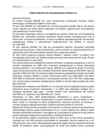 REMAK S.A. SA-R 2015 - Pismo Prezesa Załącznik 2 PISMO PREZESA DO AKCJONARIUSZY REMAK S.A. Szanowni Państwo, W imieniu Zarządu REMAK S.A. mam przyjemność przedstawić Państwu raport informujący o działalności Spółki w 2015 roku. W tym roku REMAK S.A. obchodził 45. rocznicę powstania Spółki. Był to rok dużych zmian, bowiem po wielu latach obecności na rynkach zagranicznych przenieśliśmy całą działalność na teren Polski. Na początku bieżącego stulecia a szczególnie po wejściu Polski do Unii Europejskiej REMAK S.A. realizował montaże wszystkich typów kotłów energetycznych tak w Polsce jak i w krajach europejskich, a naszą szczególną specjalizacją stały się montaże największych kotłów o parametrach nadkrytycznych dla bloków o mocach do 1100 MW. W tym zakresie REMAK S.A. stał się europejskim liderem. Wszystkie kontrakty wykonywał terminowo i dobrze jakościowo, mimo znanych na świecie problemów ze spawaniem stali T24 zastosowanej nowatorsko w tego typu kotłach. W roku 2014 programy budowy dużych bloków i spalarni śmieci w krajach Unii Europejskiej zakończyły się i Spółka zaczęła przenosić swą aktywność do kraju. Proces ten zakończyliśmy w roku 2015. Przy dużej konkurencji zdobyliśmy kolejne kontrakty w polskiej energetyce, w tym w ramach największej od 1989 roku inwestycji energetycznej w Polsce dotyczącej budowy bloków 5 i 6 w Elektrowni Opole. REMAK S.A. podpisał kontrakt na montaż części ciśnieniowej kotłów dla 2 bloków Elektrowni Opole każdy po 900 MW o łącznej wartości 128,8 mln PLN. W ramach projektu Kozienice podpisaliśmy kolejne kontrakty dotyczące montażu Pakietu 3 części ciśnieniowej kotła oraz elektrofiltru dla bloku 1075 MW w Elektrowni Kozienice o sumarycznej wartości 20,1 mln PLN, zwiększając tym samym łączną wysokość zaangażowania Spółki w ramach tego projektu do sumy 80,5 mln PLN. Doświadczenia zdobyte przez REMAK S.A. na rynkach Unii Europejskiej zostały w pełni docenione przez krajowych inwestorów, a w 2016 roku będziemy ubiegać się o następne kontrakty tego typu - montaż kotłów oraz elektrofiltrów dla bloków 910 MW w El. Jaworzno oraz 460 MW w El. Turów. Planowana w roku 2014 dywersyfikacja działalności o prace remontowe i modernizacyjne jak również inwestycyjne w innych branżach dała już efekt w roku 2015, kiedy to realizując te plany podpisaliśmy znaczący kontrakt na dostawy i montaż instalacji odpopielania dla El. Opole na wartość ponad 31 mln PLN. Wejście do Grupy Zarmen pozwoliło nam również na znaczne poszerzenie dotychczas oferowanego zakresu usług montażowych m.in. o prace elektryczne, AKPiA a także dostawy konstrukcji stalowych, rurociągów itp. Oczekujemy iż powinno to dać efekt w postaci dalszego zwiększenia przychodów w kolejnych okresach. Po przejściowym spadku przychodów Spółki w 2014 roku, w roku 2015 uzyskaliśmy znaczący bo o ok. 44% przyrost przychodów ze sprzedaży i jeszcze większy bo o ok. 53% przyrost zysku netto. Zdecydowanej poprawie uległa również sytuacja finansowa Spółki. W kolejnych latach w perspektywie do 2018 roku Spółka winna uzyskiwać REMAK S.A. SA-R 2015 - Pismo Prezesa Załącznik 2 coroczne zwiększenie przychodów, co pozwoli na dalszą poprawę sytuacji finansowej oraz na rozwój. Jak pokazują prezentowane Państwu wyniki finansowe, obrany przez nas kierunek działania przynosi zamierzone efekty. Na podstawie przeprowadzonej analizy przepływów środków pieniężnych, jak również struktury portfela zleceń, w tym znaczącego zaangażowania w sektorze energetycznym, z optymizmem patrzymy na kolejne lata. Nasze działania zostały zauważone i docenione przez akcjonariuszy i inwestorów, czego dowodem jest przyrost wartości akcji Spółki w roku 2015 o ponad 42%. Zachęcam Państwa do zapoznania się z raportem Spółki za 2015 rok, dziękując za okazane nam zaufanie. Z poważaniem Adam Rogala Prezes Zarządu REMAK S.A.
