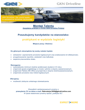 Montaż Talentu (bezpłatna praktyka w firmie GKN Driveline Polska) Poszukujemy kandydatów na stanowisko: praktykant w wydziale logistyki Miejsce pracy: Oleśnica Do głównych obowiązków tej osoby należeć będzie: • wdrażanie i usprawnianie procesów logistycznych oraz analizowanie ich efektywności, • przygotowywanie raportów, zestawień oraz kalkulacji, • wsparcie pracowników działu. Wymagania: • wykształcenie minimum średnie (preferowani studenci 2-5 roku), • znajomość języka angielskiego w mowie i piśmie w stopniu zaawansowanym, • znajomość Pakietu MS Office przynajmniej w stopniu średniozaawansowanym, • znajomość procesów oraz metod logistycznych. Oferujemy: • możliwość zdobycia unikalnego doświadczenia. Wszystkich zainteresowanych prosimy o przesyłanie CV na adres e-mail: [email protected] W tytule wiadomości prosimy wpisać „praktyka SC”.
