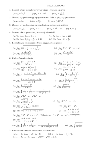 CIĄGI LICZBOWE 1. Napisać cztery początkowe wyrazy ciągu o wyrazie ogólnym (a) an = 3n−2 2n (b) bn = 4 − n2 (c) cn = n!−1 2n2 +3 2. Zbadać, czy podane ciągi są ograniczone z dołu, z góry, są ograniczone (a) an = 2n (b) bn = n+1 n (c) cn = (−1)n n! 3. Zbadać, czy podane ciągi są monotoniczne od pewnego miejsca (a) an = n 2n+1 (b) bn = 1 + 1 n (c) cn = n2 − 5n n 2n (d) dn = 4. Zaznacz zdania prawdziwe, uzasadnij odpowiedź (a) ∃N ∀n>N | n14 − 1| < 12 , (b) ∃N ∀n>N | n21+1 − 1 | n2 < 0, 01, (c) ∃N ∀n>N ln n > 999, √ (d) ∃N ∀n>N n n < 21 , 5. Korzystając z twierdzenia o trzech ciągach oblicz granice s (a) lim n 1+ n→∞ 1 1 + ... + , 3 2n + 1 (b) lim p n n→∞ 13 + 23 + ... + n3 , n2 + cos(n!) . n→∞ n3 n · sin(n2 ) , n→∞ n2 + cos(n) (d) lim (c) lim 6. Obliczyć granice ciągów (2n − 1)(n2 + 3) , n→∞ 3n3 + 5 (n) lim n( 13 n + 1)(n + 2) , n→∞ (2n2 − 4)(n + 3) (o) lim (a) lim (b) lim 1 + 4 + 7 + ... + (3n − 2) (c) lim n · , n→∞ n3 + 1 1 − 2 + 3 − 4 + ... − 2n √ (d) lim n→∞ n2 + 1 2 · 3n+2 + 5n n→∞ 2n + 5n+3 ! 1 1 1 (f) lim + + ... + , n→∞ 1 · 2 2·3 n · (n + 1) (e) lim p (j) lim p n (k) lim p n n→∞ n→∞ 1 2 1 3 1 4 1 9 (3n+1 + + 1 2n 1 3n + ... + + ... + , 5n · − 2) , n+1 n→∞ (5 − 1) · 3n 2 1+ 2 n +2 (p) lim n→∞ !n , !3n (r) lim n→∞ 2n − 1 −1 n+1 , 4log2 (n) , n→∞ 8log2 (n+1) (s) lim p 2n2 + n − 2n2 − n, n→∞ √ n2 + 5 − n (h) lim √ , n→∞ n2 + 2 − n 2n + 1 (i) lim 3 sin(5n!), n→∞ n + 2n + 1 (g) lim 2+ n→∞ 1 + p 3 (u) lim n( n3 + n − n), n→∞ √ n (w) lim n→∞ 2 · 3n + 4 · 7n + 9 · 5n+1 , (x) lim n→∞ 5n − 2n , (n + 1)! − n! , (n + 1)! + n! 12 + 22 + ... + n2 , Wskazówka: 12 + 22 + ... + n2 = n(n+1)(2n+1) , 6 2n+2 + n2 + 3n+3 , n→∞ 2n + n + 3 n (l) lim s ! (m) lim n→∞ 4 4 4 + + ... + , 2 · 6 6 · 10 (4n − 2) · (4n + 2) 7. Oblicz granice ciągów określonych rekurencyjnie √ (a) a1 = 23 , an+1 = 3 · an − 2, (b) a1 = 1, an+1 = √ √ (c) a1 = 1, a2 = 2, an+1 = an−1 + an , n ≥ 2. (z) lim n→∞ 1 an + an 2 , n n2 1 . + 4n 8. Wskazać podciągi zbieżne (a) an = −2 + 2 · (−1)n , (c) an = reszta z dzielenia n przez 5.