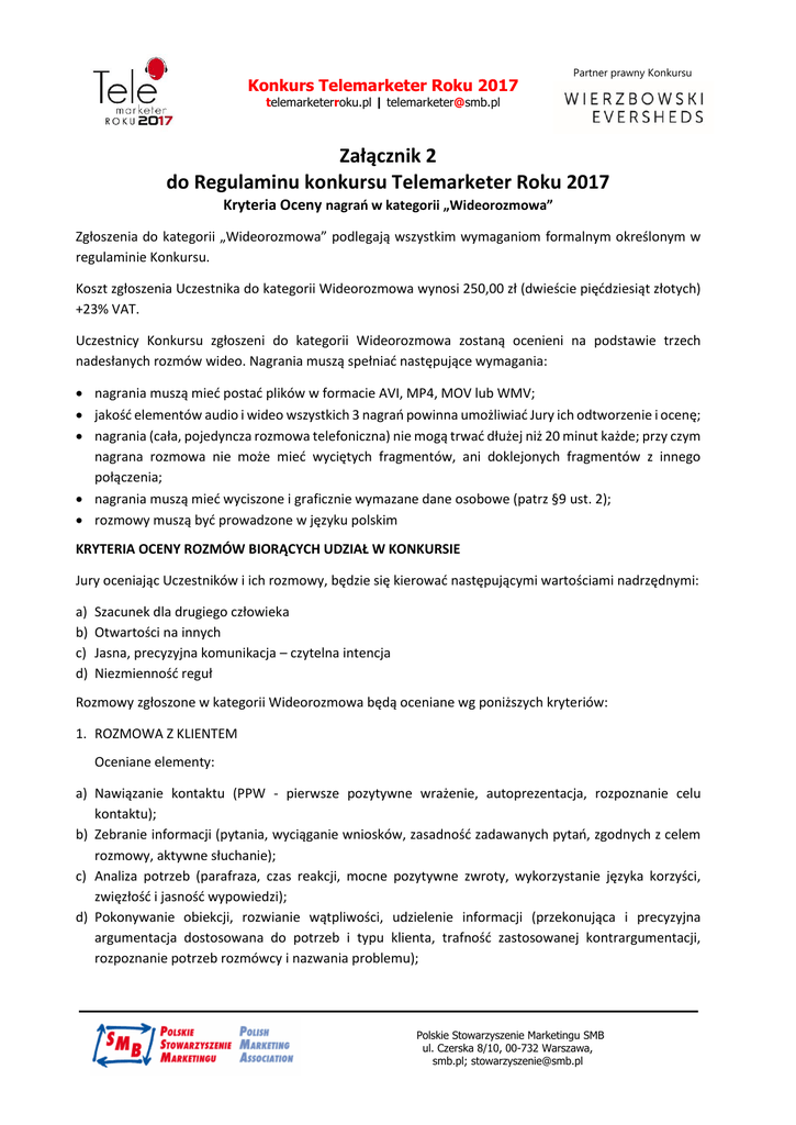 Konkurs Telemarketer Roku 2017 Partner prawny Konkursu telemarketerroku.pl | [email protected] Załącznik 2 do Regulaminu konkursu Telemarketer Roku 2017 Kryteria Oceny nagrań w kategorii „Wideorozmowa” Zgłoszenia do kategorii „Wideorozmowa” podlegają wszystkim wymaganiom formalnym określonym w regulaminie Konkursu. Koszt zgłoszenia Uczestnika do kategorii Wideorozmowa wynosi 250,00 zł (dwieście pięćdziesiąt złotych) +23% VAT. Uczestnicy Konkursu zgłoszeni do kategorii Wideorozmowa zostaną ocenieni na podstawie trzech nadesłanych rozmów wideo. Nagrania muszą spełniać następujące wymagania: nagrania muszą mieć postać plików w formacie AVI, MP4, MOV lub WMV; jakość elementów audio i wideo wszystkich 3 nagrań powinna umożliwiać Jury ich odtworzenie i ocenę; nagrania (cała, pojedyncza rozmowa telefoniczna) nie mogą trwać dłużej niż 20 minut każde; przy czym nagrana rozmowa nie może mieć wyciętych fragmentów, ani doklejonych fragmentów z innego połączenia; nagrania muszą mieć wyciszone i graficznie wymazane dane osobowe (patrz §9 ust. 2); rozmowy muszą być prowadzone w języku polskim KRYTERIA OCENY ROZMÓW BIORĄCYCH UDZIAŁ W KONKURSIE Jury oceniając Uczestników i ich rozmowy, będzie się kierować następującymi wartościami nadrzędnymi: a) b) c) d) Szacunek dla drugiego człowieka Otwartości na innych Jasna, precyzyjna komunikacja – czytelna intencja Niezmienność reguł Rozmowy zgłoszone w kategorii Wideorozmowa będą oceniane wg poniższych kryteriów: 1. ROZMOWA Z KLIENTEM Oceniane elementy: a) Nawiązanie kontaktu (PPW - pierwsze pozytywne wrażenie, autoprezentacja, rozpoznanie celu kontaktu); b) Zebranie informacji (pytania, wyciąganie wniosków, zasadność zadawanych pytań, zgodnych z celem rozmowy, aktywne słuchanie); c) Analiza potrzeb (parafraza, czas reakcji, mocne pozytywne zwroty, wykorzystanie języka korzyści, zwięzłość i jasność wypowiedzi); d) Pokonywanie obiekcji, rozwianie wątpliwości, udzielenie informacji (przekonująca i precyzyjna argumentacja dostosowana do potrzeb i typu klienta, trafność zastosowanej kontrargumentacji, rozpoznanie potrzeb rozmówcy i nazwania problemu); Polskie Stowarzyszenie Marketingu SMB ul. Czerska 8/10, 00-732 Warszawa, smb.pl; [email protected] Konkurs Telemarketer Roku 2017 Partner prawny Konkursu telemarketerroku.pl | [email protected] e) Finalizacja rozmowy (zarządzanie czasem rozmowy, podsumowanie rozmowy, potwierdzenie uzgodnionego z rozmówcą rozwiązania, potwierdzenie warunków i realizacji zgłoszenia, zaproszenie do ponownego kontaktu, KPW – końcowe pozytywne wrażenie). 2. SKUTECZNOŚĆ PODJĘTYCH DZIAŁAŃ PODCZAS ROZMOWY Oceniane elementy: a) b) c) d) Narzędzia kontroli rozmowy (zastosowanie w rozmowie); Język korzyści (zastosowanie w rozmowie); Jakość kontrargumentacji (trafność formułowanych argumentów); Dostosowanie do rozmówcy (jasność formułowanych komunikatów, dostosowanie tempa, tonu, rozpoznanie typu klienta i motywacji do podjęcia zakupu); e) Budowanie relacji pomiędzy konsultantem a rozmówcą (klimat rozmowy); f) Postawa marketingowa (aktywna identyfikacja potrzeb klienta, budowanie pozytywnego wizerunku reprezentowanej firmy, zarządzanie czasem i przebiegiem rozmowy). 3. PRACA GŁOSEM Oceniane elementy: a) Dynamika wypowiedzi (zaangażowanie, entuzjazm, tempo); b) Język wypowiedzi (standardy gramatyczne, porządek logiczny, łatwość w przekazywaniu informacji, zwroty grzecznościowe); c) Głos (dykcja, intonacja, modulacja głosu, akcentowanie). 4. PRACA OBRAZEM Oceniane elementy a) Estetyka (wygląd, ubiór, spójność wizualna) b) Mowa ciała (postawa, zgodność z komunikacją głosową) c) Wykorzystanie zalet komunikacji wideo Polskie Stowarzyszenie Marketingu SMB ul. Czerska 8/10, 00-732 Warszawa, smb.pl; [email protected]