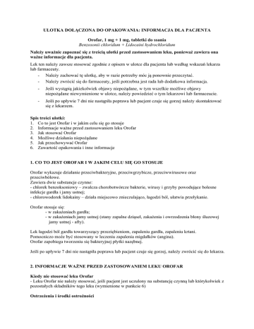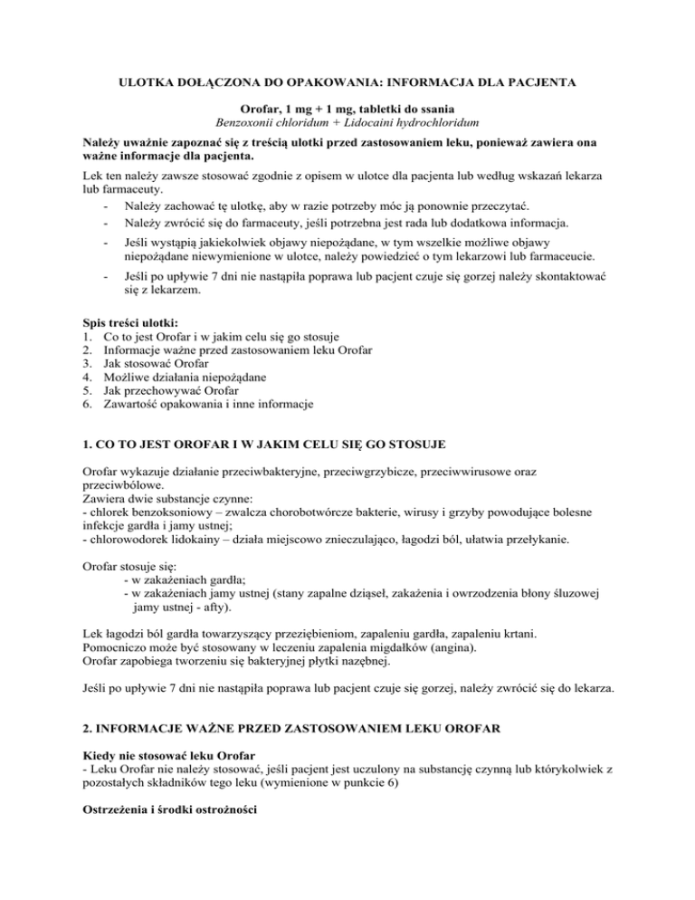 ULOTKA DOŁĄCZONA DO OPAKOWANIA: INFORMACJA DLA PACJENTA Orofar, 1 mg + 1 mg, tabletki do ssania Benzoxonii chloridum + Lidocaini hydrochloridum Należy uważnie zapoznać się z treścią ulotki przed zastosowaniem leku, ponieważ zawiera ona ważne informacje dla pacjenta. Lek ten należy zawsze stosować zgodnie z opisem w ulotce dla pacjenta lub według wskazań lekarza lub farmaceuty. - Należy zachować tę ulotkę, aby w razie potrzeby móc ją ponownie przeczytać. - Należy zwrócić się do farmaceuty, jeśli potrzebna jest rada lub dodatkowa informacja. - Jeśli wystąpią jakiekolwiek objawy niepożądane, w tym wszelkie możliwe objawy niepożądane niewymienione w ulotce, należy powiedzieć o tym lekarzowi lub farmaceucie. - Jeśli po upływie 7 dni nie nastąpiła poprawa lub pacjent czuje się gorzej należy skontaktować się z lekarzem. Spis treści ulotki: 1. Co to jest Orofar i w jakim celu się go stosuje 2. Informacje ważne przed zastosowaniem leku Orofar 3. Jak stosować Orofar 4. Możliwe działania niepożądane 5. Jak przechowywać Orofar 6. Zawartość opakowania i inne informacje 1. CO TO JEST OROFAR I W JAKIM CELU SIĘ GO STOSUJE Orofar wykazuje działanie przeciwbakteryjne, przeciwgrzybicze, przeciwwirusowe oraz przeciwbólowe. Zawiera dwie substancje czynne: - chlorek benzoksoniowy – zwalcza chorobotwórcze bakterie, wirusy i grzyby powodujące bolesne infekcje gardła i jamy ustnej; - chlorowodorek lidokainy – działa miejscowo znieczulająco, łagodzi ból, ułatwia przełykanie. Orofar stosuje się: - w zakażeniach gardła; - w zakażeniach jamy ustnej (stany zapalne dziąseł, zakażenia i owrzodzenia błony śluzowej jamy ustnej - afty). Lek łagodzi ból gardła towarzyszący przeziębieniom, zapaleniu gardła, zapaleniu krtani. Pomocniczo może być stosowany w leczeniu zapalenia migdałków (angina). Orofar zapobiega tworzeniu się bakteryjnej płytki nazębnej. Jeśli po upływie 7 dni nie nastąpiła poprawa lub pacjent czuje się gorzej, należy zwrócić się do lekarza. 2. INFORMACJE WAŻNE PRZED ZASTOSOWANIEM LEKU OROFAR Kiedy nie stosować leku Orofar - Leku Orofar nie należy stosować, jeśli pacjent jest uczulony na substancję czynną lub którykolwiek z pozostałych składników tego leku (wymienione w punkcie 6) Ostrzeżenia i środki ostrożności - W przypadku, gdy bólowi gardła towarzyszy wysoka gorączka lub ból utrzymuje się dłużej niż jeden tydzień, należy zwrócić się po poradę do lekarza. - W przypadku, gdy lek stosuje się dłużej niż dwa tygodnie, możliwe jest wystąpienie odwracalnego, brązowego zabarwienia języka lub zębów. Przebarwienia te mają charakter przejściowy i ustępują po zaprzestaniu stosowania leku. - Nie stosować u osób z tendencją do zachłystywania, zwłaszcza u osób w wieku powyżej 60 lat. Dzieci Leku Orofar nie należy stosować u dzieci w wieku poniżej 6 lat. Inne leki i Orofar Należy powiedzieć lekarzowi lub farmaceucie o wszystkich lekach przyjmowanych obecnie lub ostatnio a także o lekach, które pacjent planuje przyjmować. Orofar z jedzeniem i piciem: Leki miejscowo znieczulające mogą powodować przemijające zaburzenia połykania i zwiększać ryzyko zachłyśnięcia. Z tego powodu nie należy stosować leku Orofar bezpośrednio przed lub w trakcie jedzenia Ciąża i karmienie piersią W okresie ciąży i karmienia piersią lub gdy istnieje podejrzenie, że kobieta jest w ciąży, lub gdy planuje ciążę, przed zastosowaniem tego leku należy poradzić się lekarza lub farmaceuty. Orofar może być stosowany przez kobiety w ciąży wyłącznie na zlecenie lekarza. Leku Orofar nie należy stosować u kobiet karmiących piersią. Prowadzenie pojazdów i obsługiwanie maszyn Orofar nie ma wpływu na zdolność prowadzenia pojazdów i obsługiwania maszyn. Lek Orofar zawiera sacharynę i sorbitol Jeżeli stwierdzono wcześniej nietolerancję niektórych cukrów, należy skontaktować się z lekarzem przed zastosowaniem leku. 3. JAK STOSOWAĆ OROFAR Ten lek należy zawsze stosować zgodnie z opisem w ulotce dla pacjenta lub według wskazań lekarza lub farmaceuty. W razie wątpliwości należy zwrócić się do lekarza lub farmaceuty. Jedną tabletkę należy ssać powoli co dwie – trzy godziny. W przypadku nasilonej infekcji dawkę można zwiększyć do jednej tabletki co jedną lub dwie godziny. Nie należy stosować więcej niż dziesięć tabletek w ciągu doby. W przypadku leczenia aft, należy pozwolić tabletce rozpuszczać się powoli w pobliżu miejsca zmienionego chorobowo. Stosowanie u dzieci Dzieci powyżej 6 lat nie powinny przyjmować więcej niż sześć tabletek w ciągu doby. Nie należy stosować leku Orofar u dzieci w wieku poniżej 6 lat, gdyż leki miejscowo znieczulające mogą powodować przemijające zaburzenia połykania i zwiększać ryzyko zachłyśnięcia. Nie należy stosować leku Orofar bezpośrednio przed ani w trakcie jedzenia. Nie należy stosować leku Orofar dłużej niż 7 dni bez porozumienia z lekarzem. 2 Zastosowanie większej niż zalecana dawki leku Orofar W przypadku zastosowania większej niż zalecana liczby tabletek Orofar należy niezwłocznie porozumieć się lekarzem lub farmaceutą. Pominięcie zastosowania leku Orofar Nie należy stosować dawki podwójnej w celu uzupełnienia pominiętej dawki. W razie wątpliwości związanych ze stosowaniem leku należy zwrócić się do lekarza lub farmaceuty. 4. MOŻLIWE DZIAŁANIA NIEPOŻĄDANE Jak każdy lek, lek ten może powodować działania niepożądane, chociaż nie u każdego one wystąpią. Niekiedy może dojść do przemijającego, miejscowego podrażnienia. W rzadkich przypadkach pojawić się mogą reakcje alergiczne w postaci wysypki skórnej, obrzęku jamy ustnej lub krtani. Należy wówczas przerwać stosowanie leku Orofar i natychmiast zgłosić się do lekarza. Jeśli wystąpią jakiekolwiek objawy niepożądane, w tym wszelkie możliwe objawy niepożądane