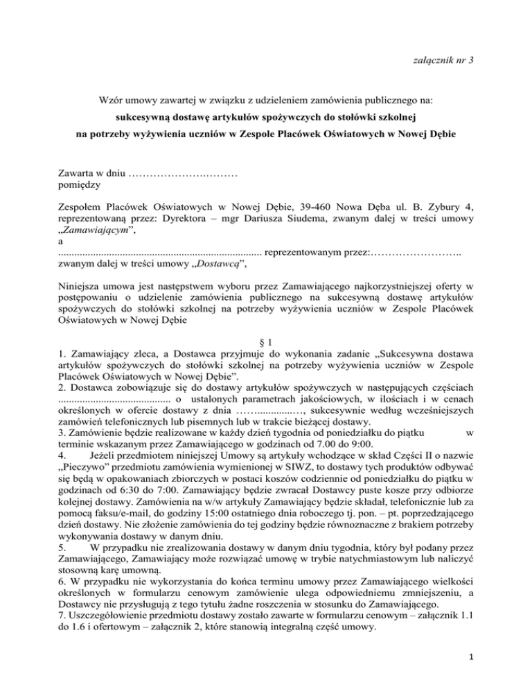 załącznik nr 3 Wzór umowy zawartej w związku z udzieleniem zamówienia publicznego na: sukcesywną dostawę artykułów spożywczych do stołówki szkolnej na potrzeby wyżywienia uczniów w Zespole Placówek Oświatowych w Nowej Dębie Zawarta w dniu ………………….……… pomiędzy Zespołem Placówek Oświatowych w Nowej Dębie, 39-460 Nowa Dęba ul. B. Zybury 4, reprezentowaną przez: Dyrektora – mgr Dariusza Siudema, zwanym dalej w treści umowy „Zamawiającym”, a ............................................................................ reprezentowanym przez:…………………….. zwanym dalej w treści umowy „Dostawcą”, Niniejsza umowa jest następstwem wyboru przez Zamawiającego najkorzystniejszej oferty w postępowaniu o udzielenie zamówienia publicznego na sukcesywną dostawę artykułów spożywczych do stołówki szkolnej na potrzeby wyżywienia uczniów w Zespole Placówek Oświatowych w Nowej Dębie §1 1. Zamawiający zleca, a Dostawca przyjmuje do wykonania zadanie „Sukcesywna dostawa artykułów spożywczych do stołówki szkolnej na potrzeby wyżywienia uczniów w Zespole Placówek Oświatowych w Nowej Dębie”. 2. Dostawca zobowiązuje się do dostawy artykułów spożywczych w następujących częściach .......................................... o ustalonych parametrach jakościowych, w ilościach i w cenach określonych w ofercie dostawy z dnia …….............…, sukcesywnie według wcześniejszych zamówień telefonicznych lub pisemnych lub w trakcie bieżącej dostawy. 3. Zamówienie będzie realizowane w każdy dzień tygodnia od poniedziałku do piątku w terminie wskazanym przez Zamawiającego w godzinach od 7.00 do 9:00. 4. Jeżeli przedmiotem niniejszej Umowy są artykuły wchodzące w skład Części II o nazwie „Pieczywo” przedmiotu zamówienia wymienionej w SIWZ, to dostawy tych produktów odbywać się będą w opakowaniach zbiorczych w postaci koszów codziennie od poniedziałku do piątku w godzinach od 6:30 do 7:00. Zamawiający będzie zwracał Dostawcy puste kosze przy odbiorze kolejnej dostawy. Zamówienia na w/w artykuły Zamawiający będzie składał, telefonicznie lub za pomocą faksu/e-mail, do godziny 15:00 ostatniego dnia roboczego tj. pon. – pt. poprzedzającego dzień dostawy. Nie złożenie zamówienia do tej godziny będzie równoznaczne z brakiem potrzeby wykonywania dostawy w danym dniu. 5. W przypadku nie zrealizowania dostawy w danym dniu tygodnia, który był podany przez Zamawiającego, Zamawiający może rozwiązać umowę w trybie natychmiastowym lub naliczyć stosowną karę umowną. 6. W przypadku nie wykorzystania do końca terminu umowy przez Zamawiającego wielkości określonych w formularzu cenowym zamówienie ulega odpowiedniemu zmniejszeniu, a Dostawcy nie przysługują z tego tytułu żadne roszczenia w stosunku do Zamawiającego. 7. Uszczegółowienie przedmiotu dostawy zostało zawarte w formularzu cenowym – załącznik 1.1 do 1.6 i ofertowym – załącznik 2, które stanowią integralną część umowy. 1 8. Stosownie do potrzeb Zamawiającego, strony dopuszczają możliwość zmian ilościowych poszczególnych artykułów spożywczych (zwiększenie, zmniejszenie), w przypadku zmiany liczby uczniów, uprawnionych do korzystania ze stołówki. 9. Planowana ilość zakupu artykułów spożywczych, w okresie trwania umowy ustalona została formularzu cenowym. §2 1. Dostawy będą realizowane sukcesywnie - w oparciu o zamówienia składane telefonicznie lub pisemnie lub w czasie bieżącej dostawy, w ilości podanej przez Zamawiającego i w terminie podanym przez Zamawiającego. 2. Jako zasadę przyjmuje się, iż dostawa zamówionej partii będzie realizowana w godzinach od 7:00 do 9:00, w każdy dzień tygodnia od poniedziałku do piątku. Odbioru dokonuje upoważniona osoba. 3. Dostawy będą realizowane na koszt Dostawcy. 4. Dostawca niezwłocznie zawiadamia Zamawiającego o braku możliwości zrealizowania dostawy w określonym terminie. 5. Dostawca dostarczy towar własnym środkiem transportu, specjalistycznym lub przystosowanym do transportu zgodnie z obowiązującymi przepisami prawa i na własny koszt i ryzyko do Zamawiającego, w czasie wskazanym przez Zamawiającego i do miejsca wskazanego przez Zamawiającego. 6. W/w artykuły powinny odpowiadać obowiązującym normom technicznym, sanitarnym i smakowym oraz PN jakościowej. Ocena ich jakości należy do Zamawiającego. Może on odmówić przyjęcia towaru, jeżeli nie spełniają wymogów określonych umową. 7. W/w artykuły powinny być zgodne z Rozporządzeniem ministra zdrowia z dnia 26 sierpnia 2015 r. w sprawie grup środków spożywczych przeznaczonych do sprzedaży dzieciom i młodzieży w jednostkach systemu oświaty oraz wymagań, jakie muszą spełniać środki spożywcze stosowane w ramach żywienia zbiorowego dzieci i młodzieży w tych jednostkach (Dz.U. 2015 poz. 1256) 8. Dostawca gwarantuje, że ceny nie ulegną podwyższeniu w trakcie realizacji umowy. 9. Zamawiający zastrzega sobie prawo żądania aktualnych dokumentów potwierdzających spełnianie warunków sanitarno-epidemiologicznych związanych z prawidłową realizacją przedmiotu zamówienia. Dostawca oświadcza, iż niezwłocznie okaże je Zamawiającemu. Uchylenie od tego obowiązku uznawane będzie przez strony jako nienależyte wykonanie umowy i może skutkować rozwiązaniem jej ze skutkiem natychmiastowym. §3 1. Dostawca zobowiązuje się dostarczać Zamawiającemu towar w ilości odpowiadającej zamówieniu, o jakości wskazanej w SIWZ. 2. Zamawiający zobowiązuje się niezwłocznie przy odbiorze zamówionej partii towaru sprawdzić jego ilość i stan. 3. Jeżeli w wyniku sprawdzenia ilości i stanu Zamawiający wnosi zastrzeżenia w zakresie określonym w ust. 2, niezwłocznie zawiadamia o tym Dostawcę, a jeżeli wada została ujawniona w obecności przedstawiciela Dostawcy, umieszcza odpowiednią adnotację na fakturze. 