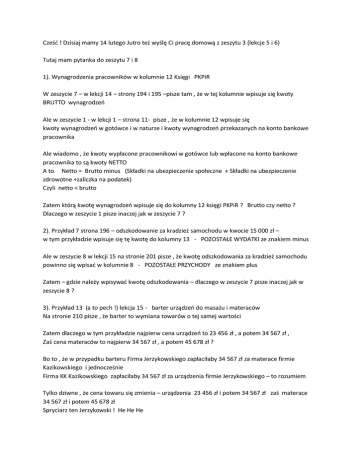 Cześd ! Dzisiaj mamy 14 lutego Jutro też wyślę Ci pracę domową z zeszytu 3 (lekcje 5 i 6) Tutaj mam pytanka do zeszytu 7 i 8 1). Wynagrodzenia pracowników w kolumnie 12 Księgi PKPiR W zeszycie 7 – w lekcji 14 – strony 194 i 195 –pisze tam , że w tej kolumnie wpisuje się kwoty BRUTTO wynagrodzeo Ale w zeszycie 1 - w lekcji 1 – strona 11- pisze , że w kolumnie 12 wpisuje się kwoty wynagrodzeo w gotówce i w naturze i kwoty wynagrodzeo przekazanych na konto bankowe pracownika Ale wiadomo , że kwoty wypłacone pracownikowi w gotówce lub wpłacone na konto bankowe pracownika to są kwoty NETTO A to Netto = Brutto minus (Składki na ubezpieczenie społeczne + Składki na ubezpieczenie zdrowotne +zaliczka na podatek) Czyli netto < brutto Zatem którą kwotę wynagrodzeo wpisuje się do kolumny 12 księgi PKPiR ? Brutto czy netto ? Dlaczego w zeszycie 1 pisze inaczej jak w zeszycie 7 ? 2). Przykład 7 strona 196 – odszkodowanie za kradzież samochodu w kwocie 15 000 zł – w tym przykładzie wpisuje się tę kwotę do kolumny 13 - POZOSTAŁE WYDATKI ze znakiem minus Ale w zeszycie 8 w lekcji 15 na stronie 201 pisze , że kwotę odszkodowania za kradzież samochodu powinno się wpisad w kolumnie 8 - POZOSTAŁE PRZYCHODY ze znakiem plus Zatem – gdzie należy wpisywad kwotę odszkodowania – dlaczego w zeszycie 7 pisze inaczej jak w zeszycie 8 ? 3). Przykład 13 (a to pech !) lekcja 15 - barter urządzeo do masażu i materaców Na stronie 210 pisze , że barter to wymiana towarów o tej samej wartości Zatem dlaczego w tym przykładzie najpierw cena urządzeo to 23 456 zł , a potem 34 567 zł , Zaś cena materaców to najpierw 34 567 zł , a potem 45 678 zł ? Bo to , że w przypadku barteru Firma Jerzykowskiego zapłaciłaby 34 567 zł za materace firmie Kazikowskiego i jednocześnie Firma KK Kazikowskiego zapłaciłaby 34 567 zł za urządzenia firmie Jerzykowskiego – to rozumiem Tylko dziwne , że cena towaru się zmienia – urządzenia 23 456 zł i potem 34 567 zł zaś materace 34 567 zł i potem 45 678 zł Spryciarz ten Jerzykowski ! He He He 4). Lekcja 15 strona 212 - pokrycie roszczeo towarem Co w sytuacji , gdy wartośd towaru nie pokrywa w pełni kwoty roszczeo i jednocześnie dłużnik nie ma innych towarów , którymi pokryłby dług i jednocześnie nie ma forsy (gotówka lub w banku)– przez co pokryje tylko częśd długu ? Jak mógłby pokryd pozostałą częśd długu , gdy nie ma innych towarów na pokrycie długu i nie ma forsy (gotówka lub w banku) ? Co mógłby w tej sytuacji zrobid ? 5). Lekcja 15 strona 215 – Kompensata Wzajemna kompensata przypomina trochę umowy barterowe Wracając do przykładu barteru urządzeo i materaców – zobowiązanie 34 567 zł za materace kompensuje się tu zobowiązaniem 34 567 zł za urządzenia. A czy są jakieś różnice pomiędzy barterem a wzajemną kompensatą ? Na stronie 215 pisze , że w przypadku sporu przed organami podatkowymi umowa wzajemnej kompensaty stanowi dowód zapłaty Czy umowa barterowa też może stanowid dowód wpłaty w takim sporze ? Czy organ podatkowy traktuje umowę barterową i umowę wzajemnej kompensaty tak samo czy inaczej ? 6). Lekcja 16 strony 216 i 217 – przykład 1 Raz podstawa obliczenia zaliczki to 93 000 zł (bez uwzględnienia różnicy remanentu) a raz 14 000 zł (z uwzględnieniem różnicy remanentu) Jest tutaj duża różnica pomiędzy tymi dwoma wartościami Czy organ podatkowy mógłby nałożyd karę skarbową na podatnika , który wybierze wariant korzystniejszy ? A czy są może jakieś wartości graniczne różnicy remanentów K (w kwocie x ) ustalone przez ustawę albo organ podatkowy ? Poniżej której (gdy nasza kwota k < X ) nie trzeba uwzględniad różnicy remanentów w obliczaniu zaliczki na podatek ? Powyżej której (gdy nasza kwota K > X) trzeba uwzględnid różnicę remanentów w obliczaniu zaliczki na podatek ? 7). Lekcja 16 strona 221 – przykład 4 – skąd się wzięły wymienione kwoty od stycznia do grudnia (od 30 000 zł w styczniu do 10 000 zł w grudniu) ? Apropos – miłych Walentynek ! Może dostałaś jakąś Walentynkę ? Bo ja żadnej. A dla Ciebie – spójrz niżej